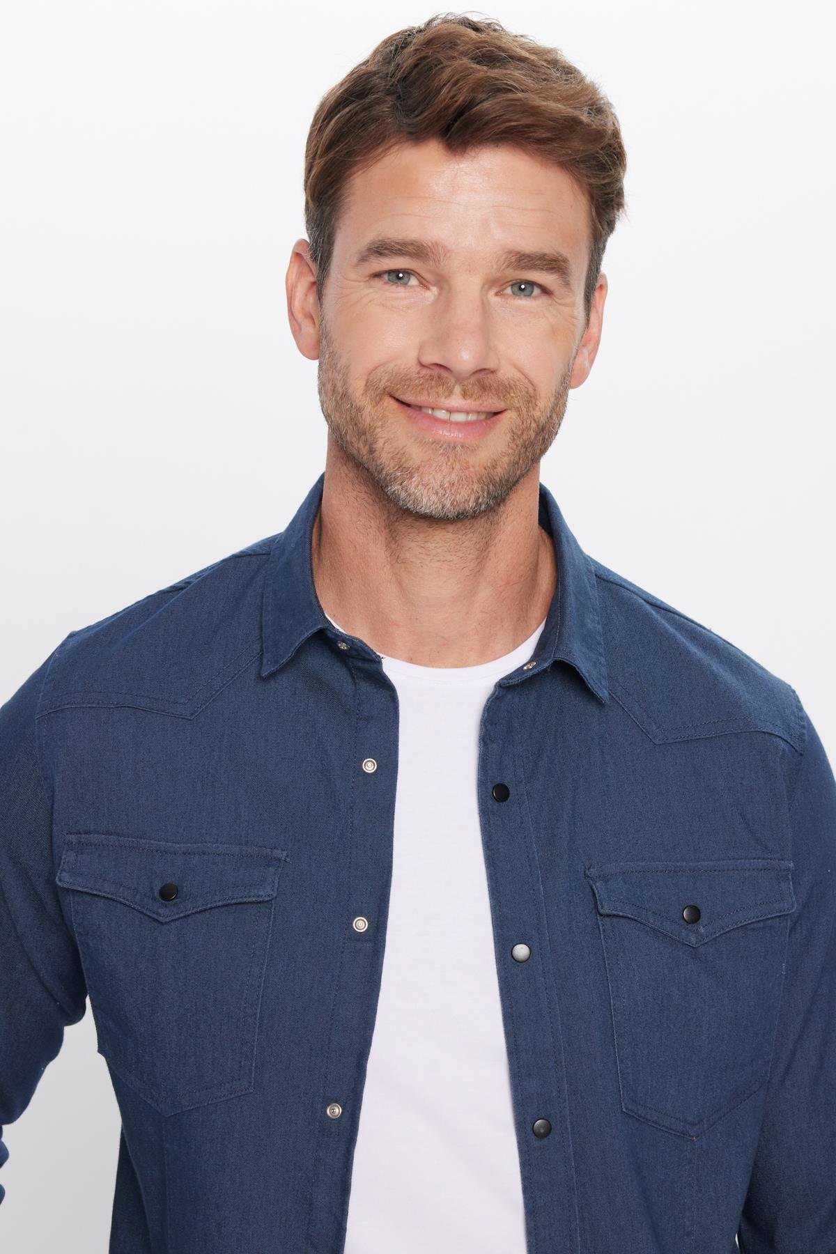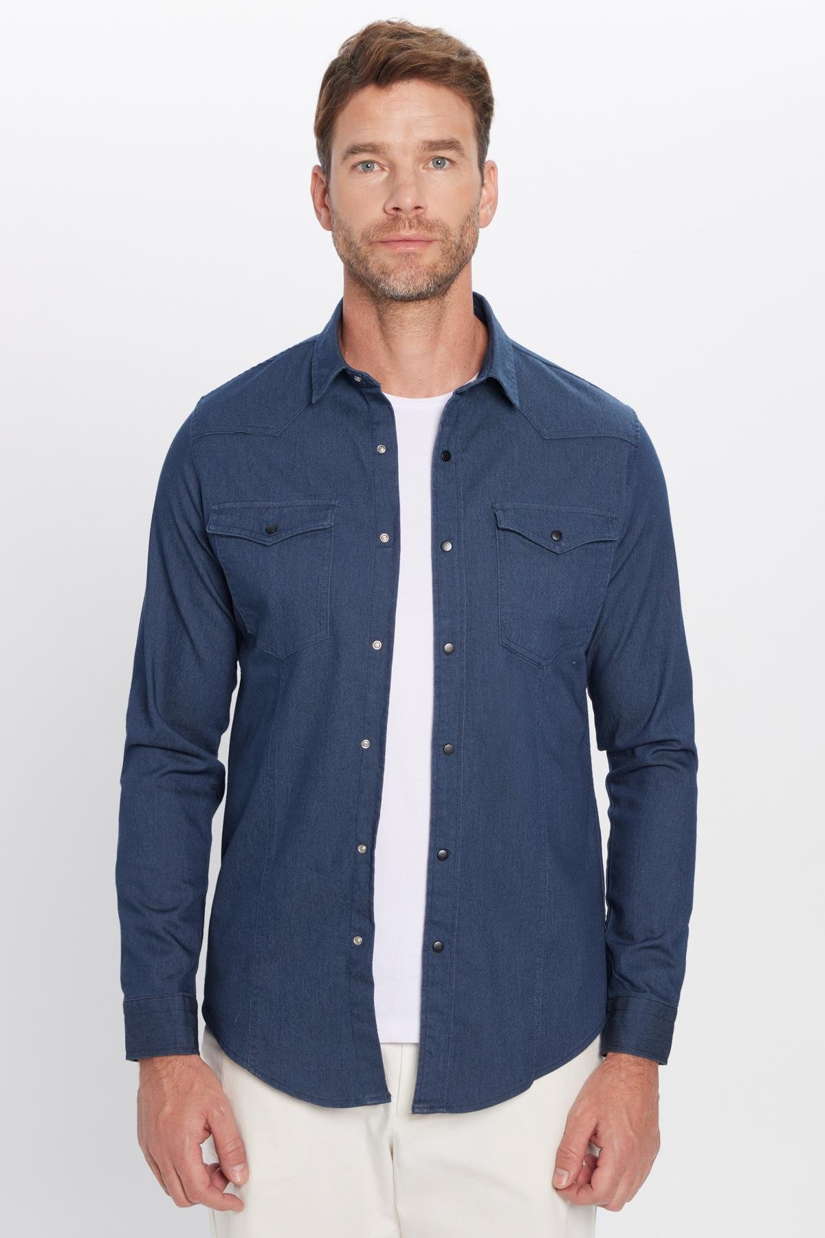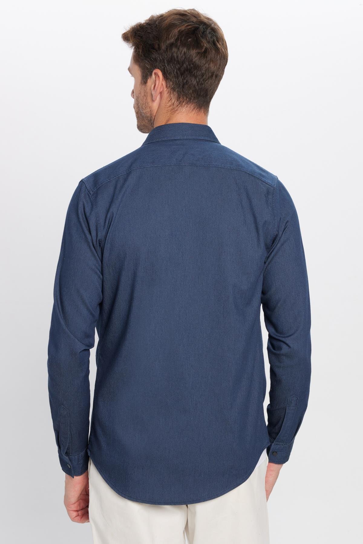 Erkek Slim Fit Dar Kesim Çift Cepli Denim Kot Lacivert Gömlek