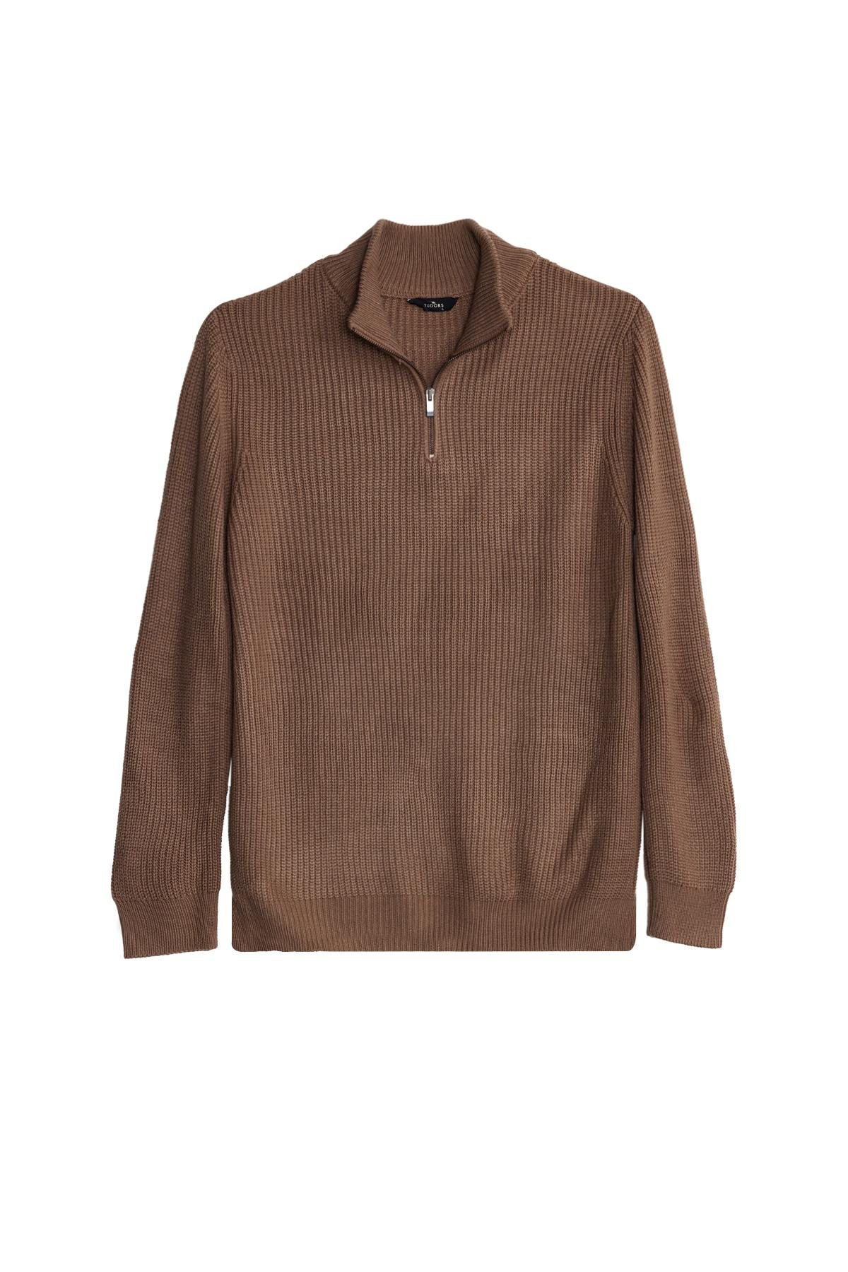 Erkek Slim Fit Dar Kesim Fermuarlı Koyu Vizon Dik Yaka Triko Kazak