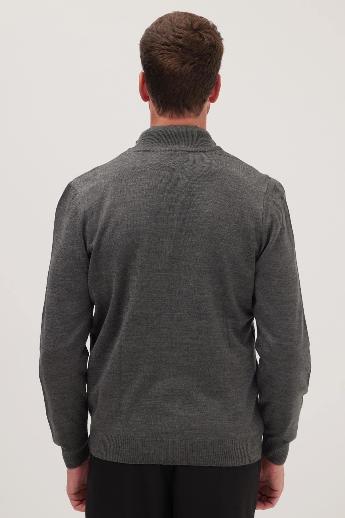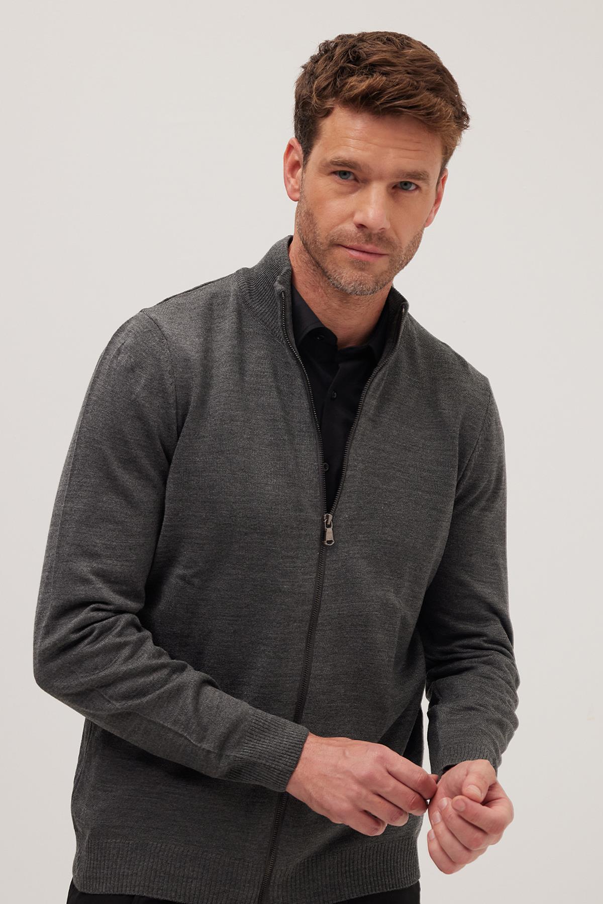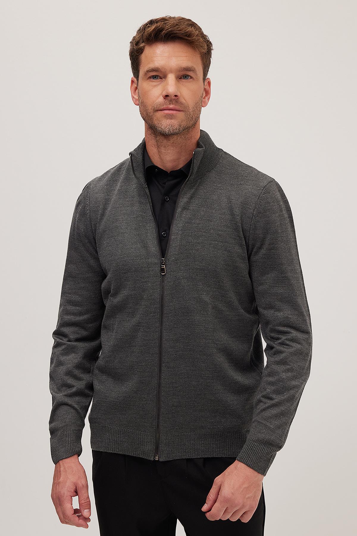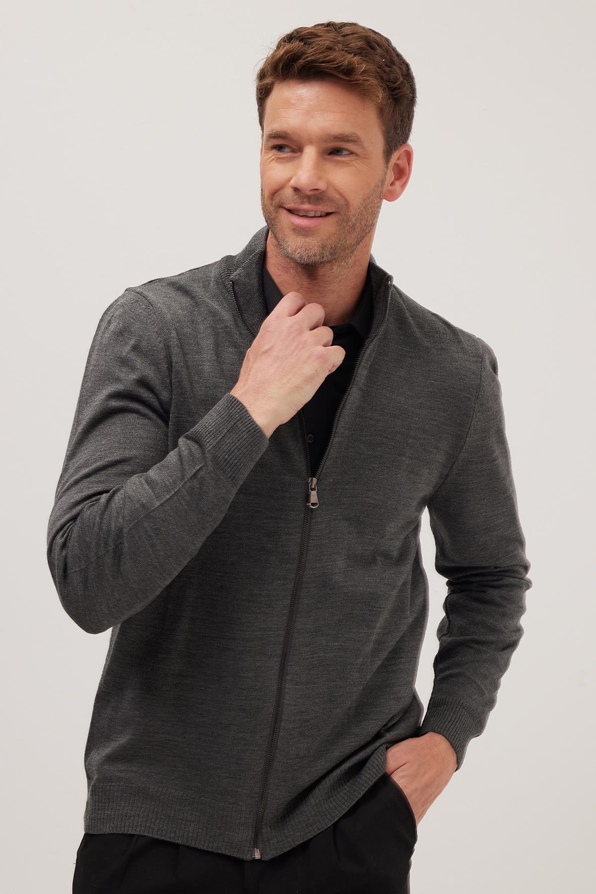 Erkek Slim Fit Dar Kesim Gri Dik Yaka Fermuarlı Düz Hırka (HR250001-79)