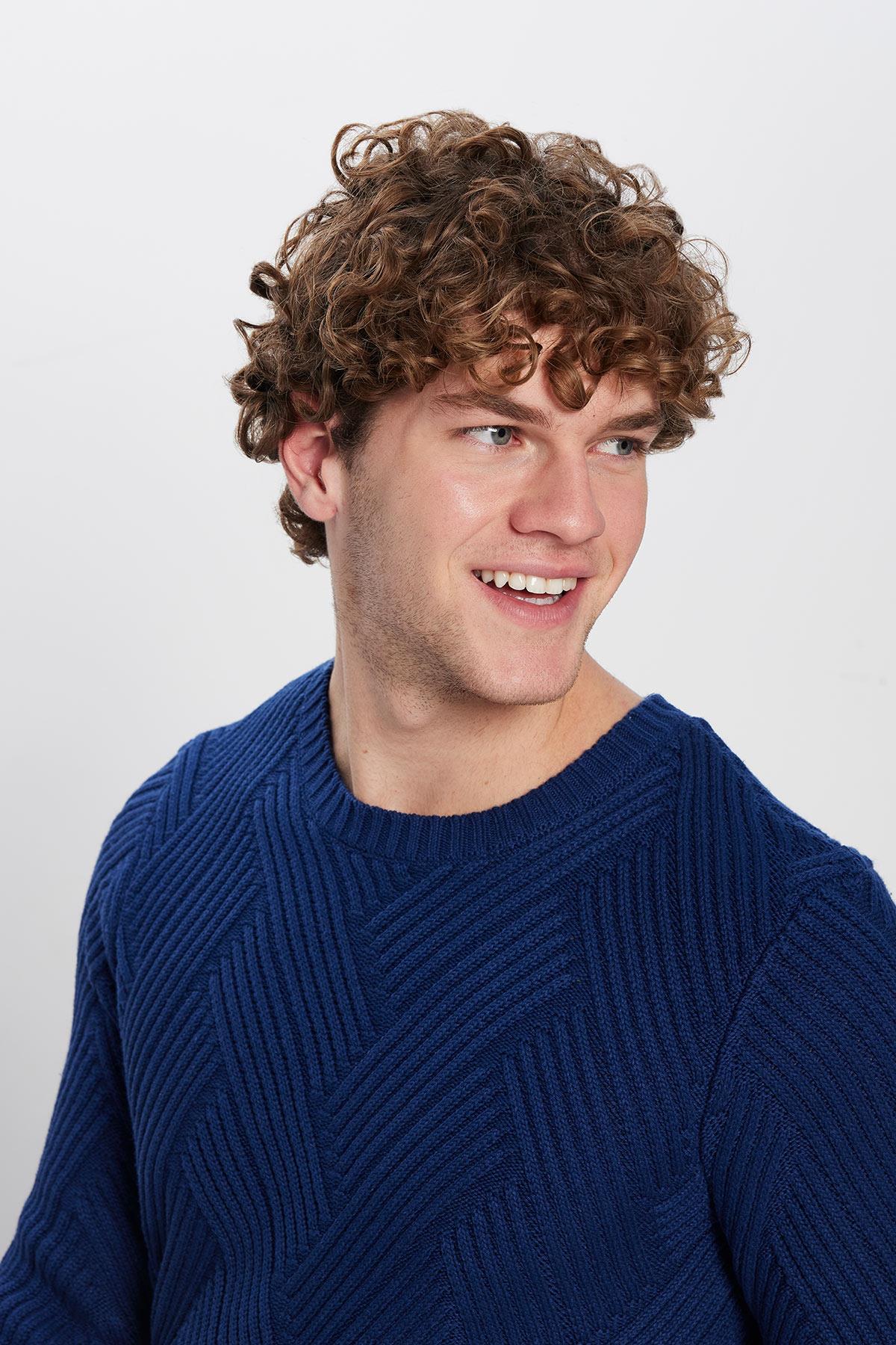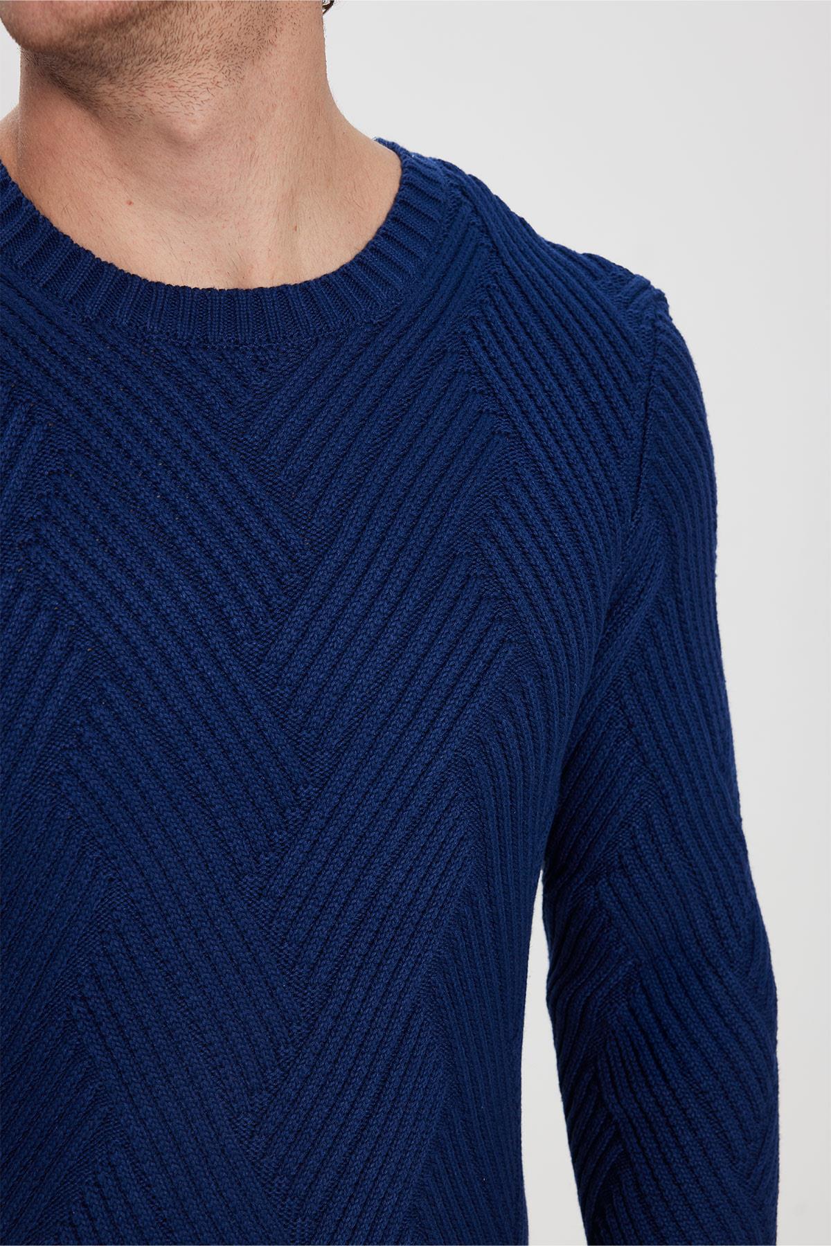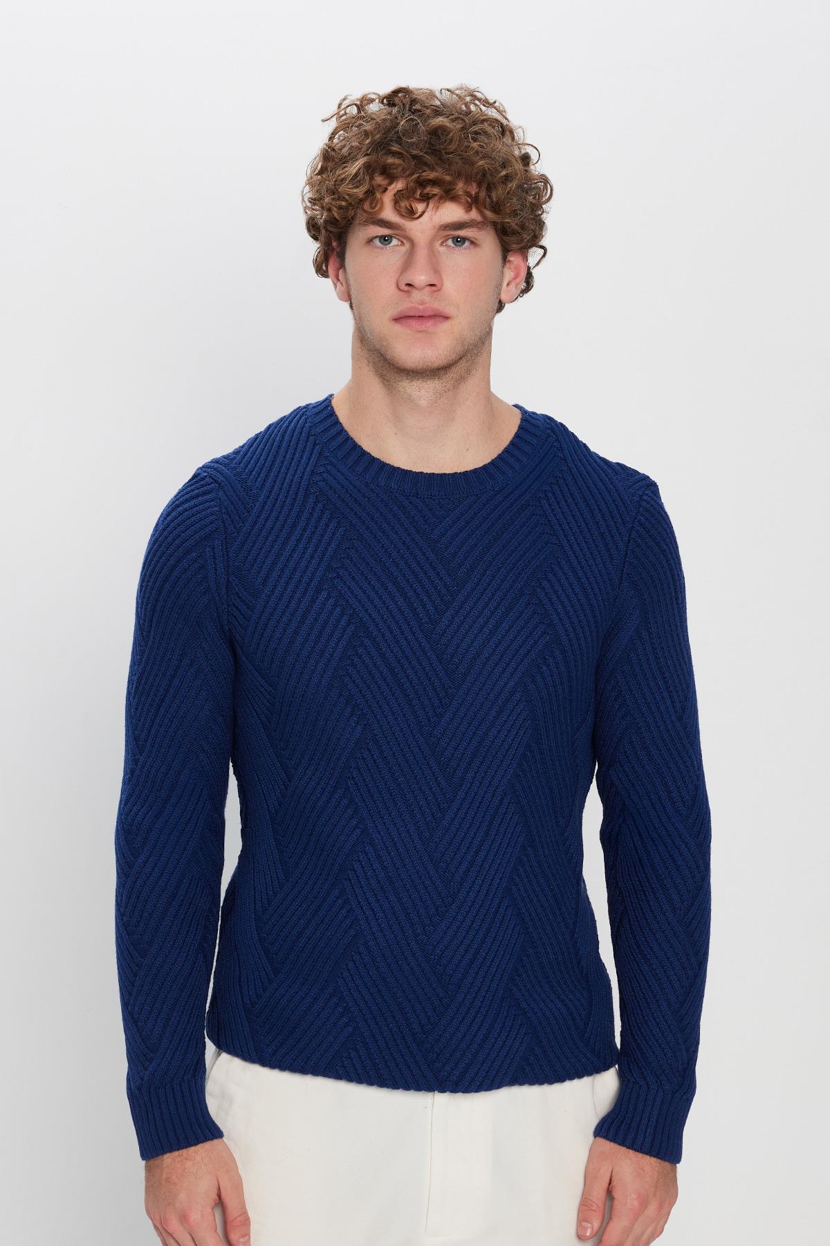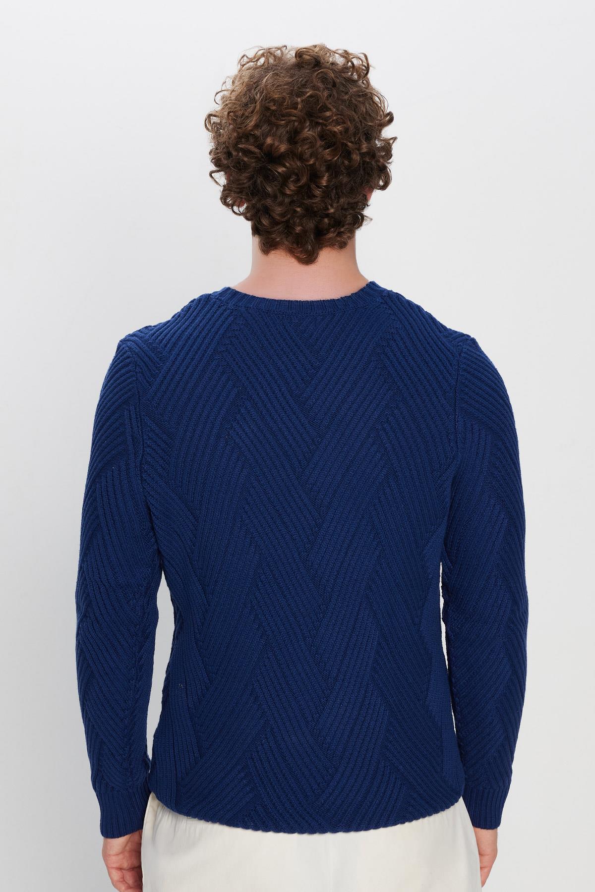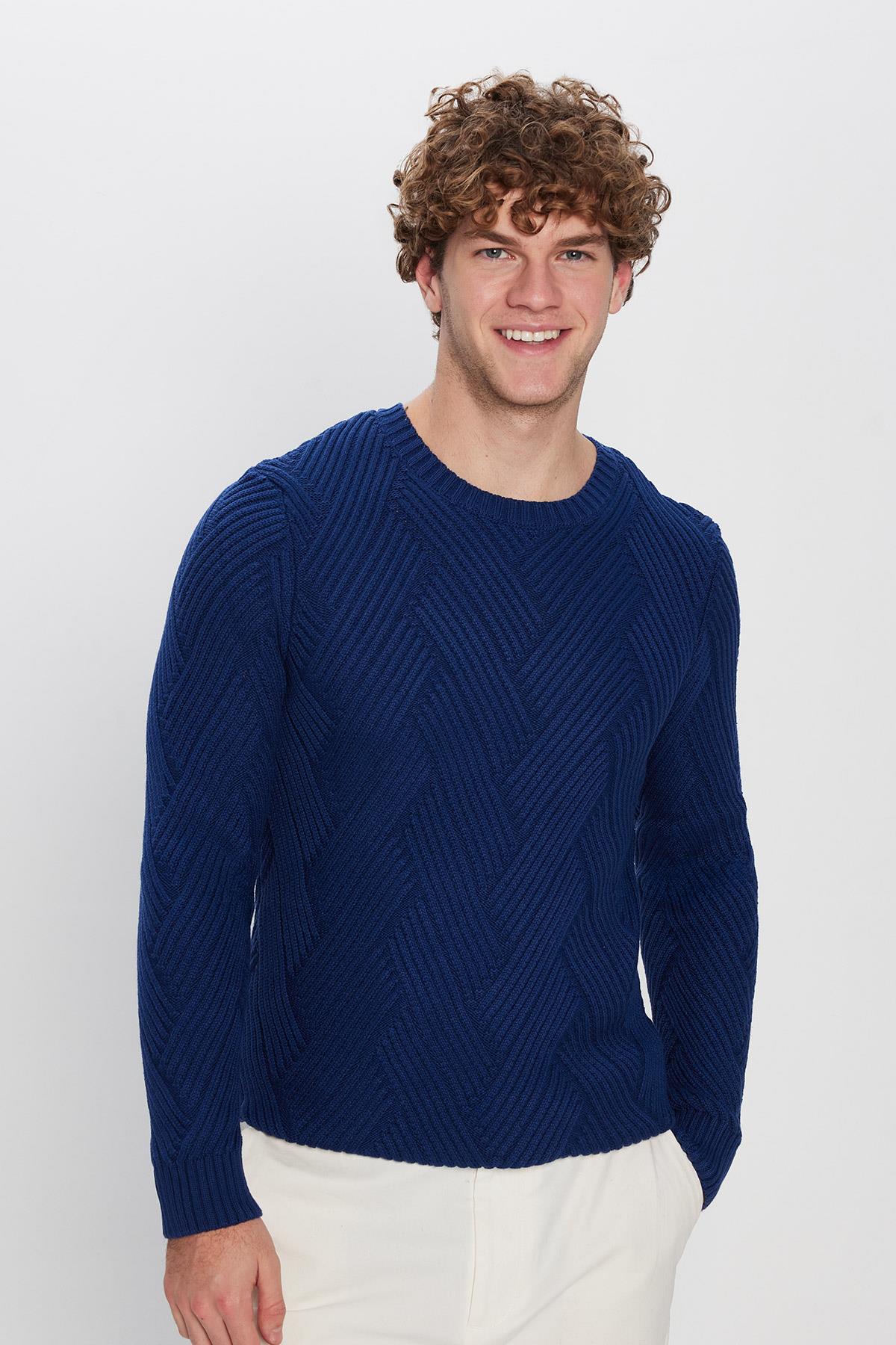 Erkek Slim Fit Dar Kesim Pamuklu Desenli Yumuşak Dokulu Saks Mavi Bisiklet Yaka Kazak