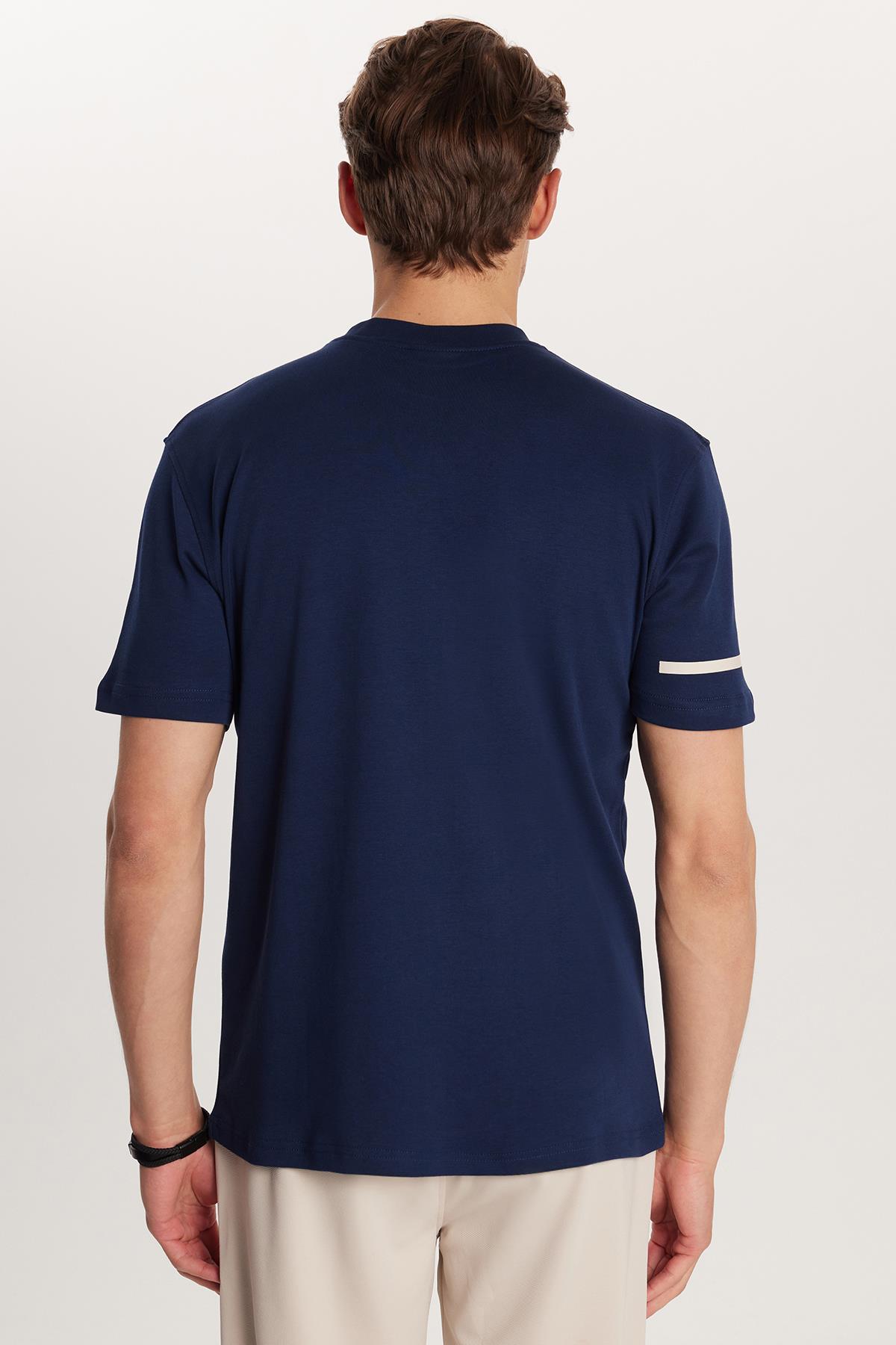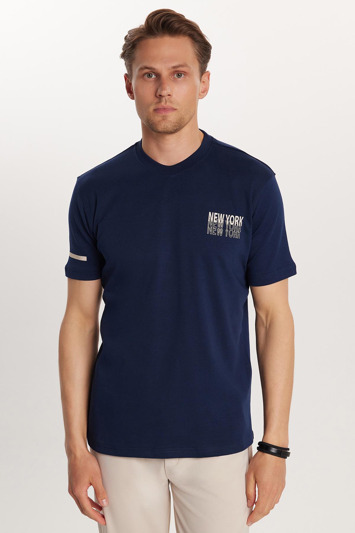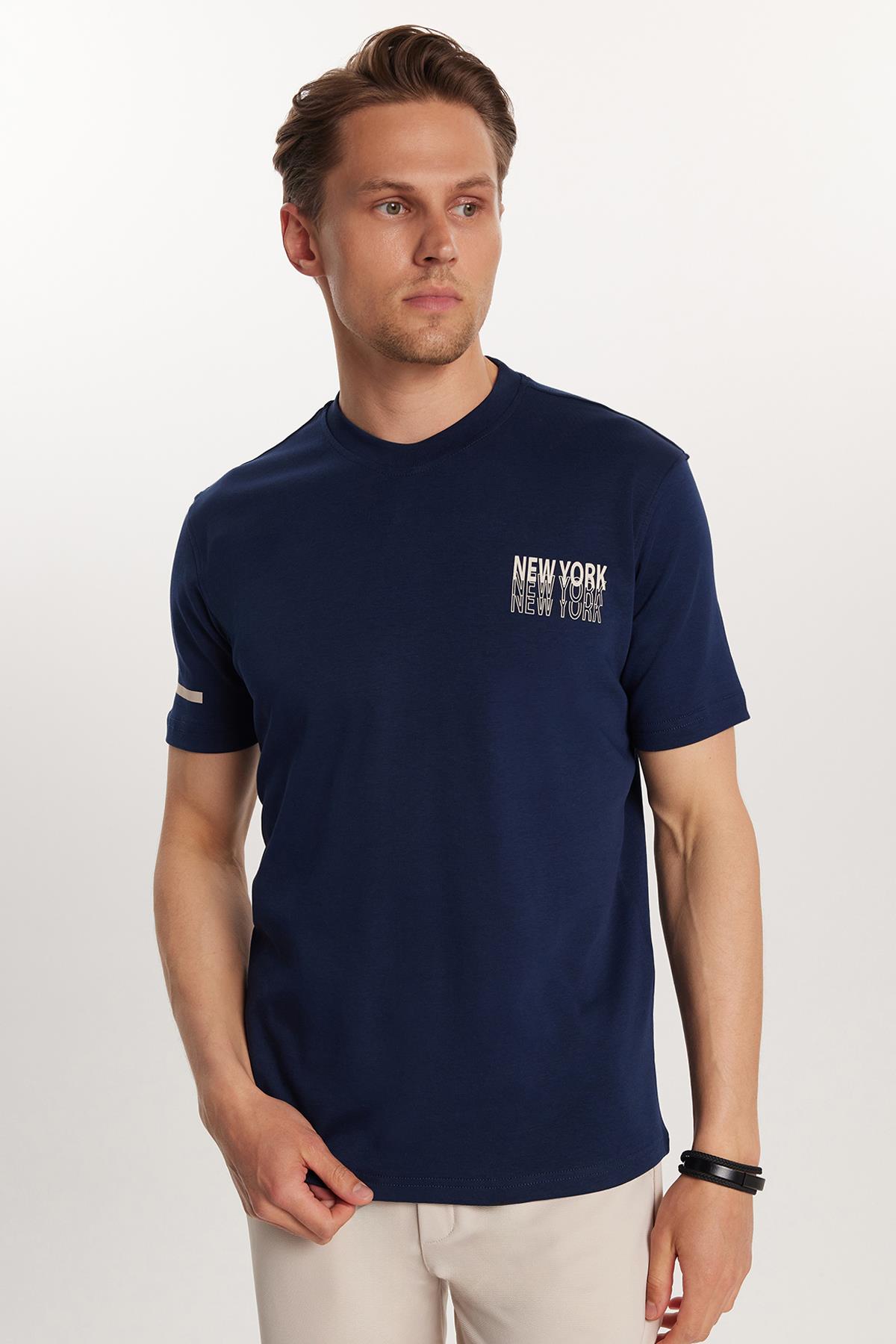 Erkek Slim Fit Dar Kesim Pamuklu Düz Basic Baskılı Bisiklet Yaka Lacivert Tişört (TS250025-47)