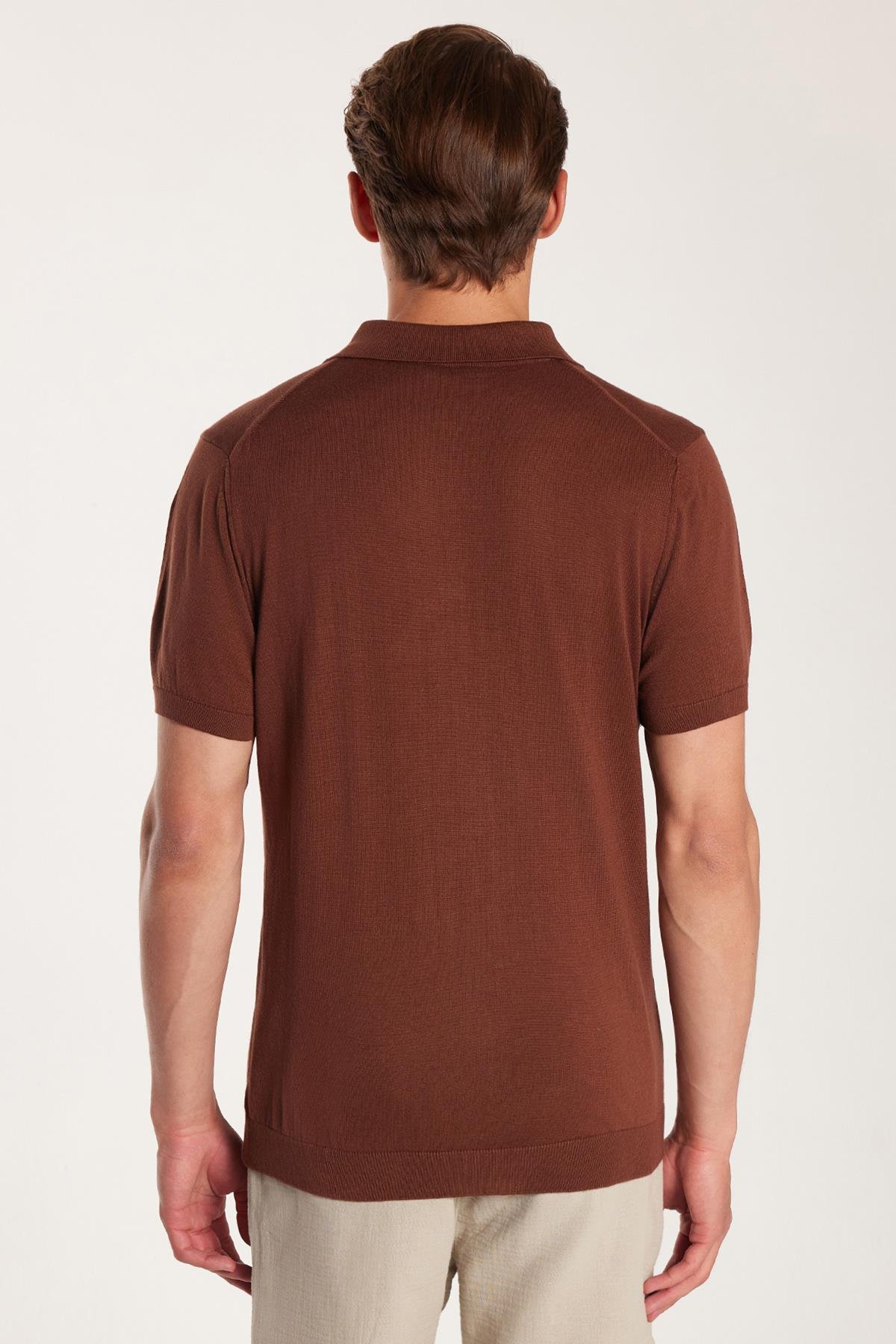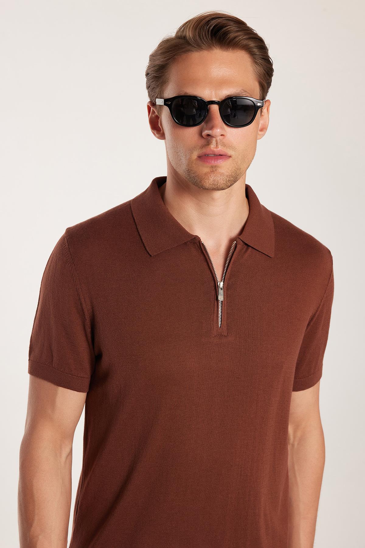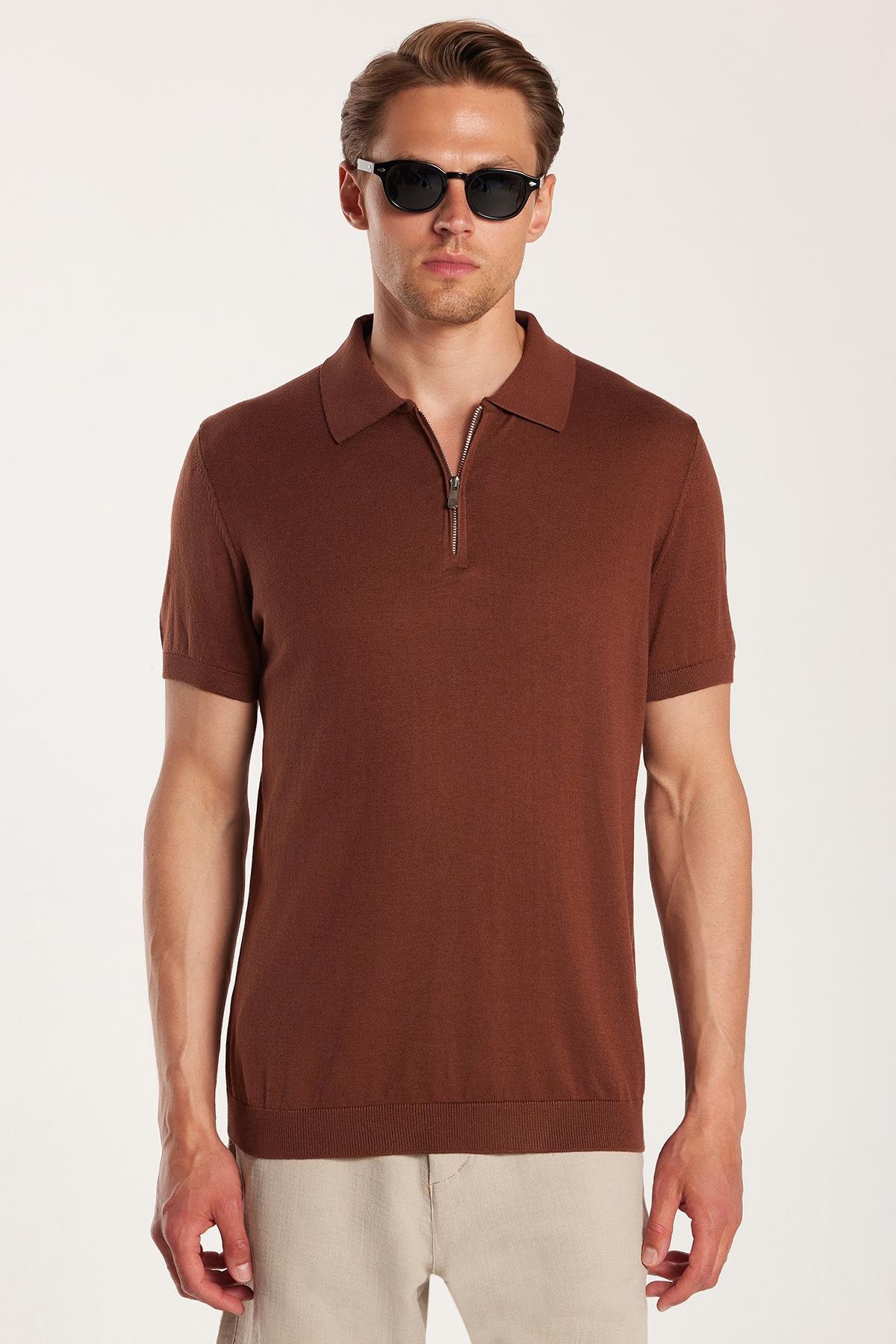 Erkek Slim Fit Dar Kesim Pamuklu Örme Triko Fermuarlı Kahverengi Polo Yaka Tişört (TS250003-BR1)
