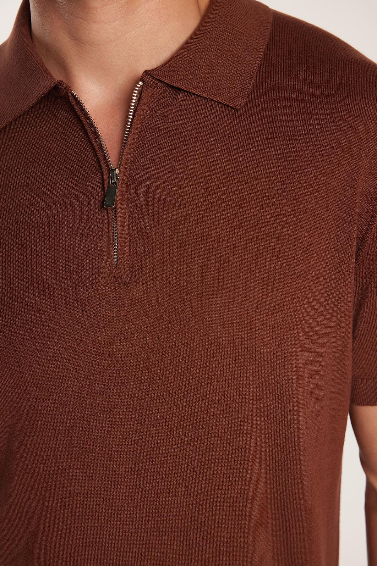 Erkek Slim Fit Dar Kesim Pamuklu Örme Triko Fermuarlı Kahverengi Polo Yaka Tişört