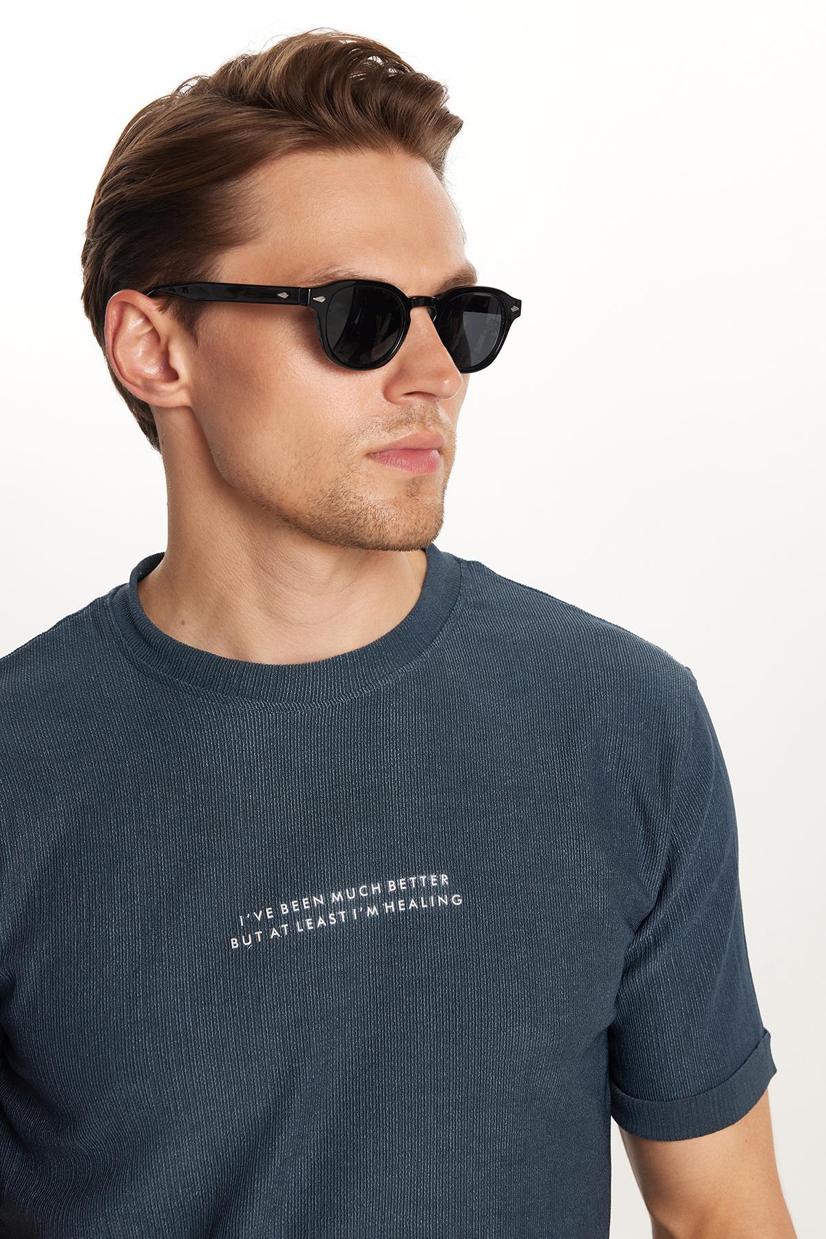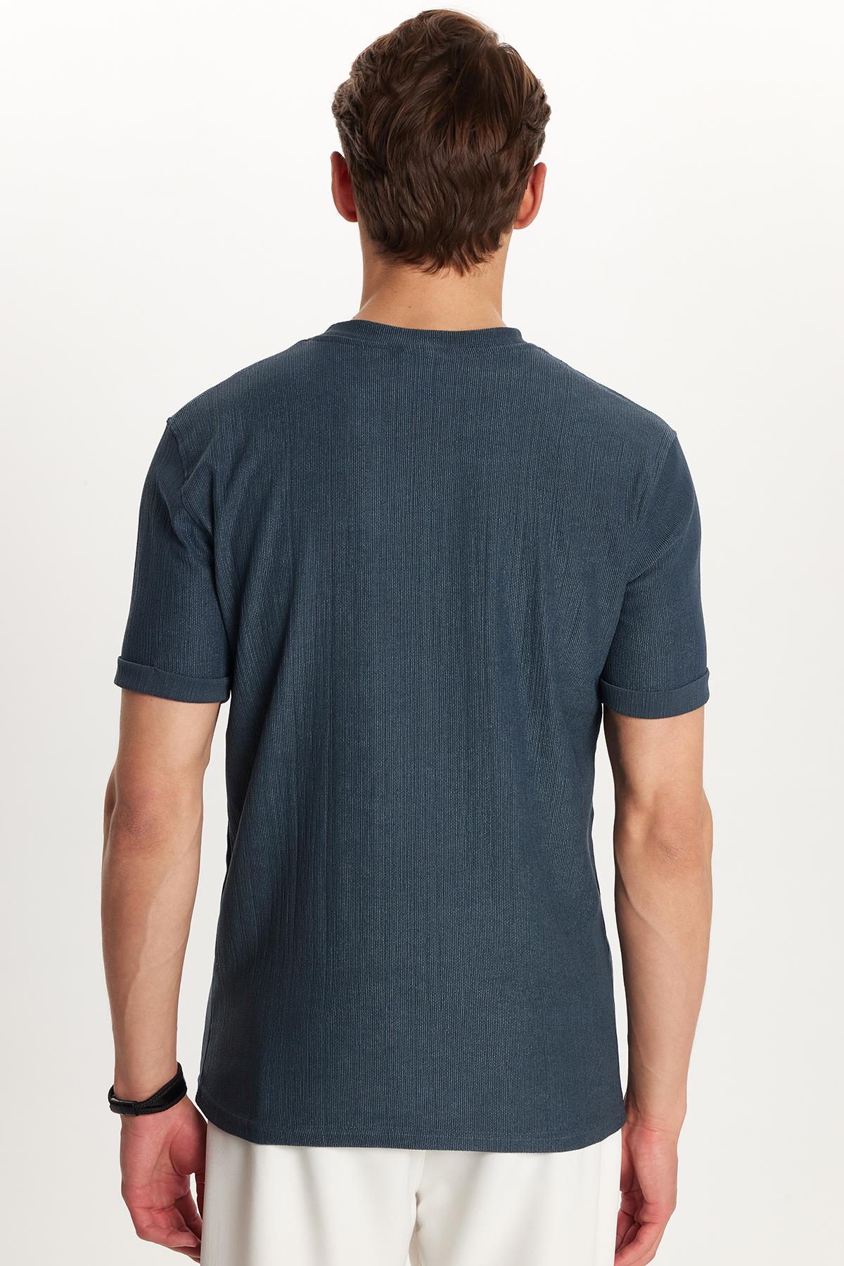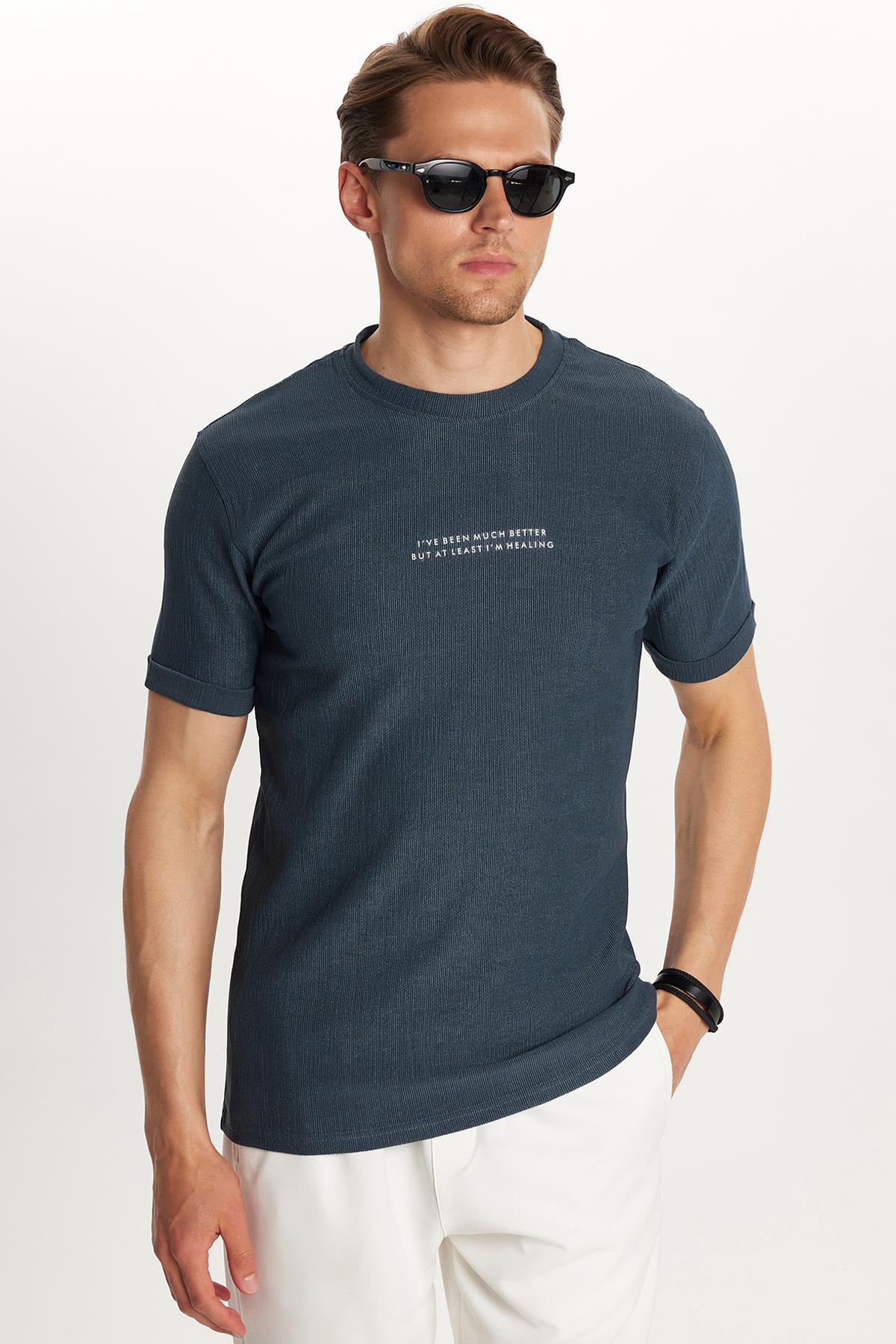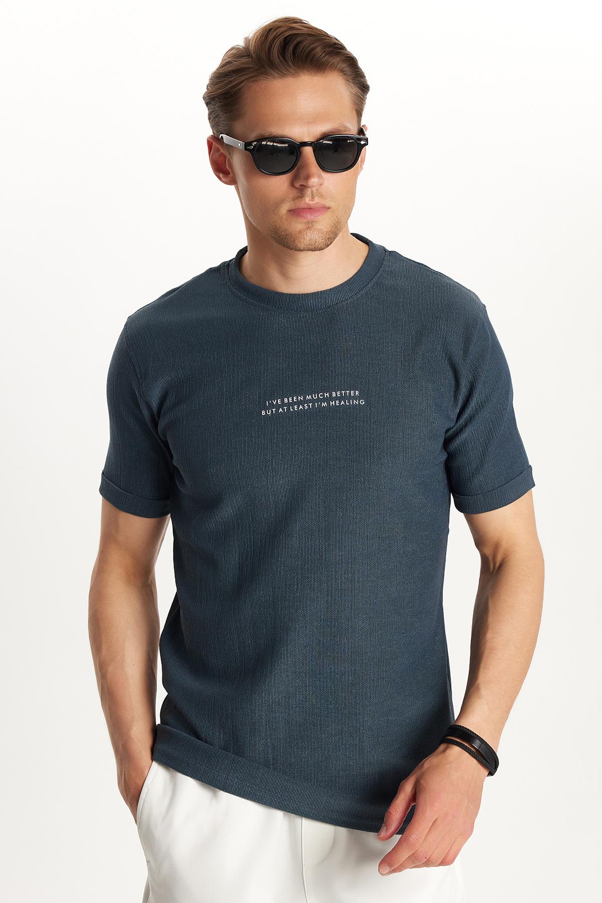 Erkek Slim Fit Dar Kesim Pamuklu Ribanalı Baskılı Petrol Bisiklet Yaka Tişört (TS250021-PL)
