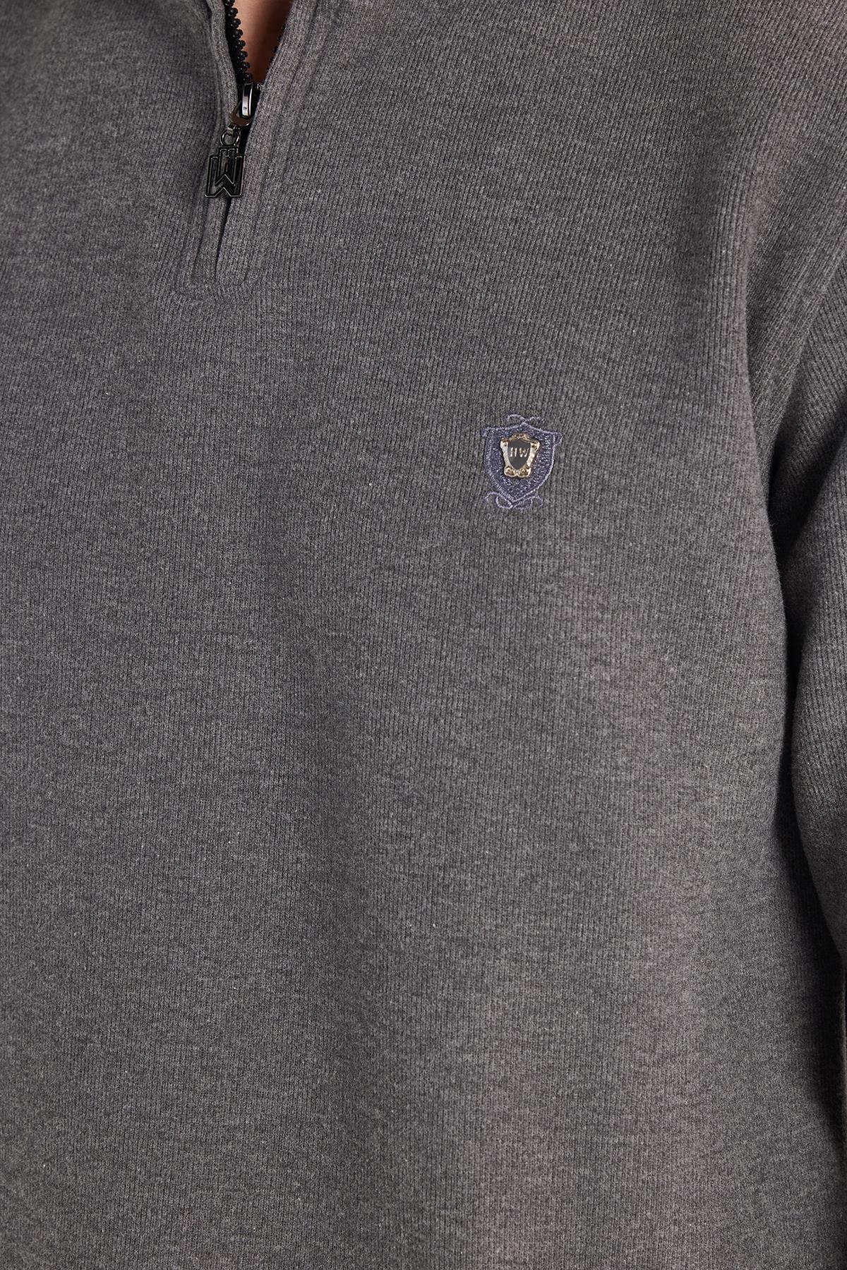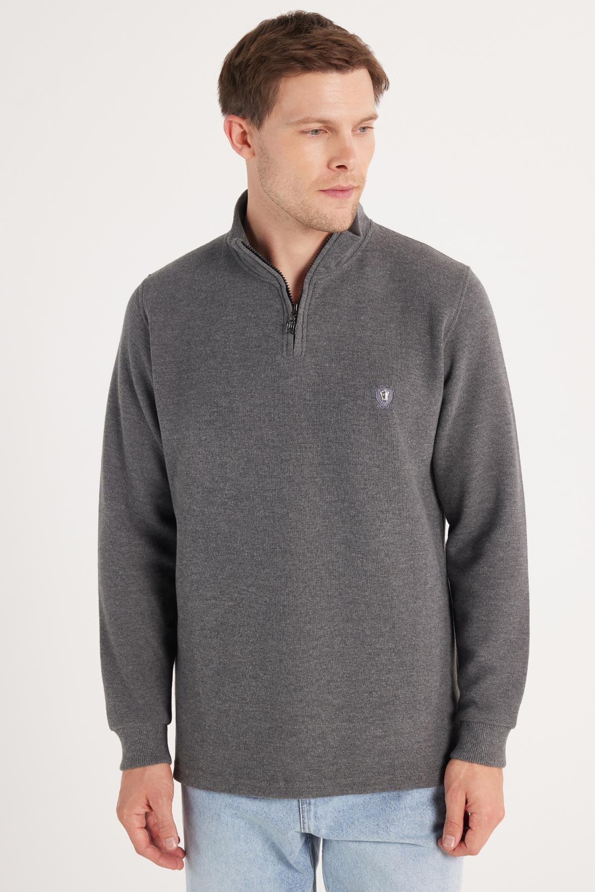 Erkek Slim Fit Dar Kesim Pamuklu Selanik Kumaş Yarım Fermuarlı Antrasit Dik Yaka Sweatshirt (SW250021-ANHCT)