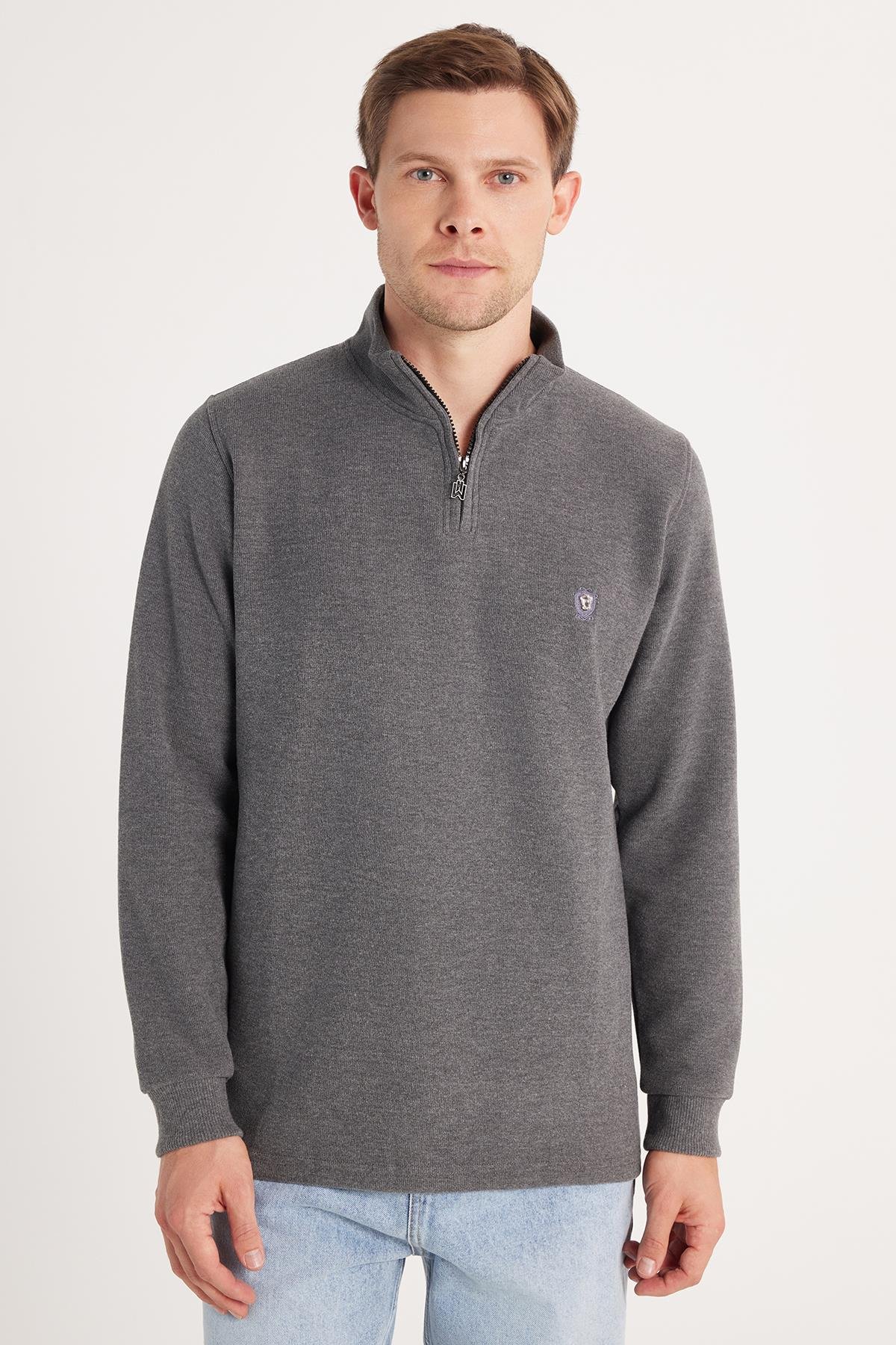 Erkek Slim Fit Dar Kesim Pamuklu Selanik Kumaş Yarım Fermuarlı Antrasit Dik Yaka Sweatshirt