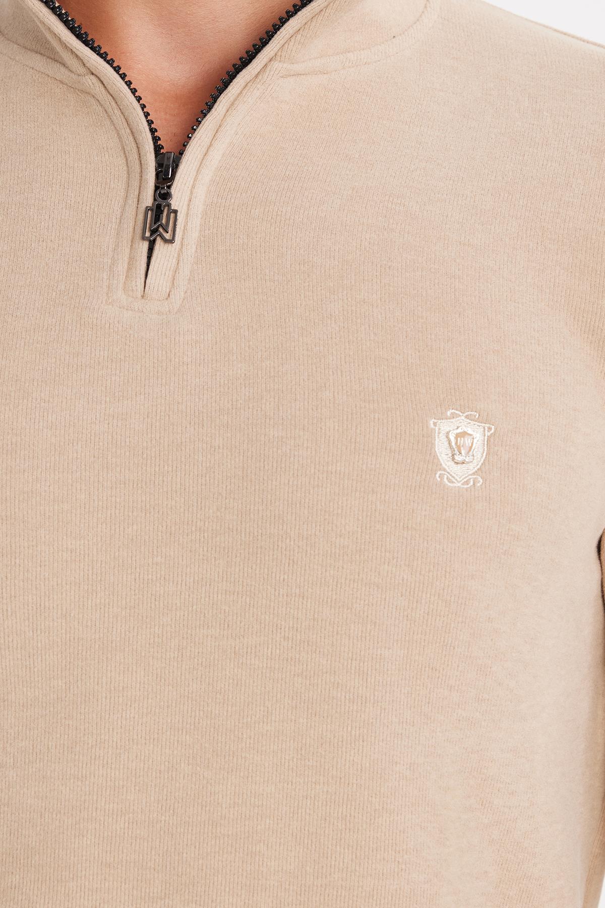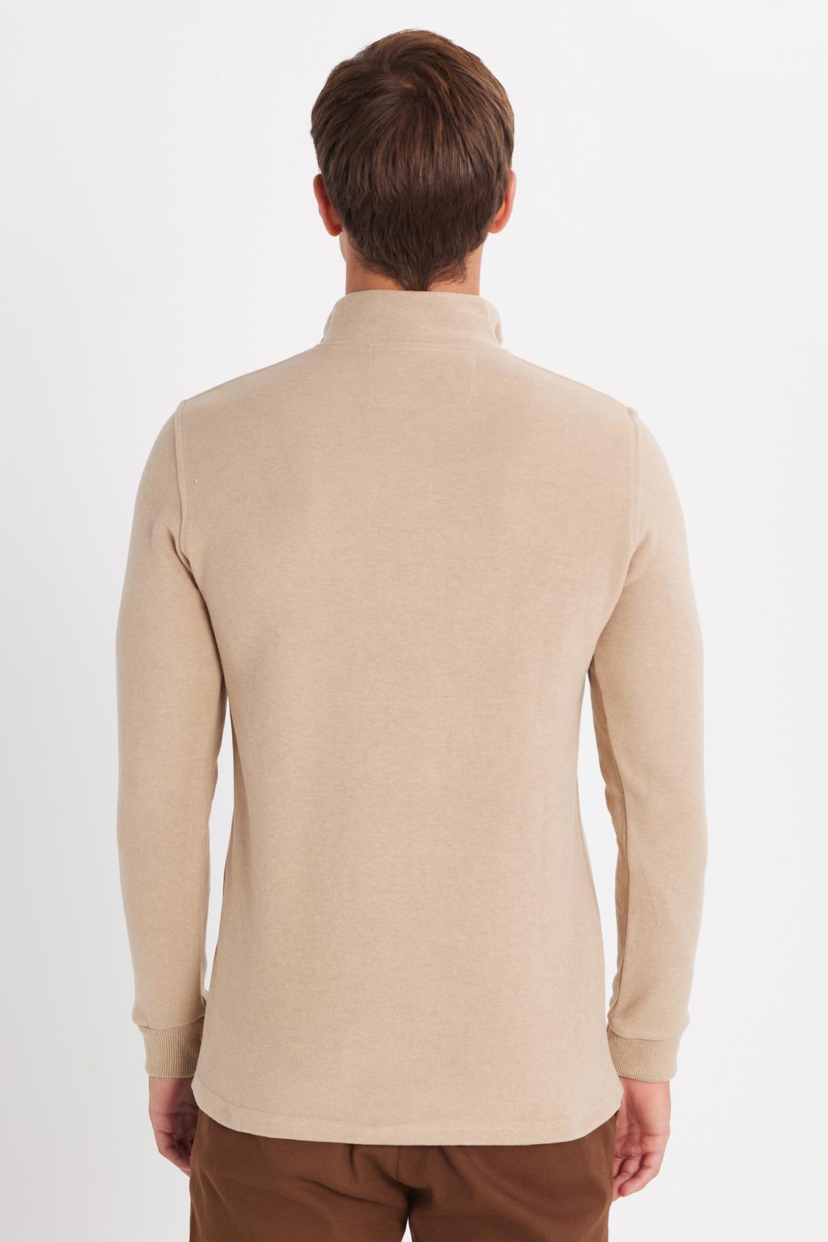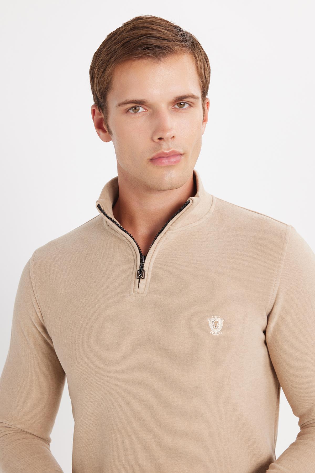 Erkek Slim Fit Dar Kesim Pamuklu Selanik Kumaş Yarım Fermuarlı Taş Dik Yaka Sweatshirt (SW250021-STN)