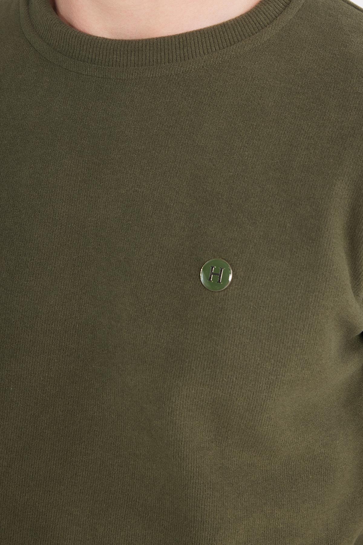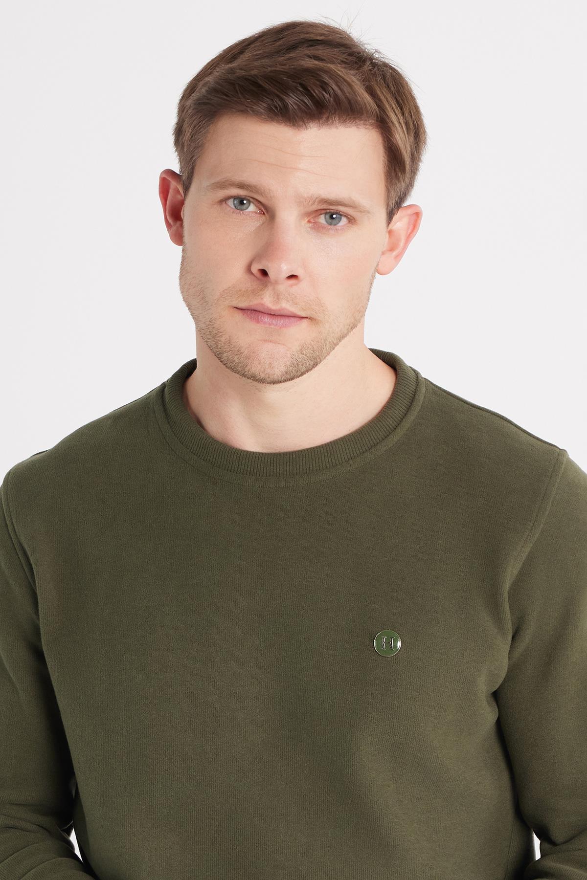Erkek Slim Fit Dar Kesim Pamuklu Selanik Kumaş Bisiklet Yaka Haki Sweatshirt