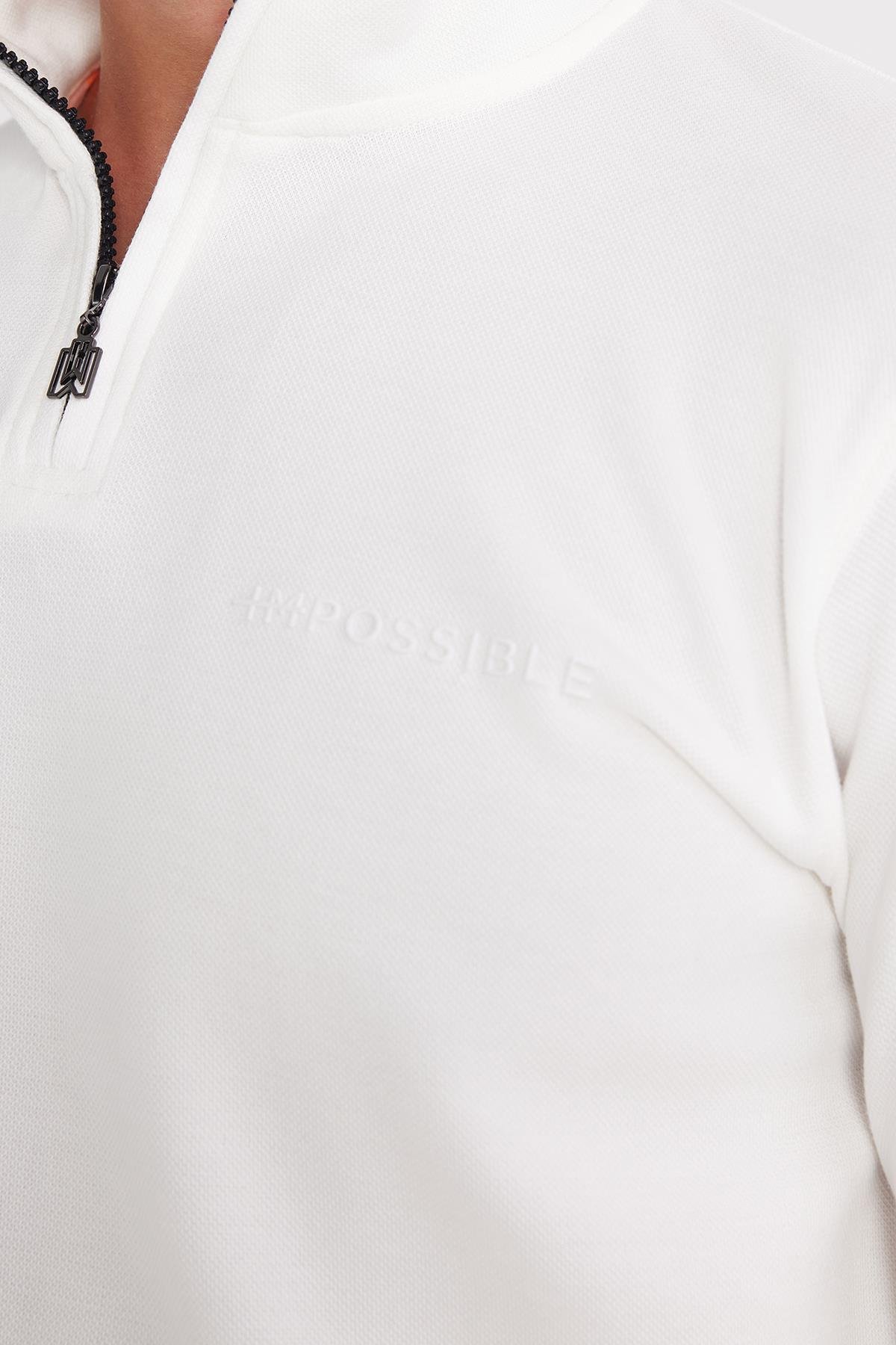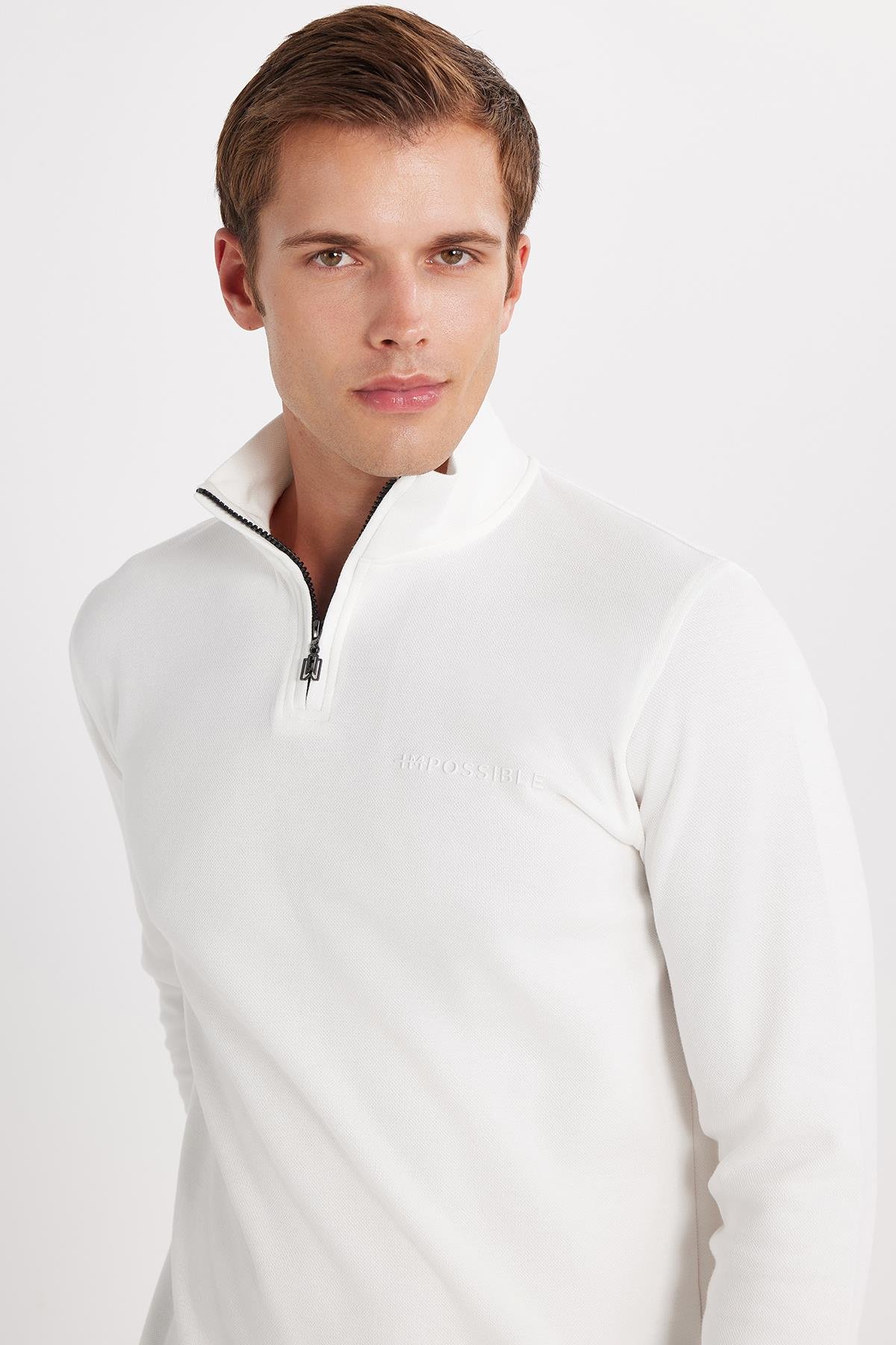 Erkek Slim Fit Dar Kesim Pamuklu Yarım Fermuarlı Dik Yaka Beyaz Sweatshirt