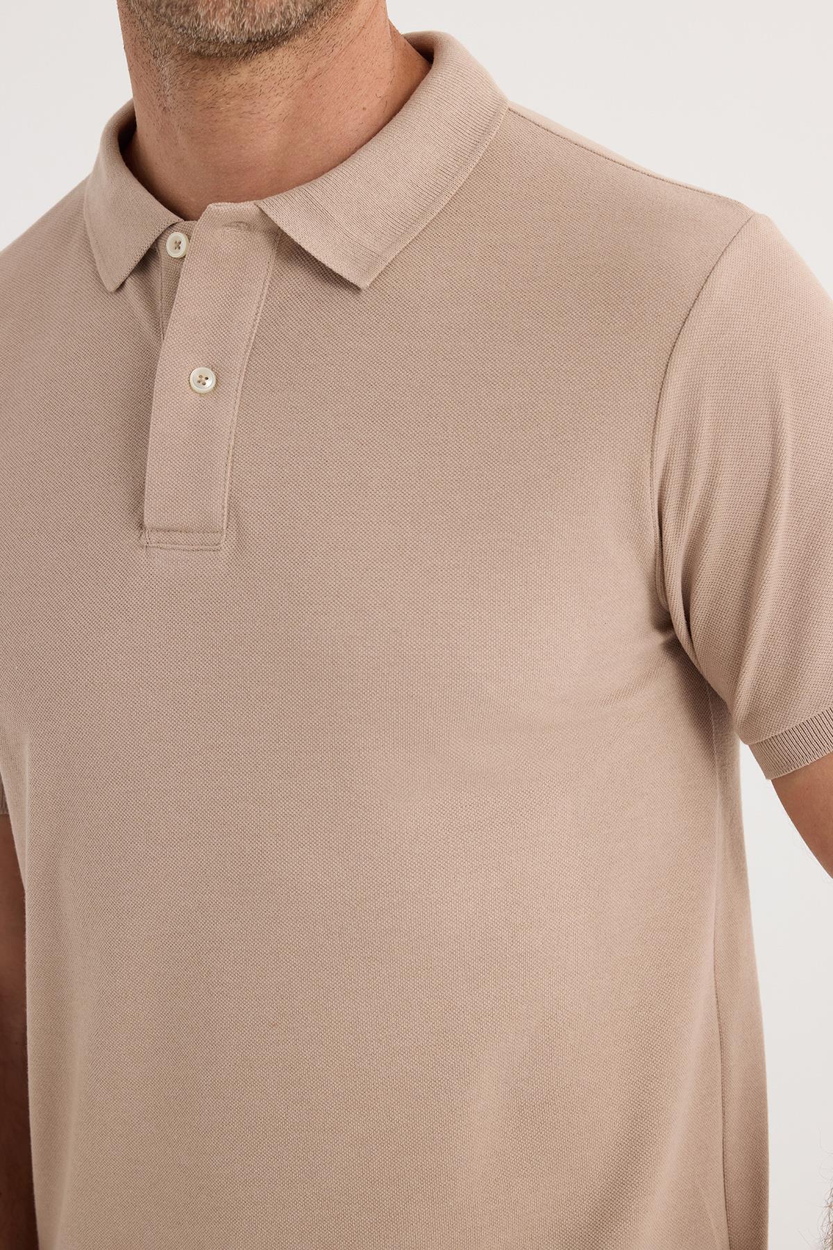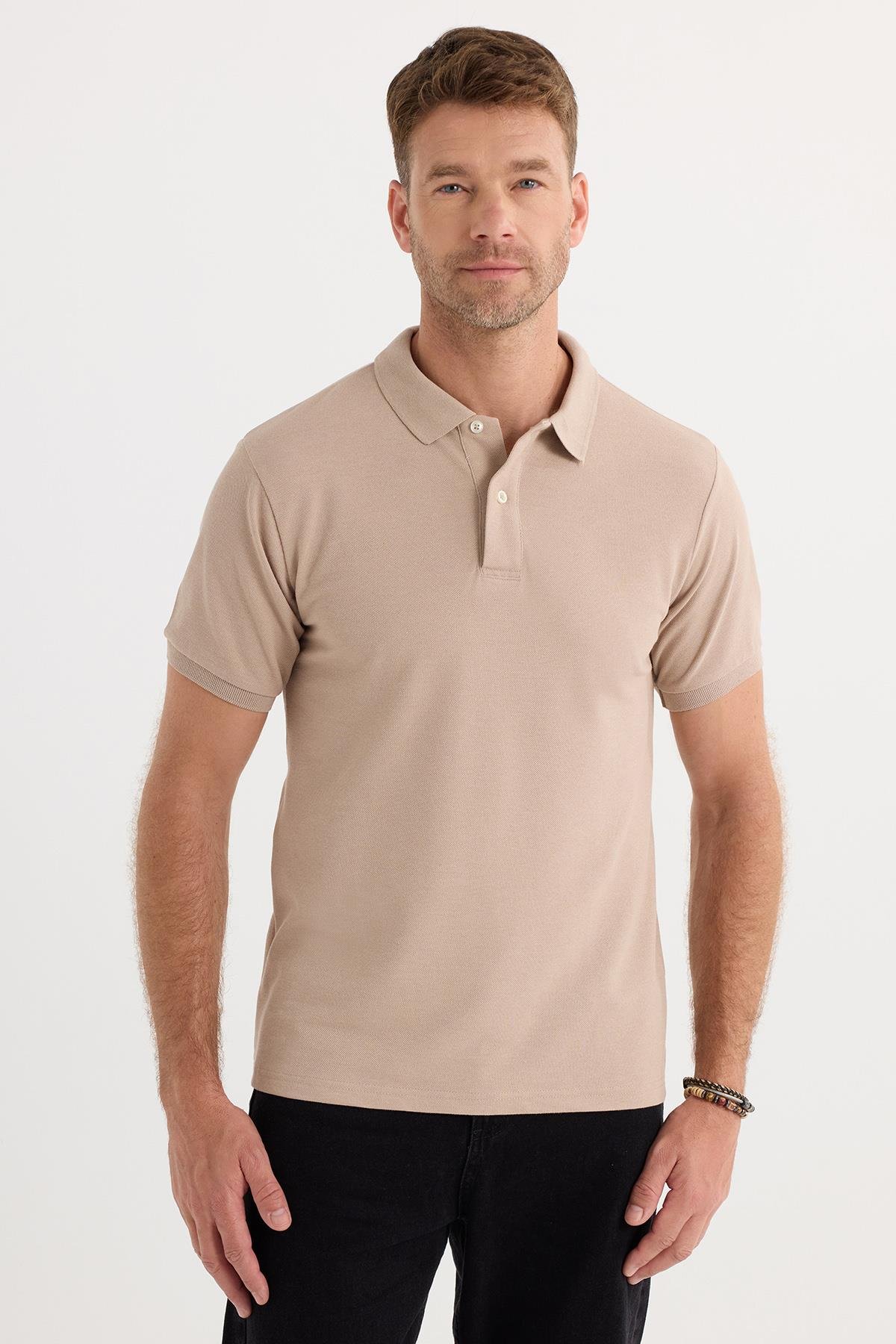 Erkek Slim Fit Dar Kesim Pamuklu Yumuşak Dokulu Serin Tutan Kumaş Düz Pike Bej Polo Yaka Tişört