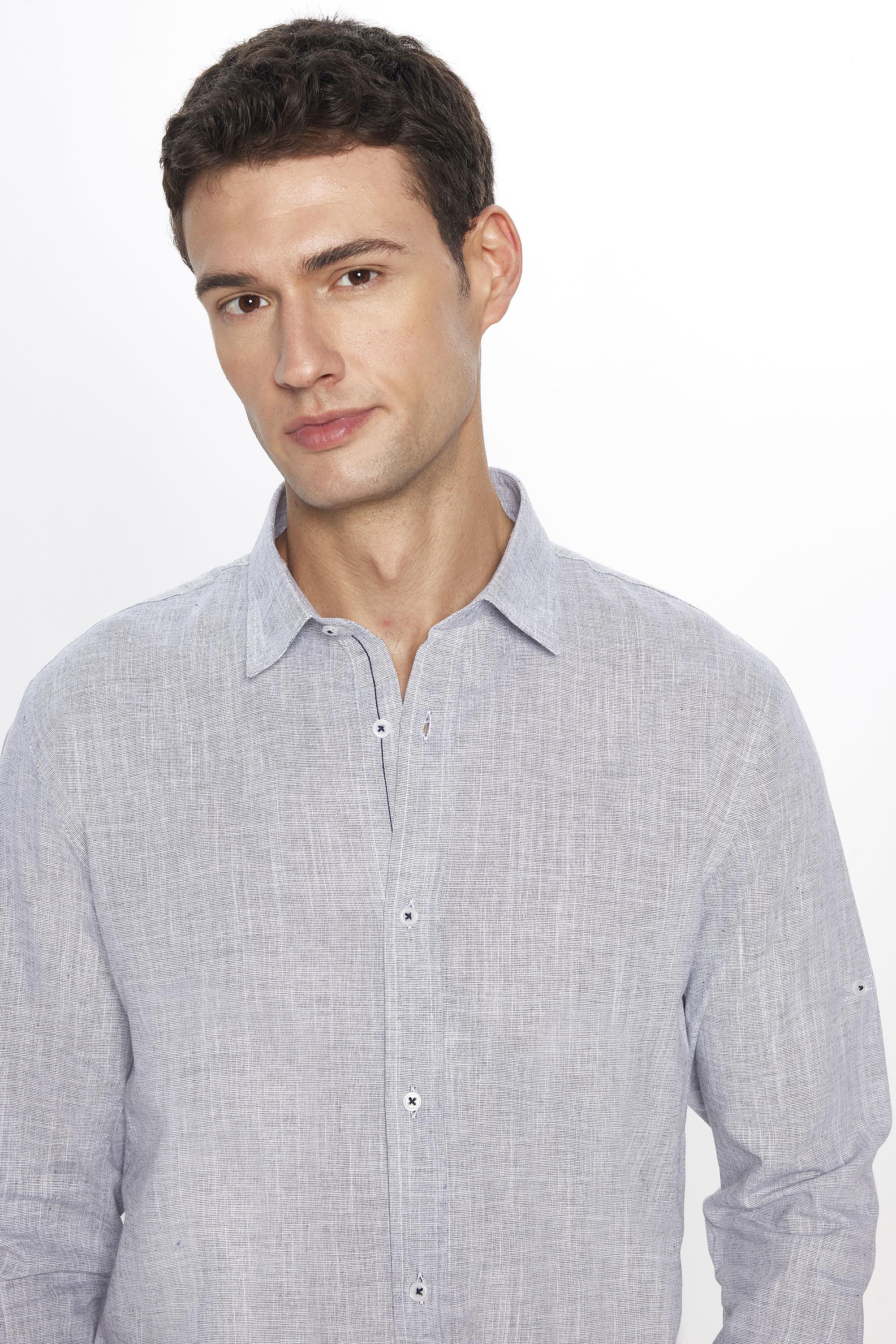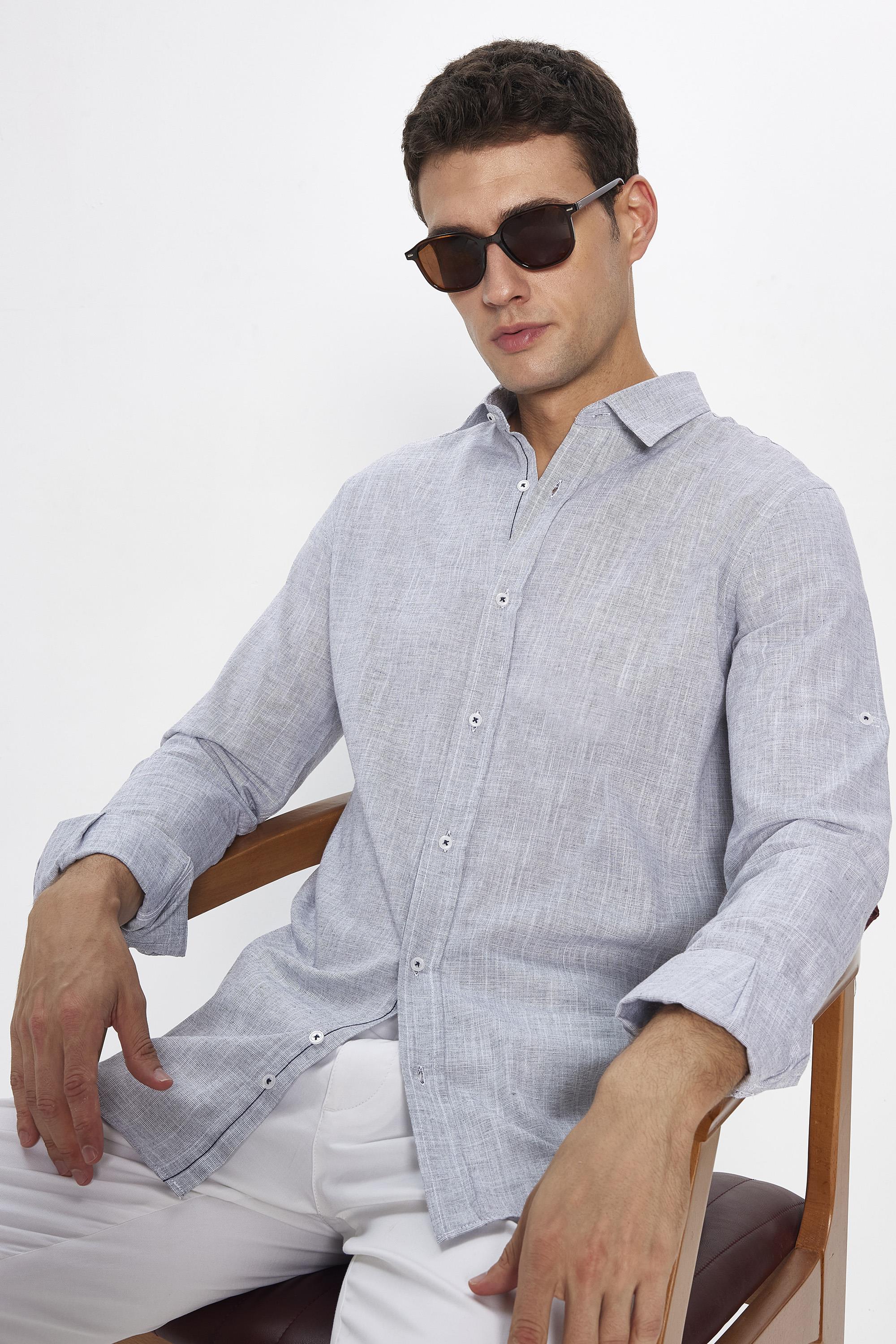Erkek Slim Fit Dar Kesim Uzun Kollu %100 Pamuk Keten Doku Apoletli Gri Gömlek