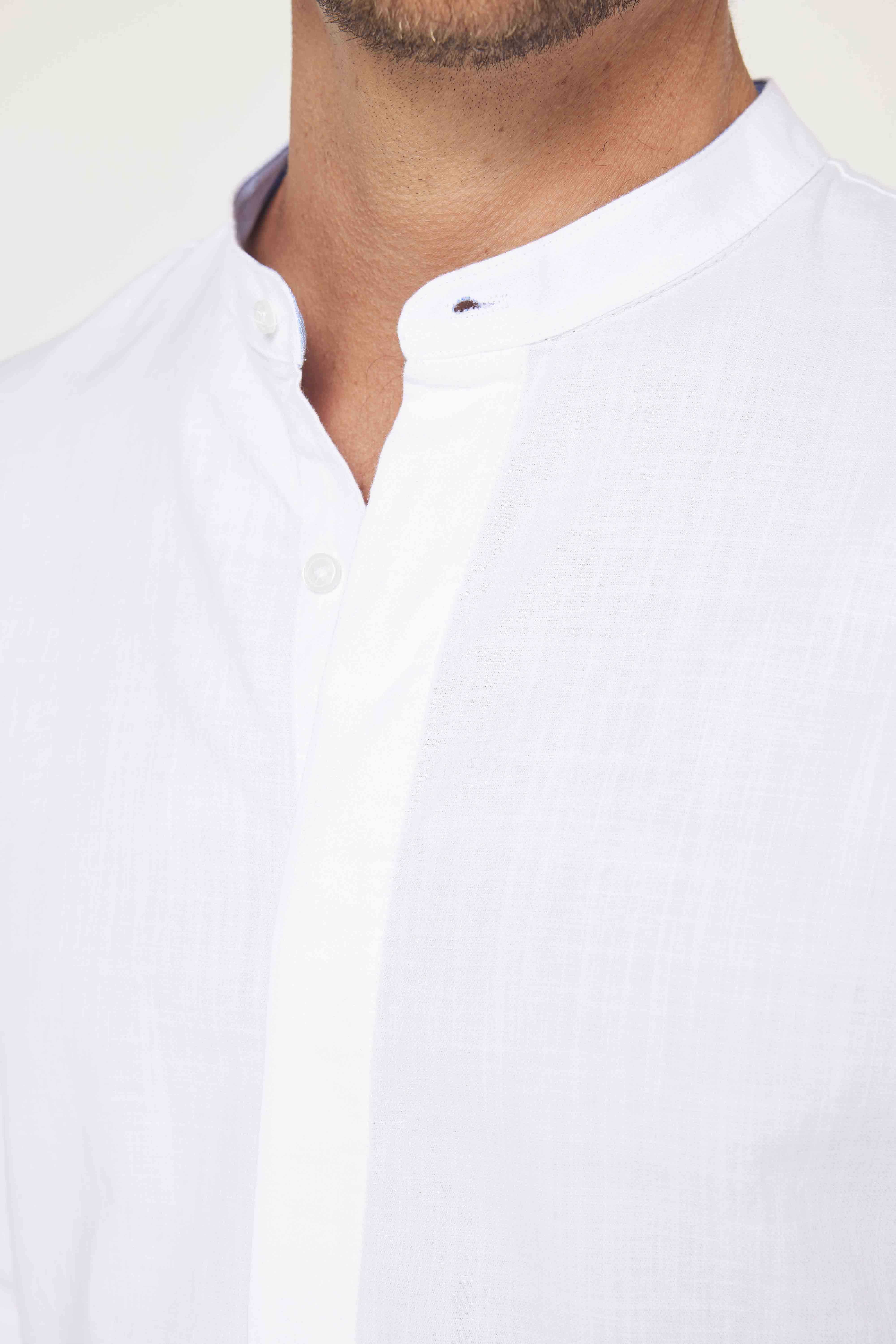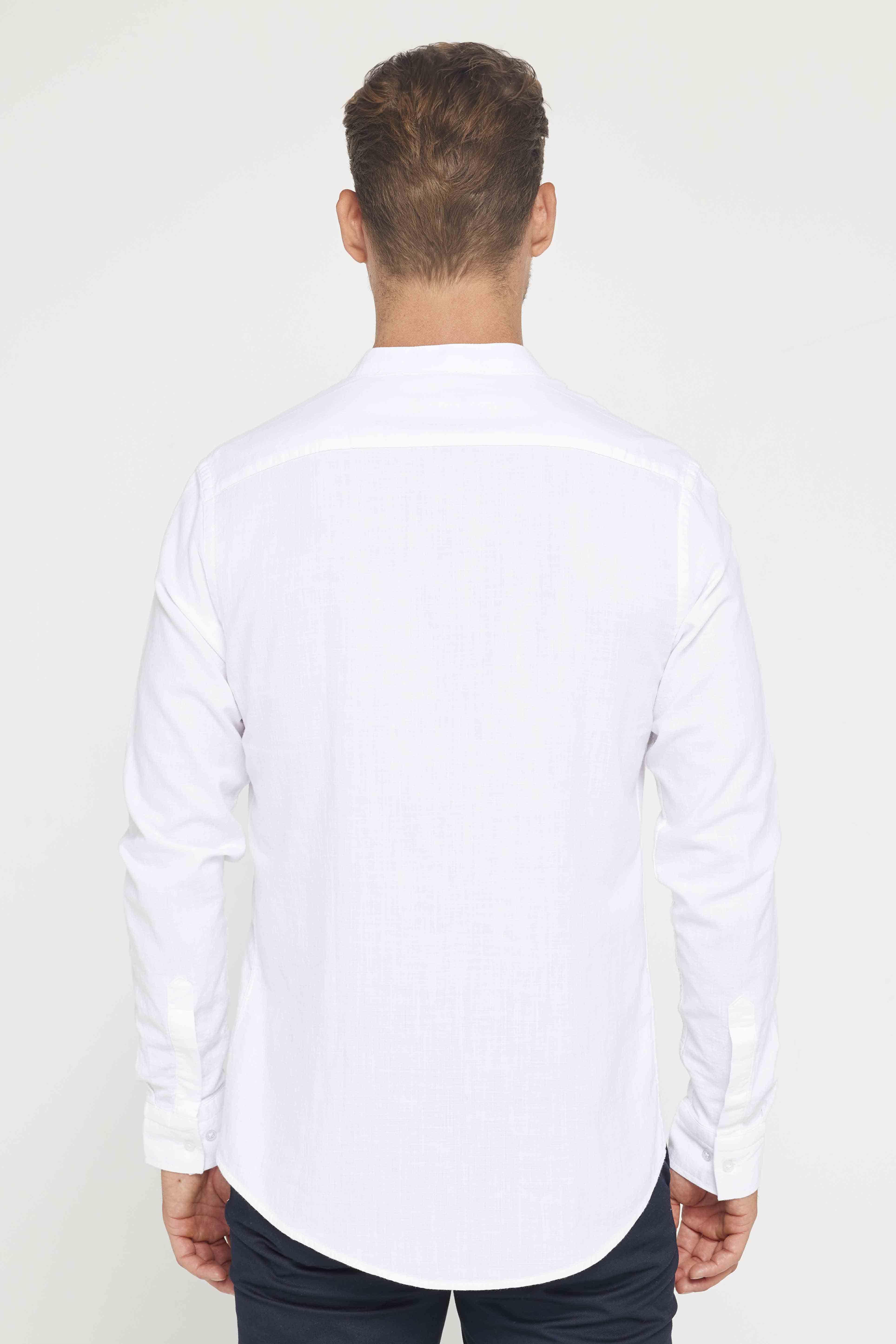 Erkek Slim Fit Dar Kesim Uzun Kollu %100 Pamuk Keten Doku Armürlü Beyaz Hakim Yaka Gömlek (DR240068-8028)