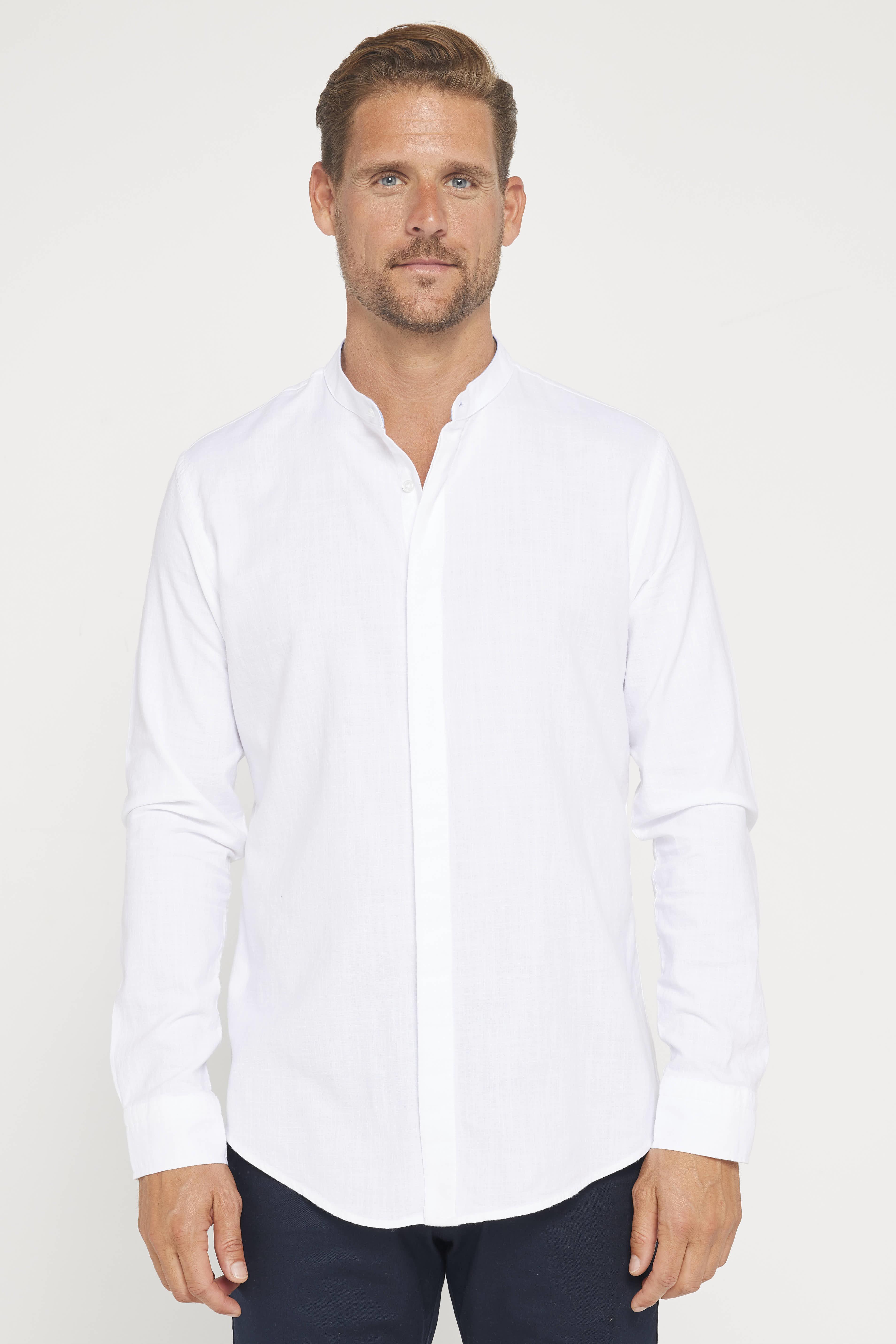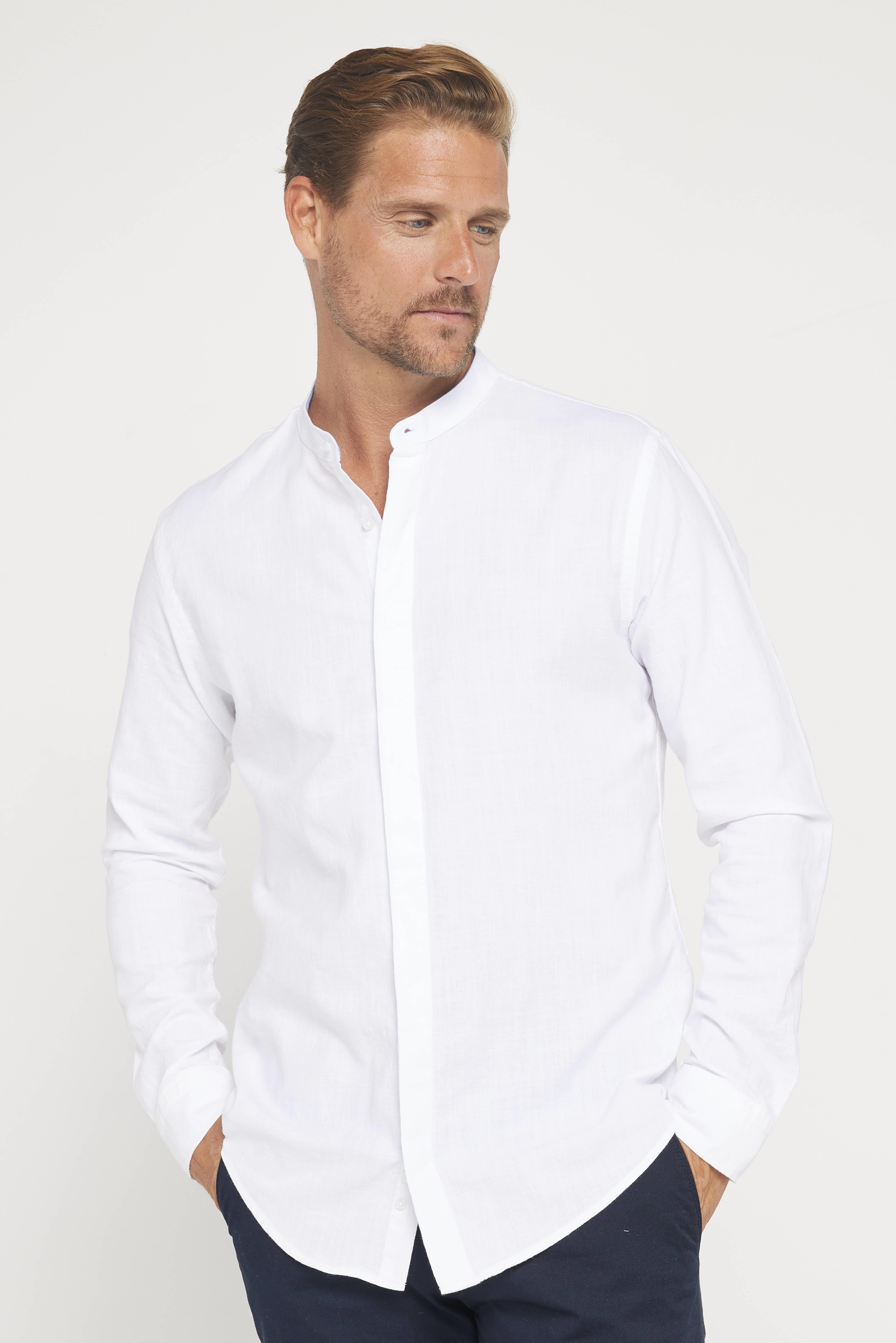 Erkek Slim Fit Dar Kesim Uzun Kollu %100 Pamuk Keten Doku Armürlü Beyaz Hakim Yaka Gömlek