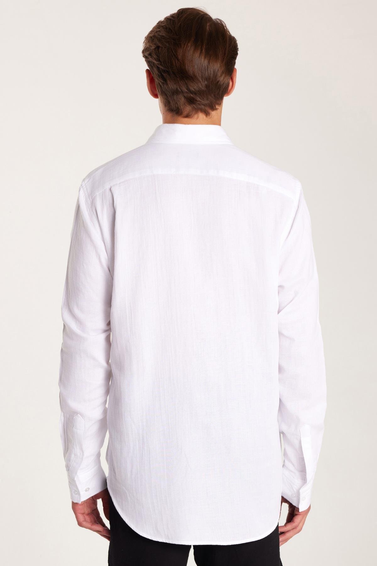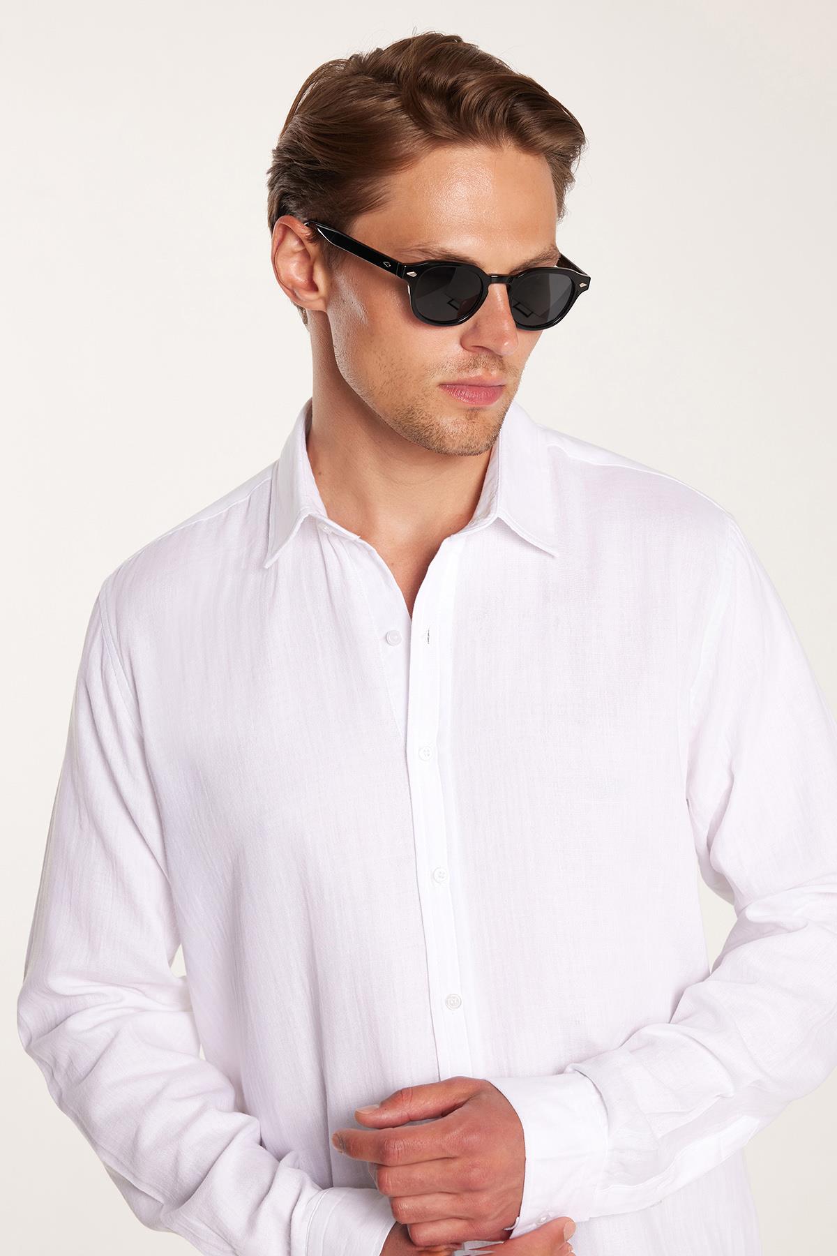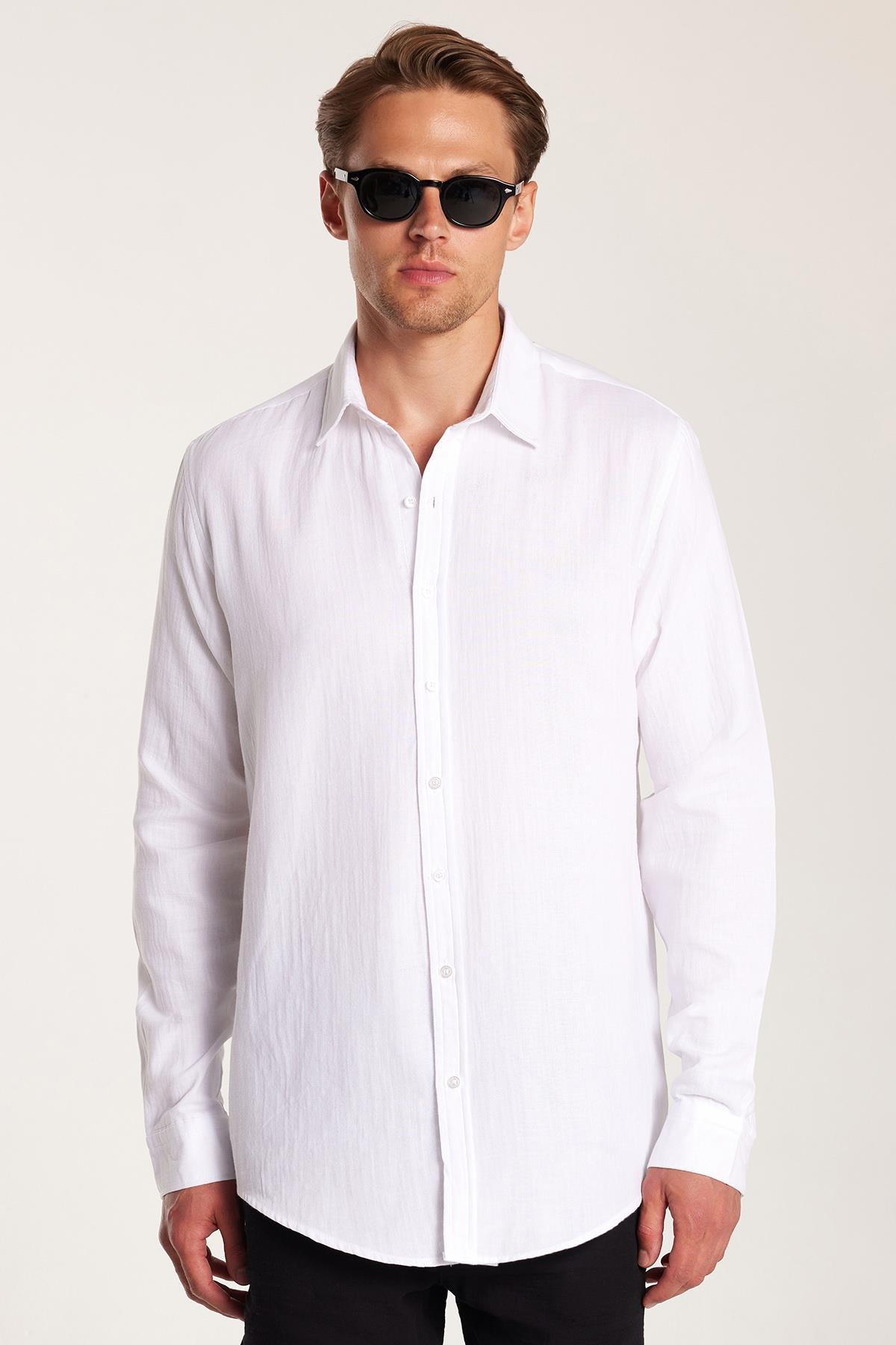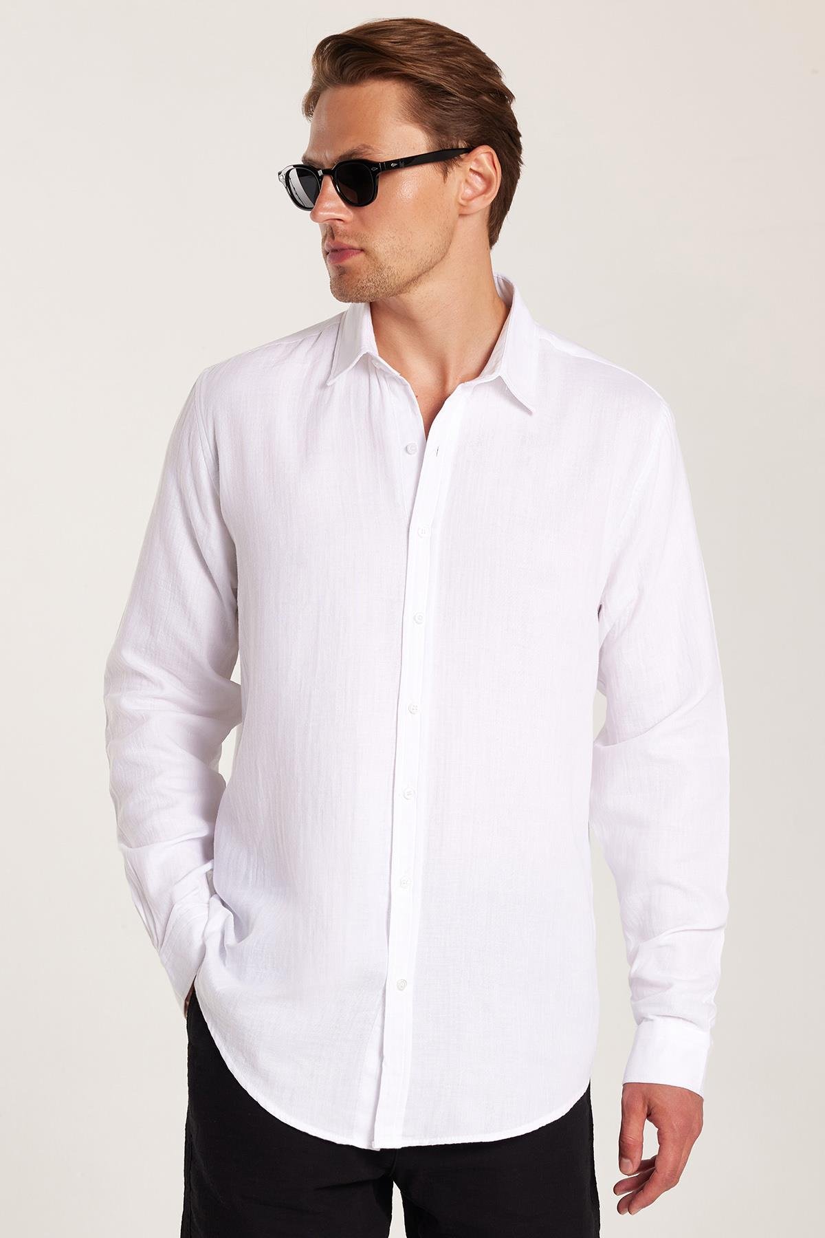 Erkek Slim Fit Dar Kesim Uzun Kollu %100 Pamuk Keten Doku Düz Biyeli Beyaz Gömlek (DR230054-4008)