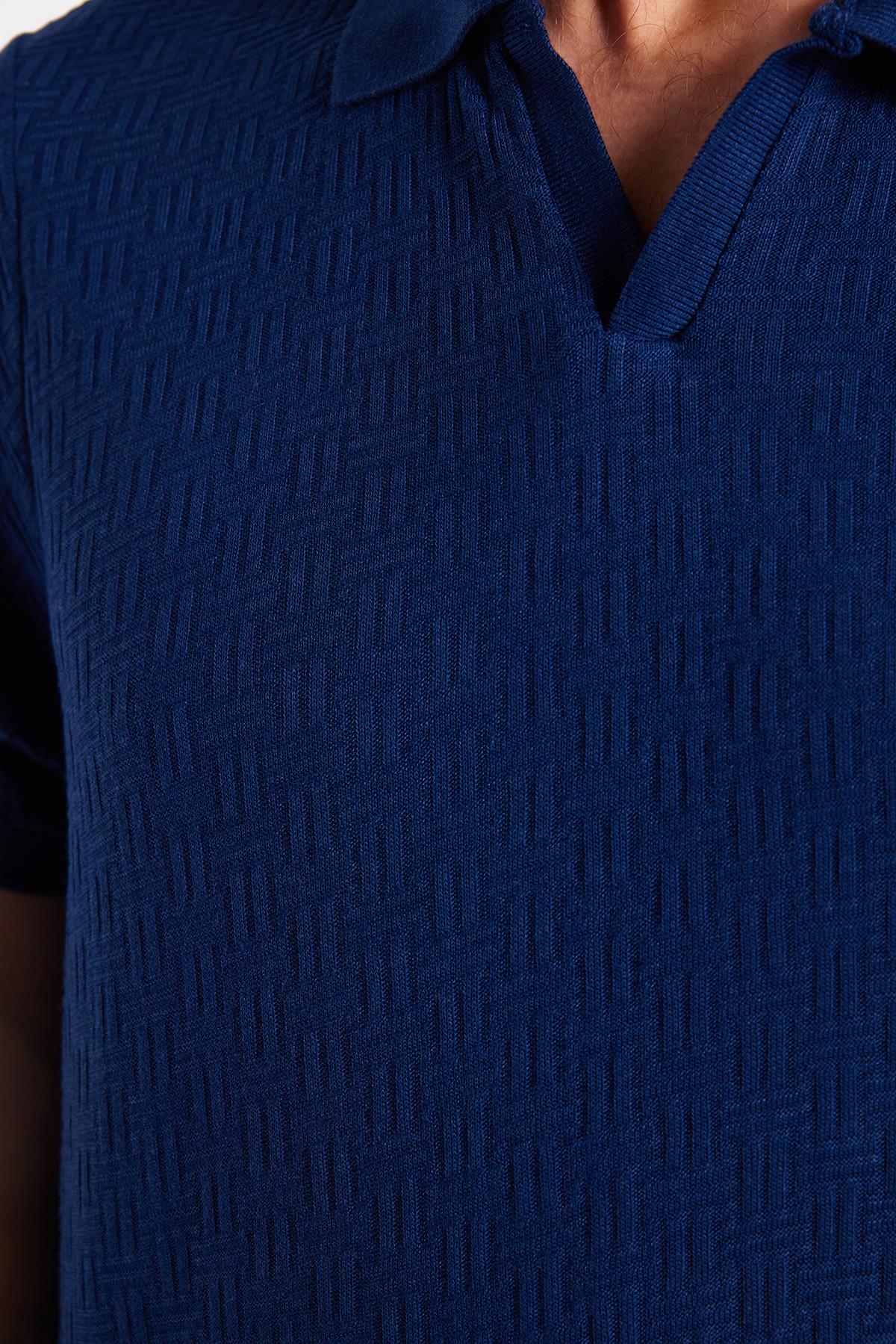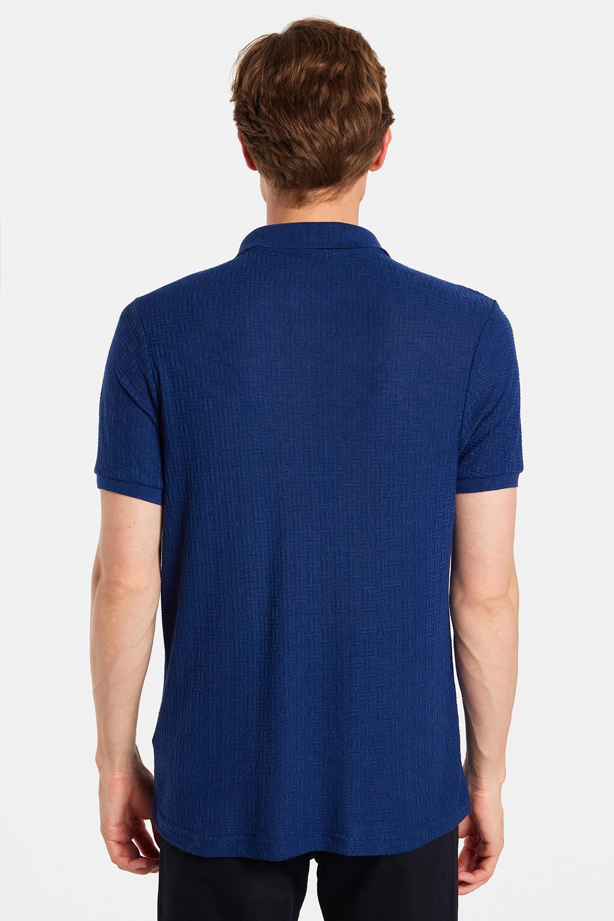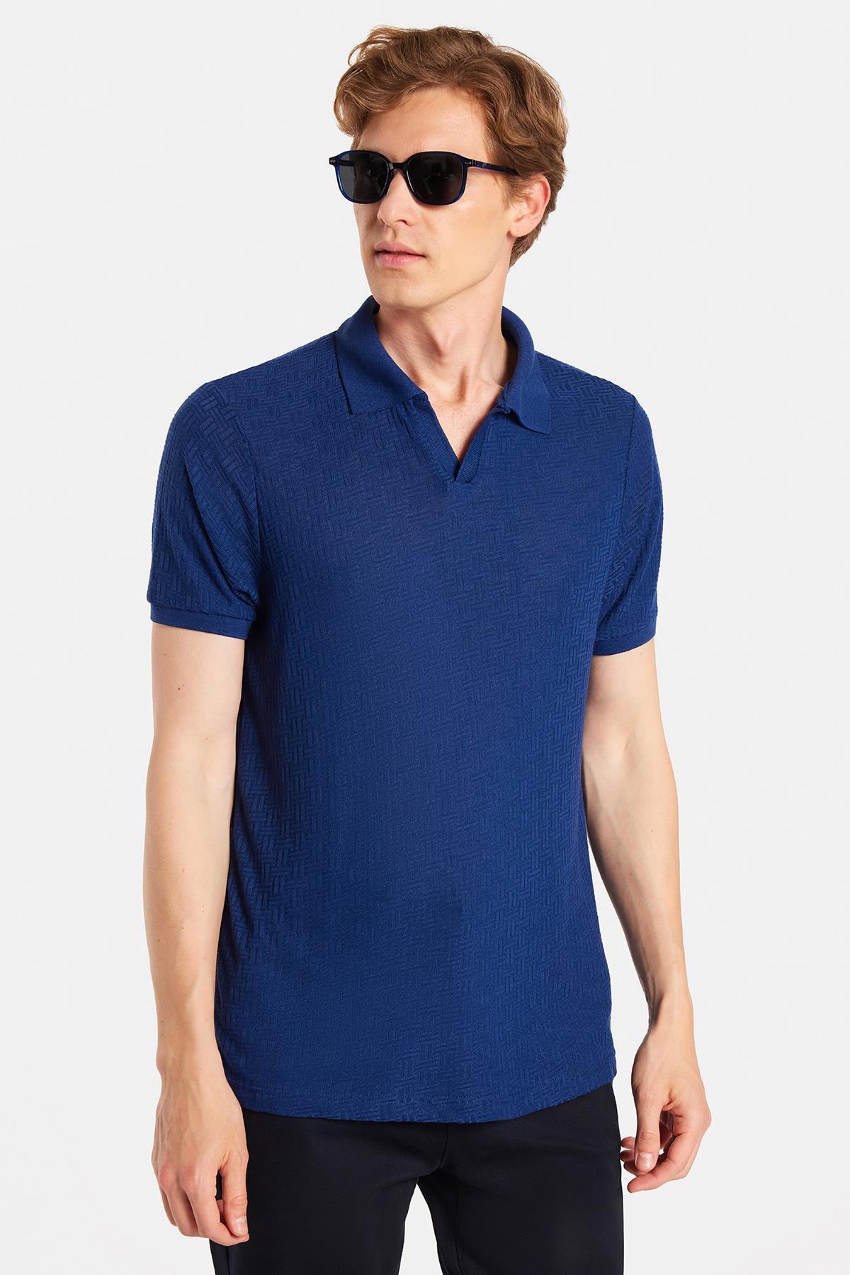 Erkek Slim Fit Dar Kesim Viskon Kumaş Desenli Düz Pike Düğmesiz Lacivert Polo Yaka Tişört (TS250019-47)