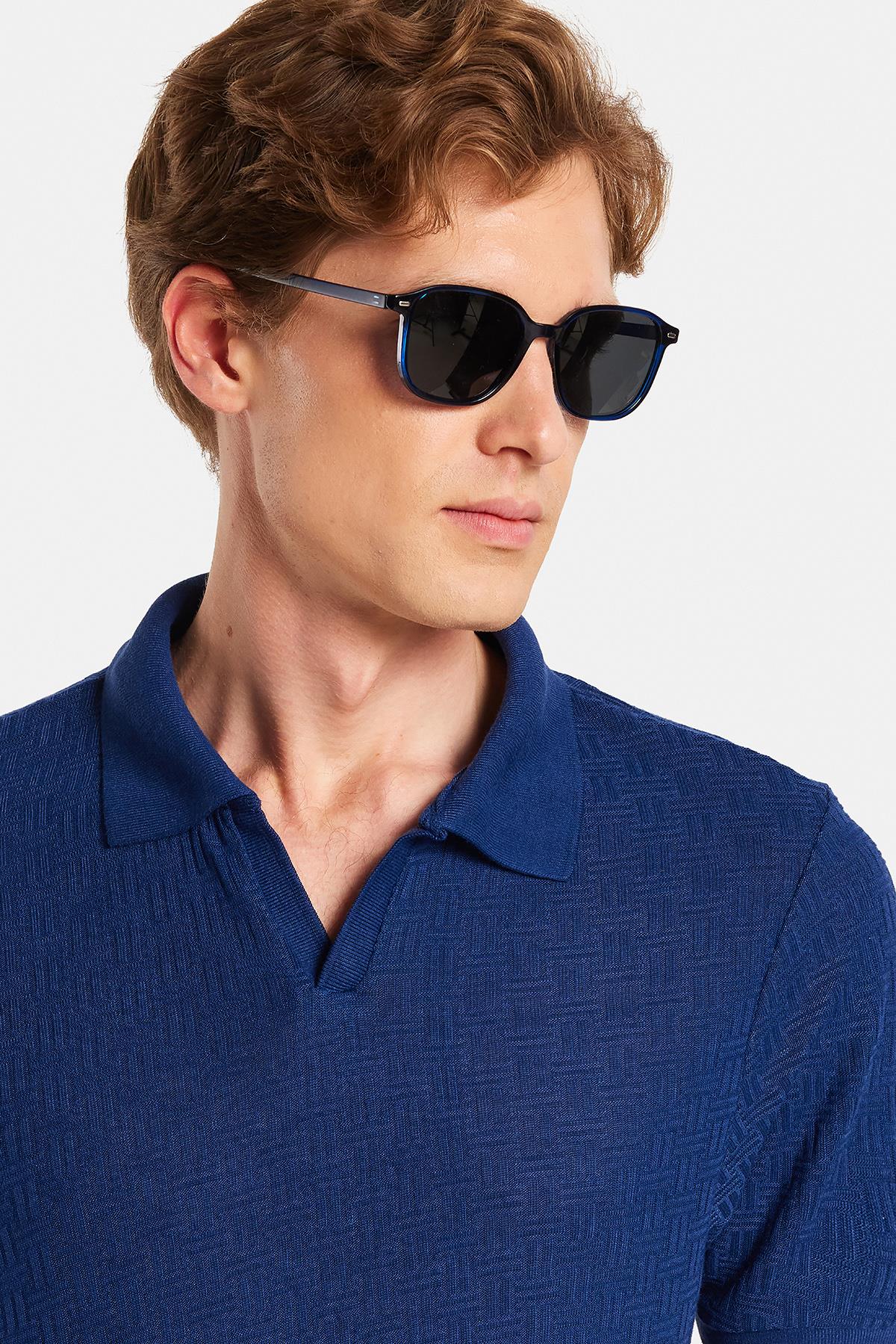 Erkek Slim Fit Dar Kesim Viskon Kumaş Desenli Düz Pike Düğmesiz Lacivert Polo Yaka Tişört