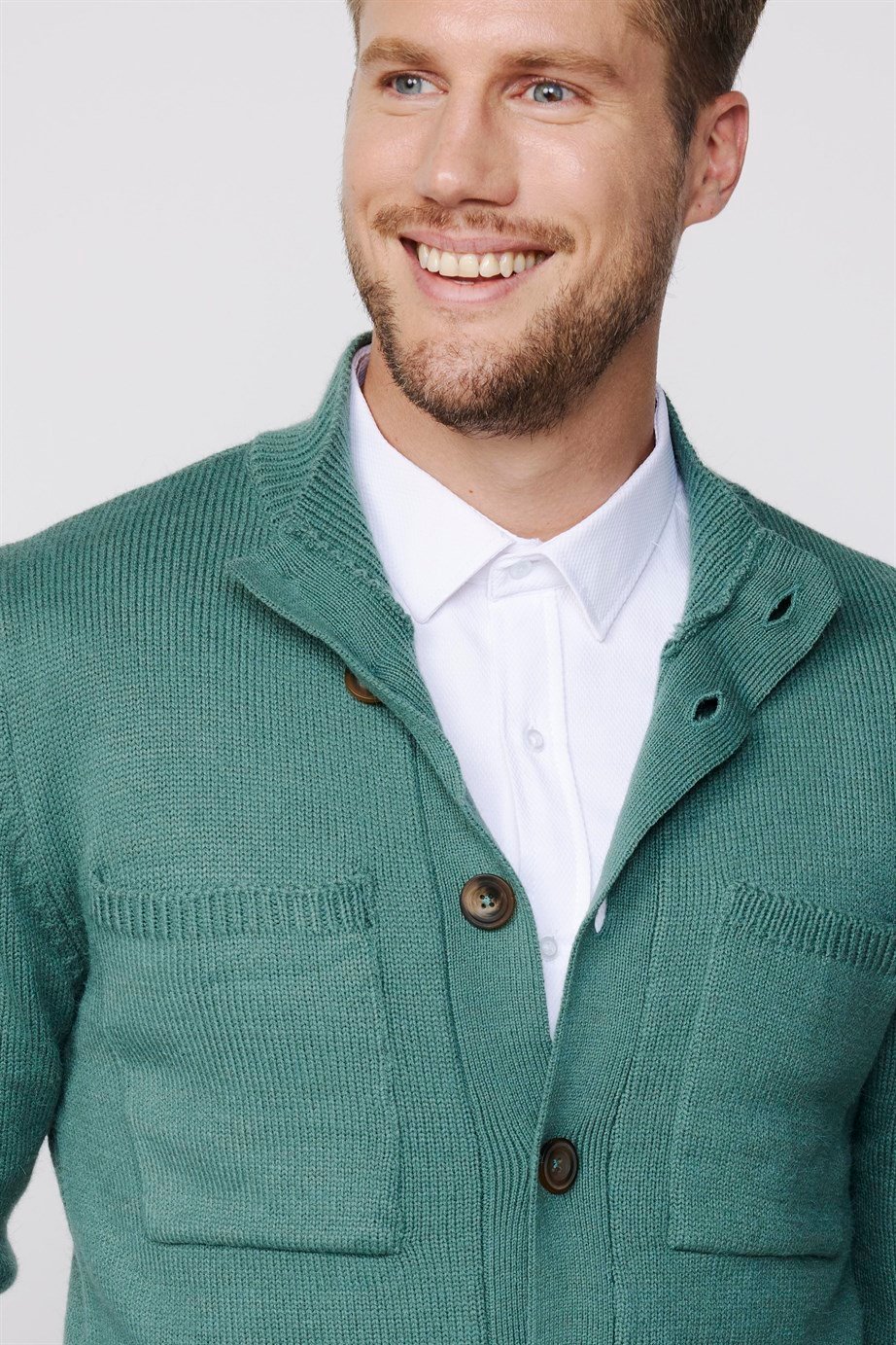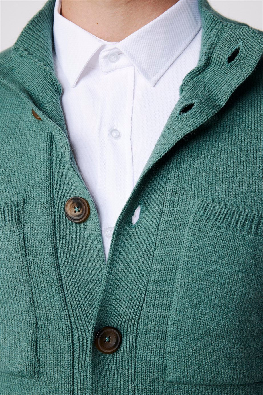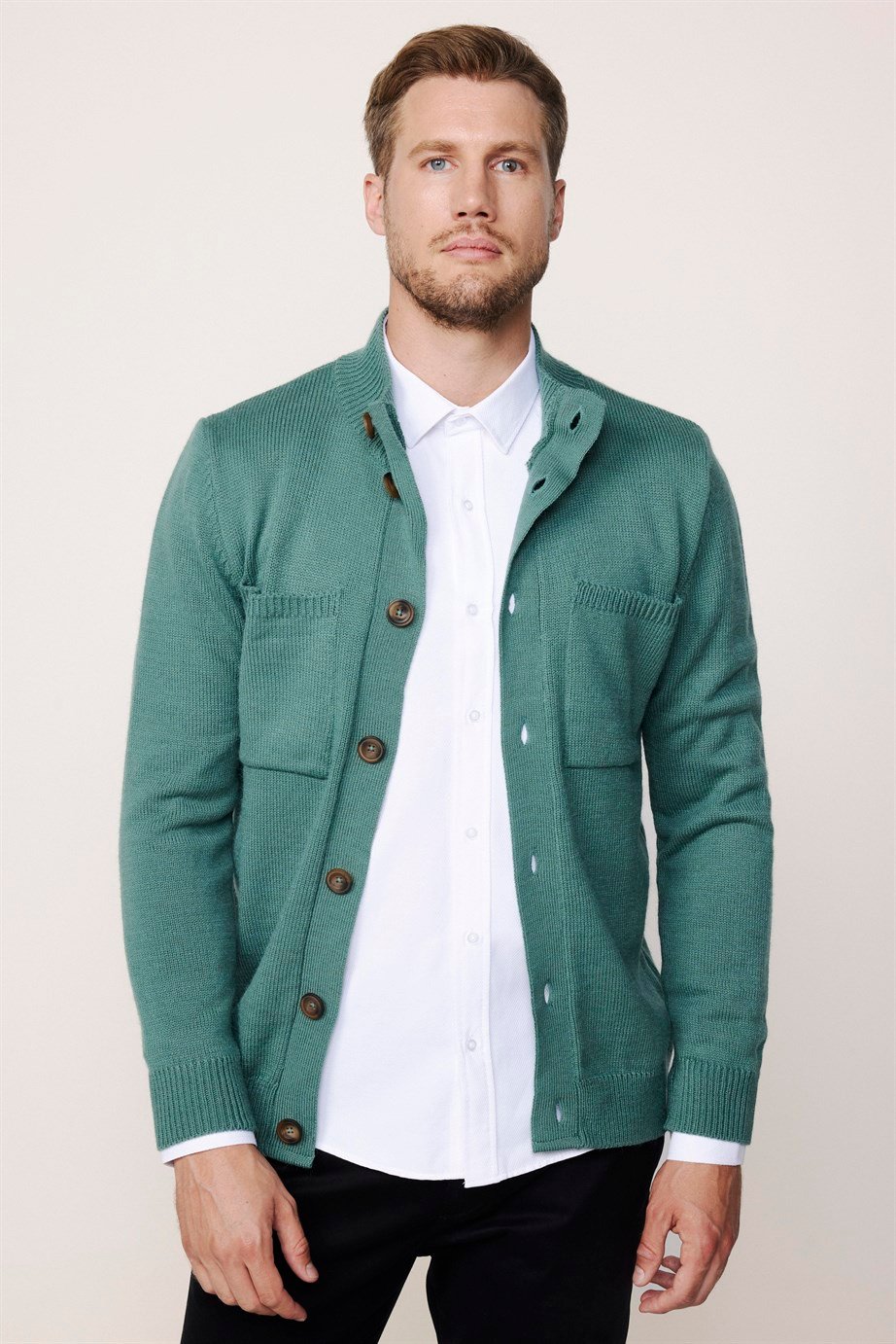 Erkek Slim Fit Dik Yaka Düğmeli Çift Cepli Yeşil Hırka