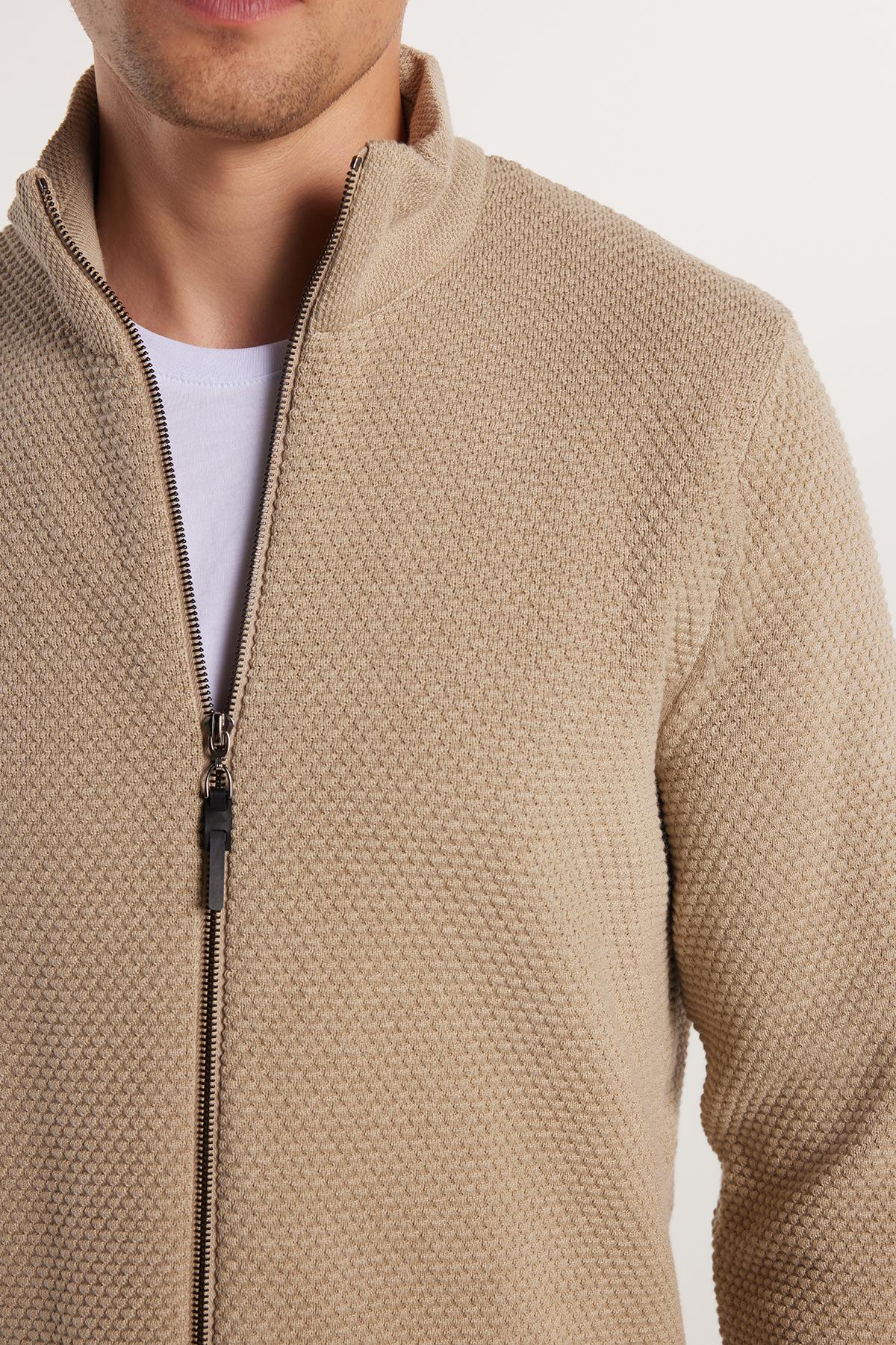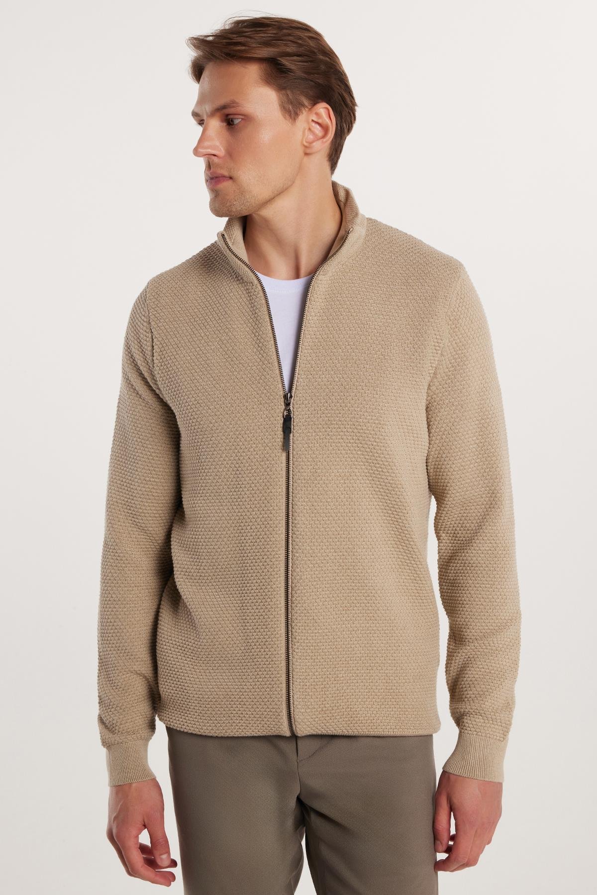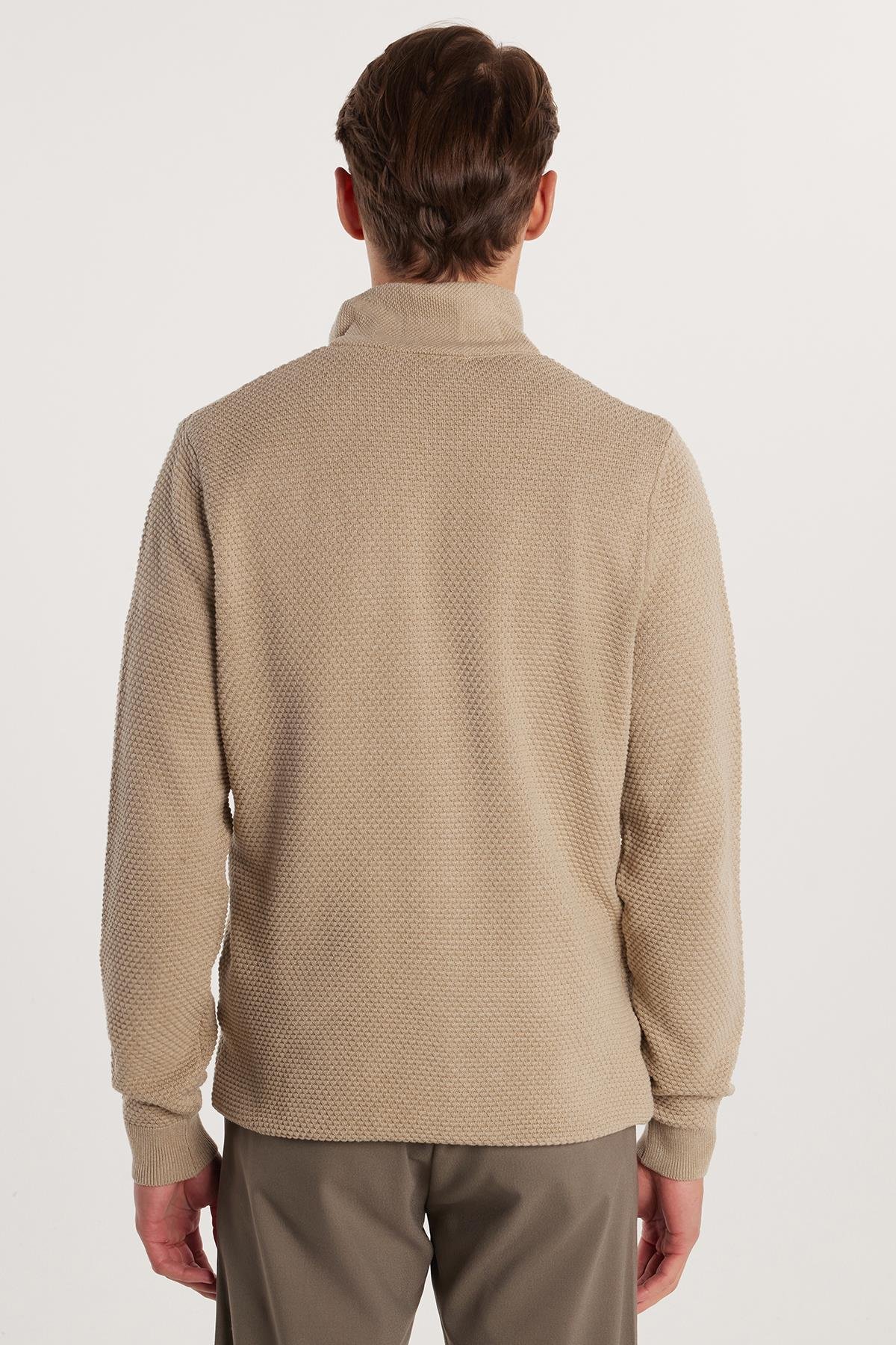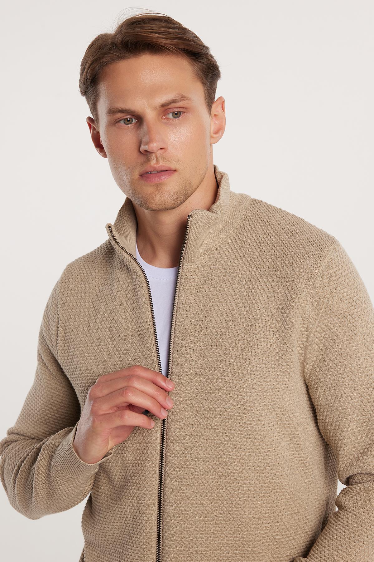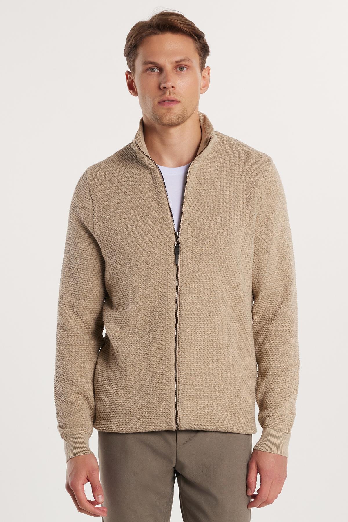 Erkek Standart Fit Normal Kesim Desenli Yarım Balıkçı Yaka Fermuarlı Bej Hırka (HR200007-LM01)