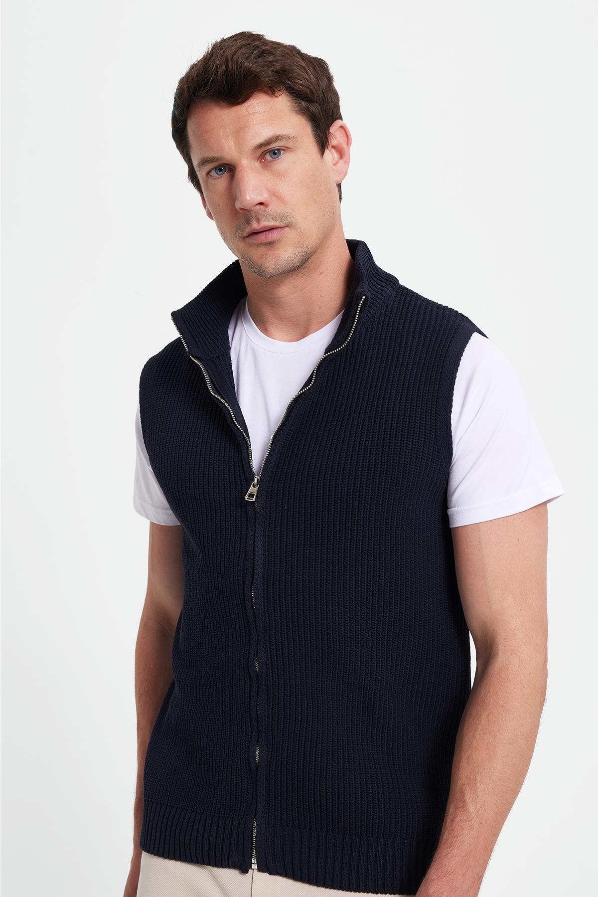 Erkek Standart Fit Normal Kesim Fermuarlı Dik Yaka Sıcak Tutan Lacivert Triko Yelek (YL250011-47)