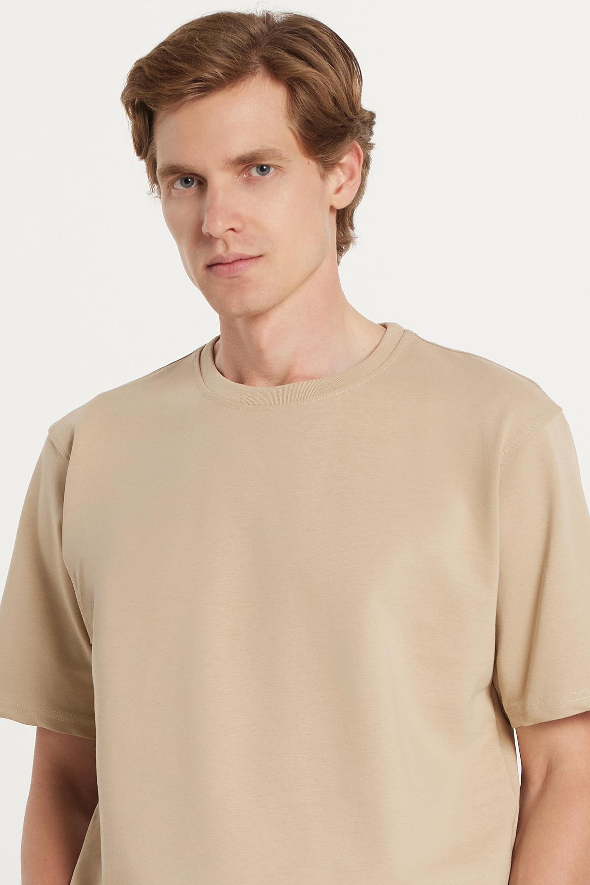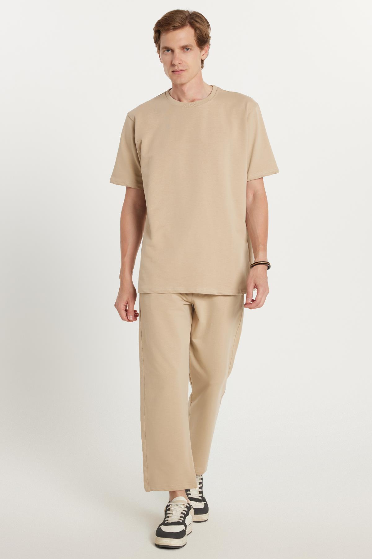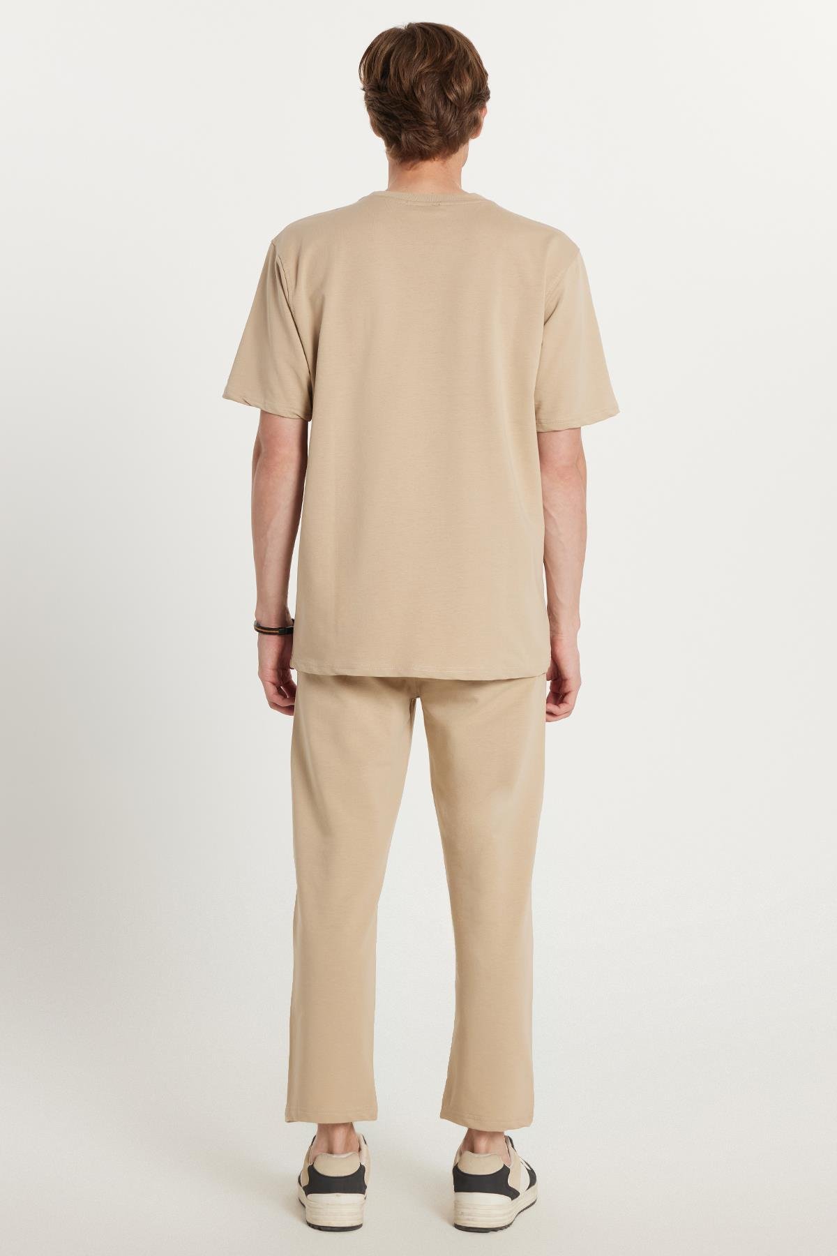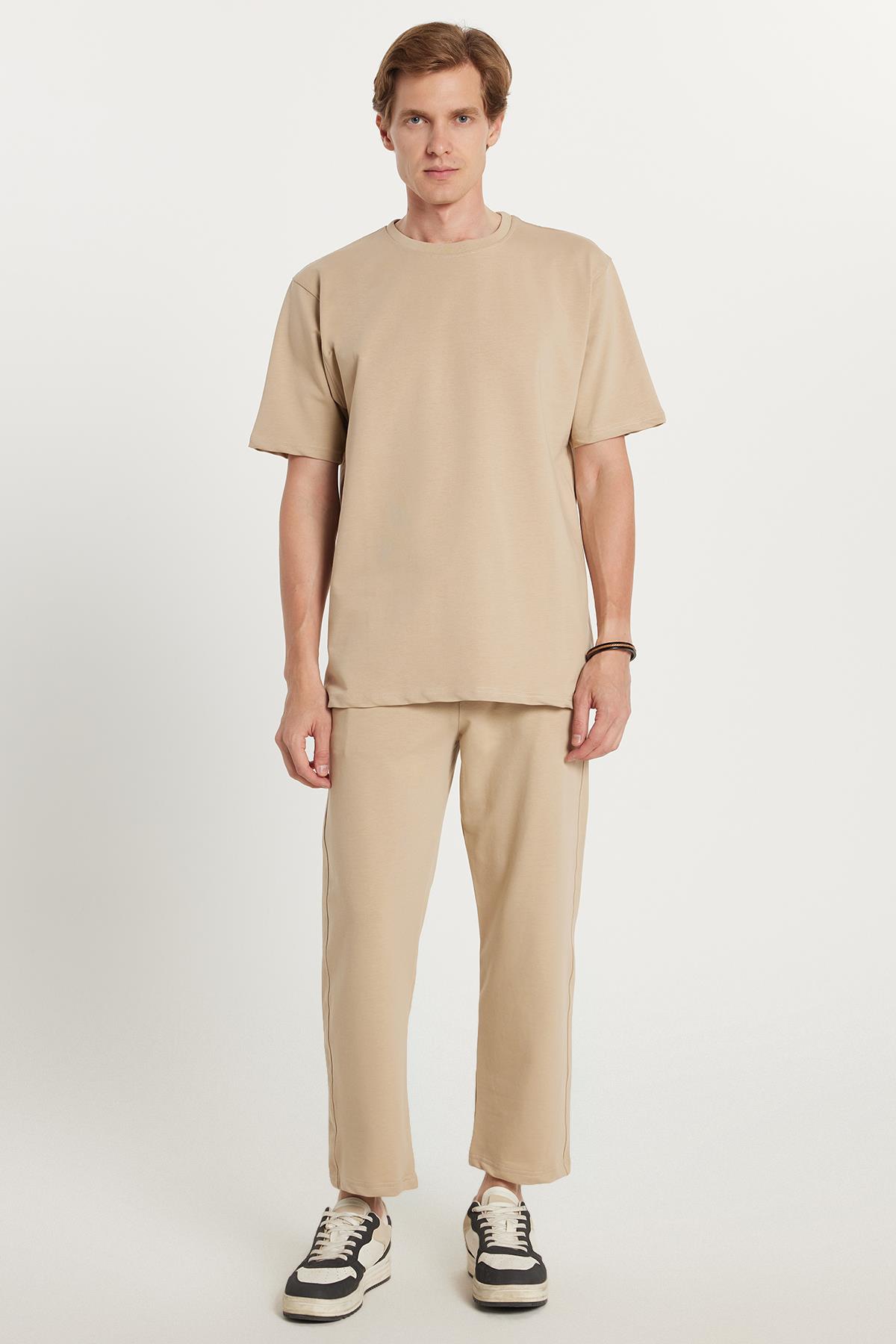 Erkek Standart Fit Normal Kesim Pamuklu Bisiklet Yaka Beli Bağcıklı Ekru Eşofman Takımı (AUT25016-84)