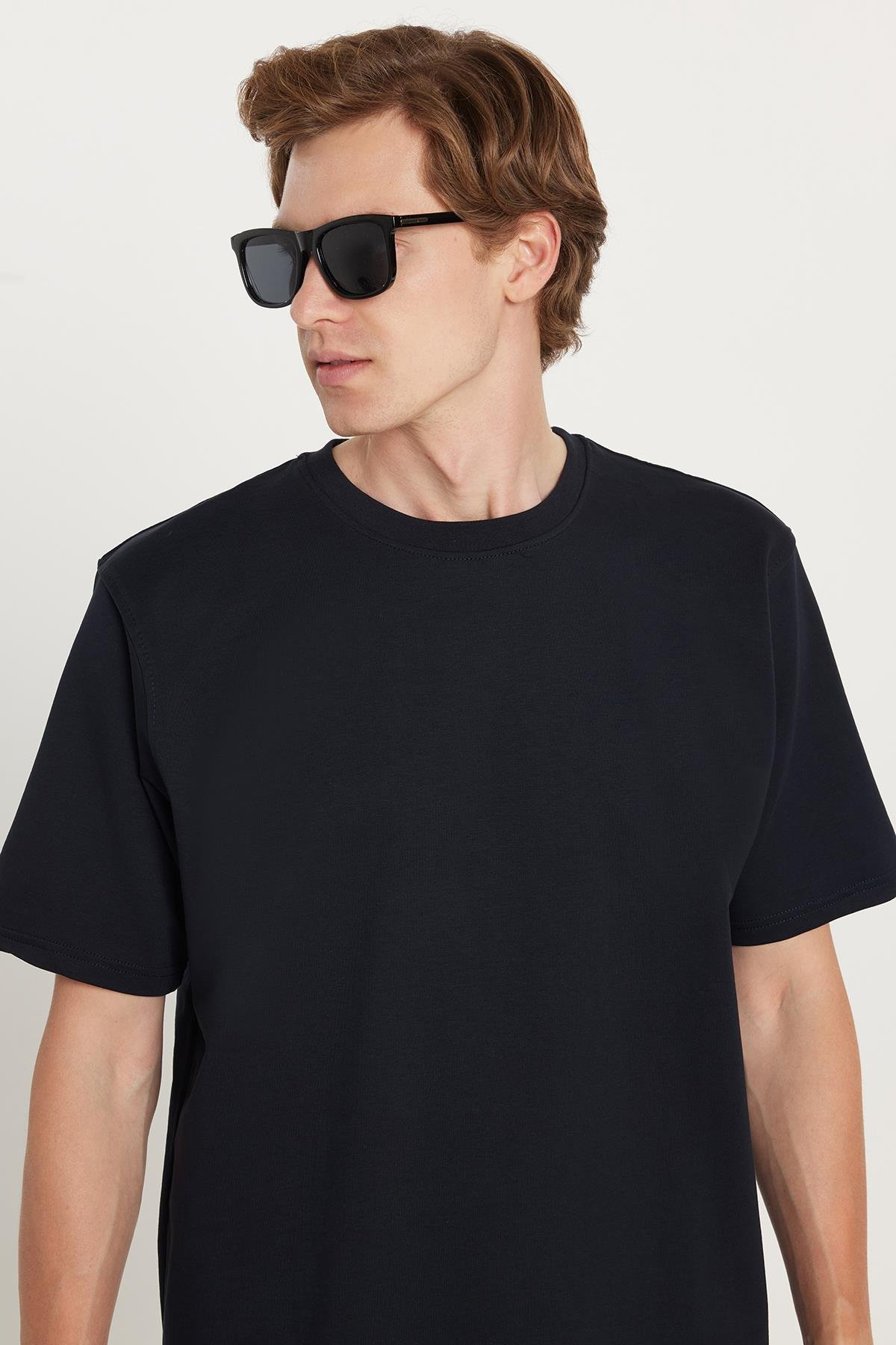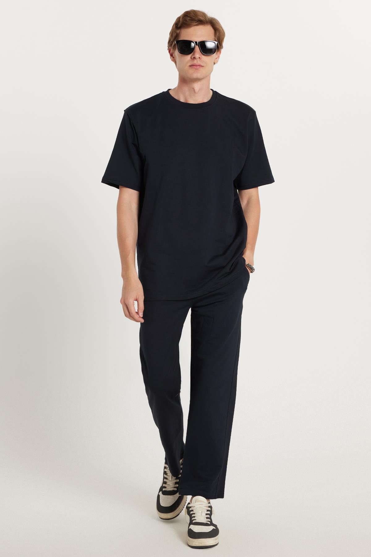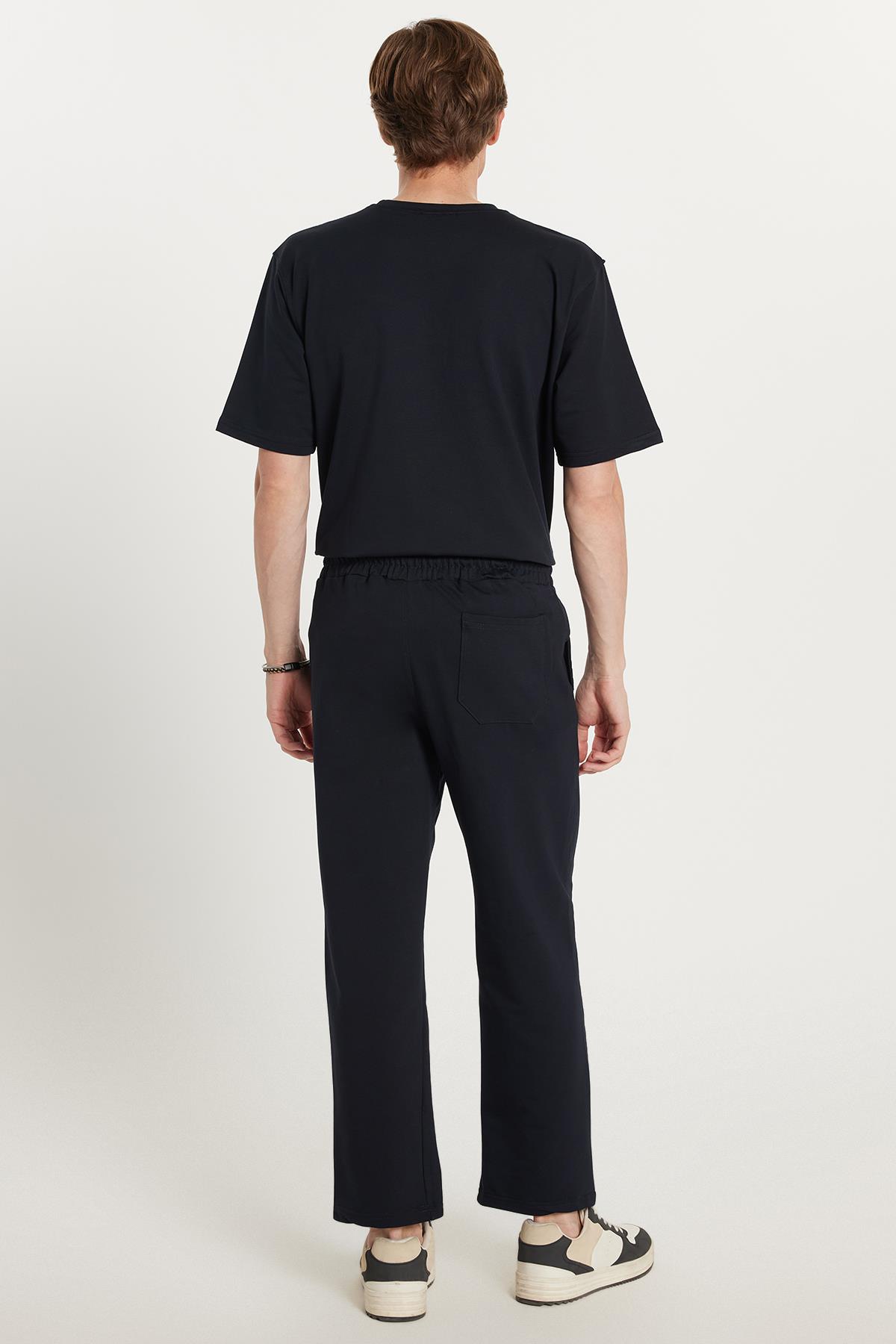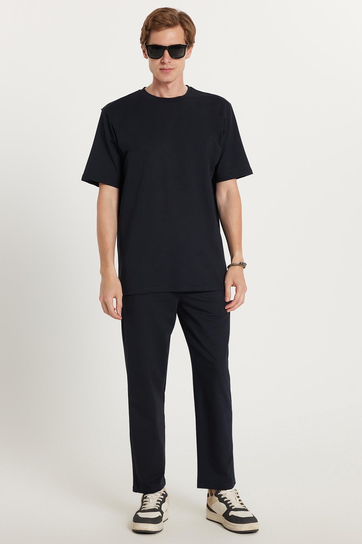 Erkek Standart Fit Normal Kesim Pamuklu Bisiklet Yaka Beli Bağcıklı Lacivert Eşofman Takımı (AUT25016-47)