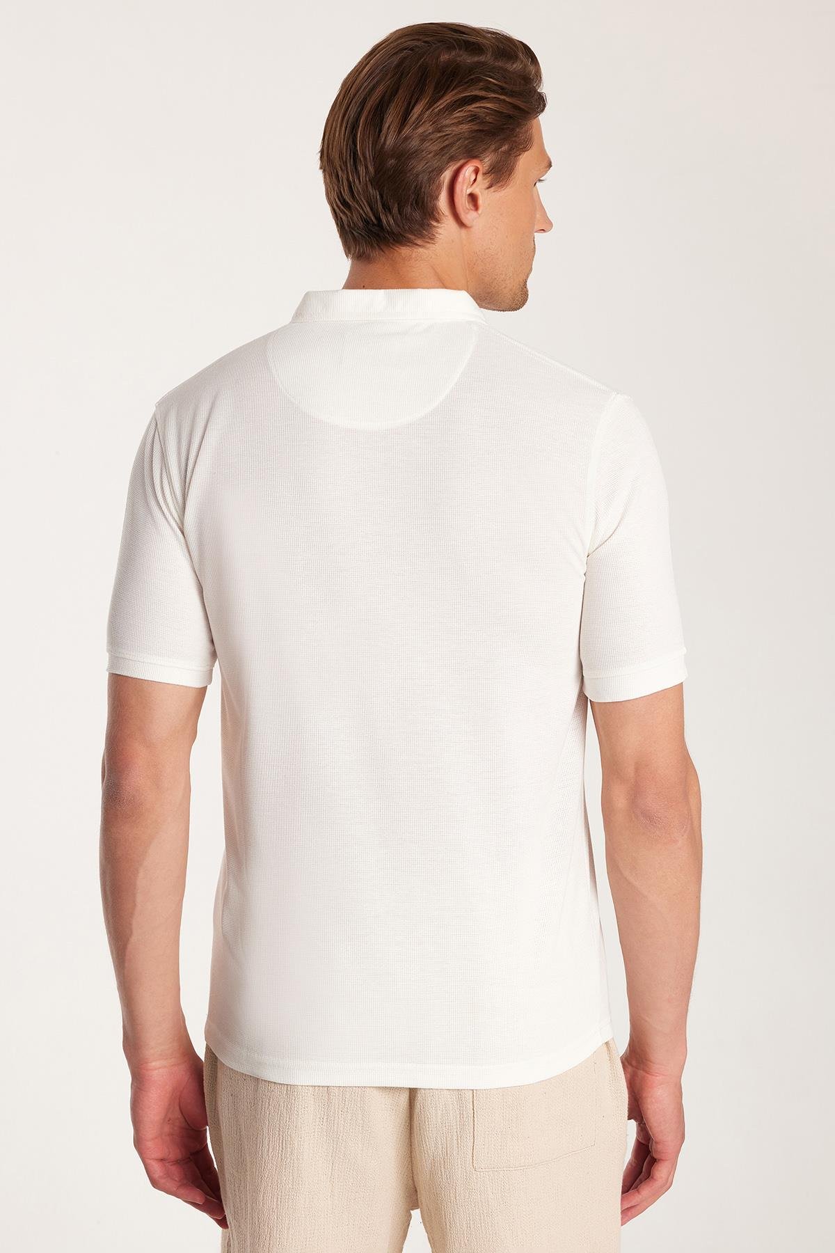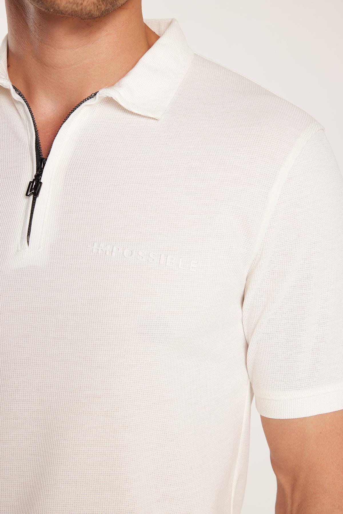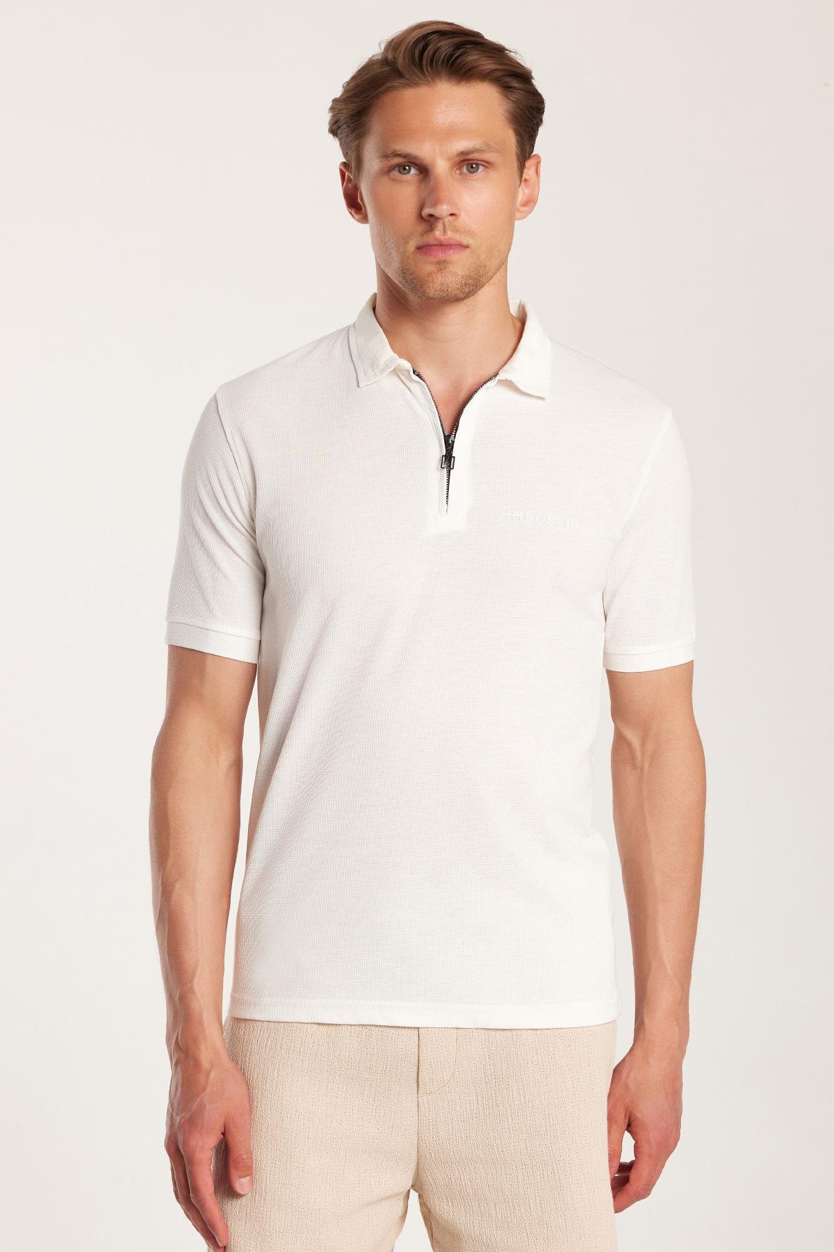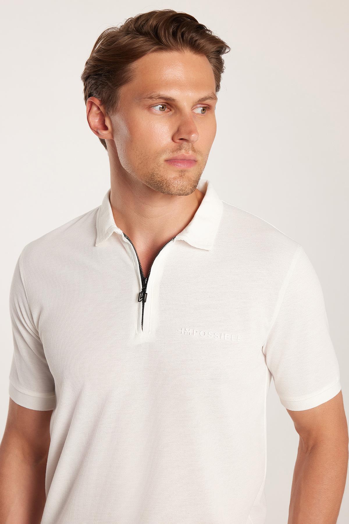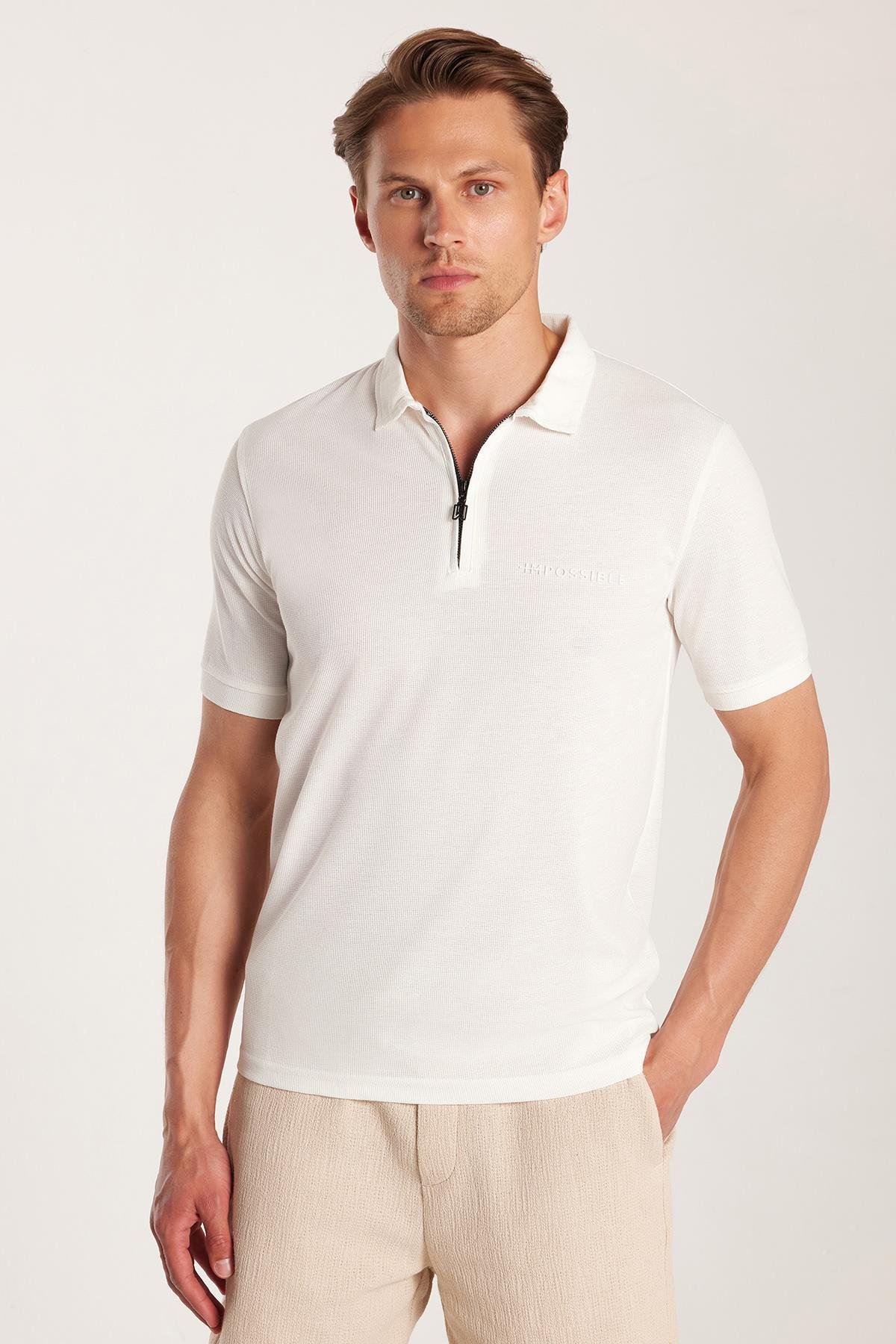Erkek Standart Fit Normal Kesim Pamuklu Fermuarlı Baskılı Basic Beyaz Polo Yaka Tişört (TS250020-01)