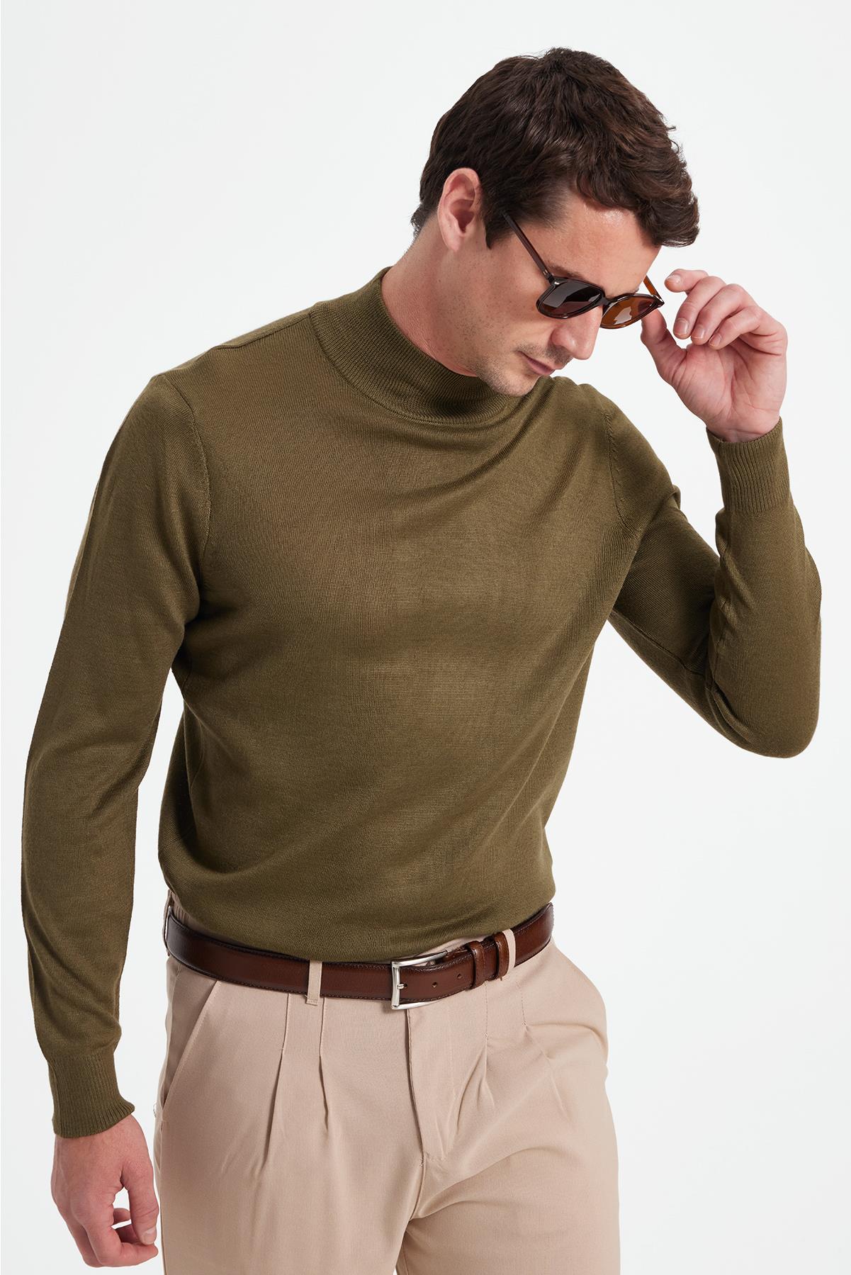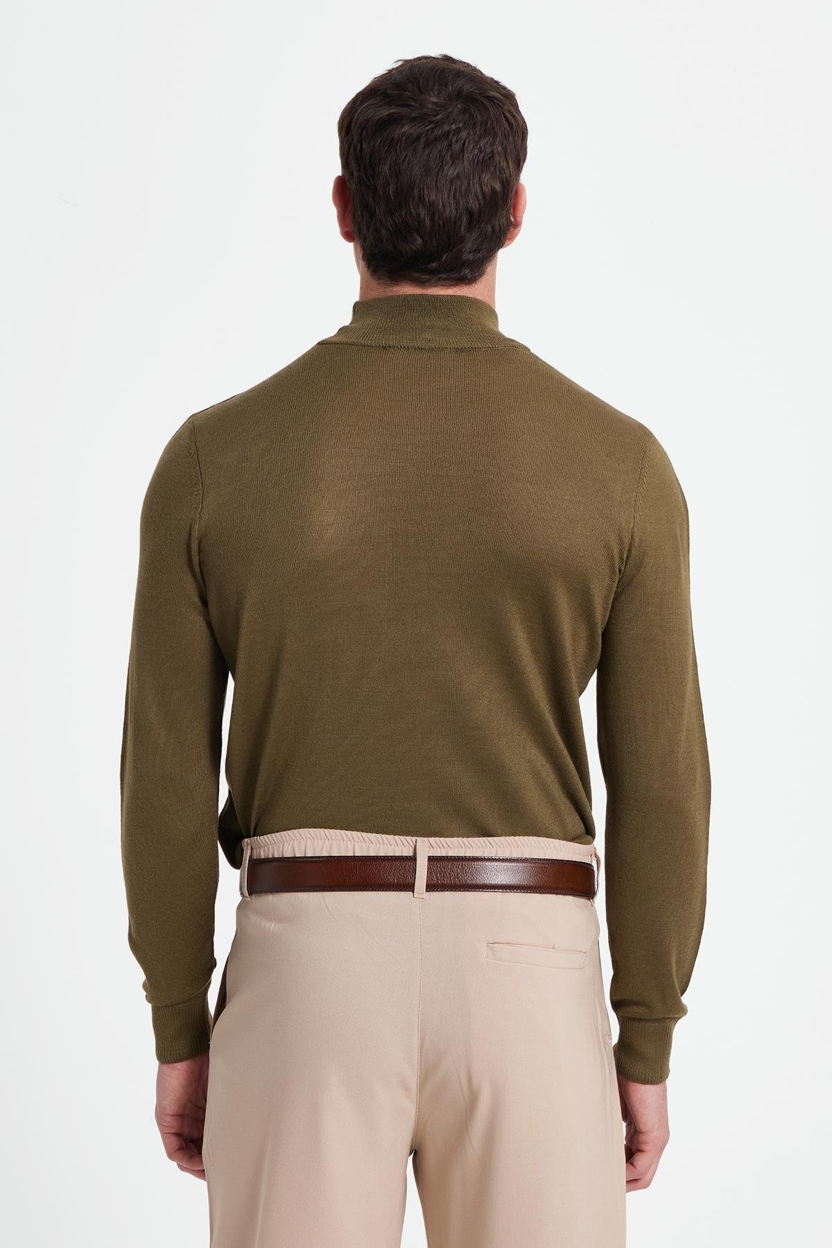 Erkek Standart Fit Normal Kesim Yarım Balıkçı Yaka Düz Haki Triko Kazak (KZ15023-ACK)