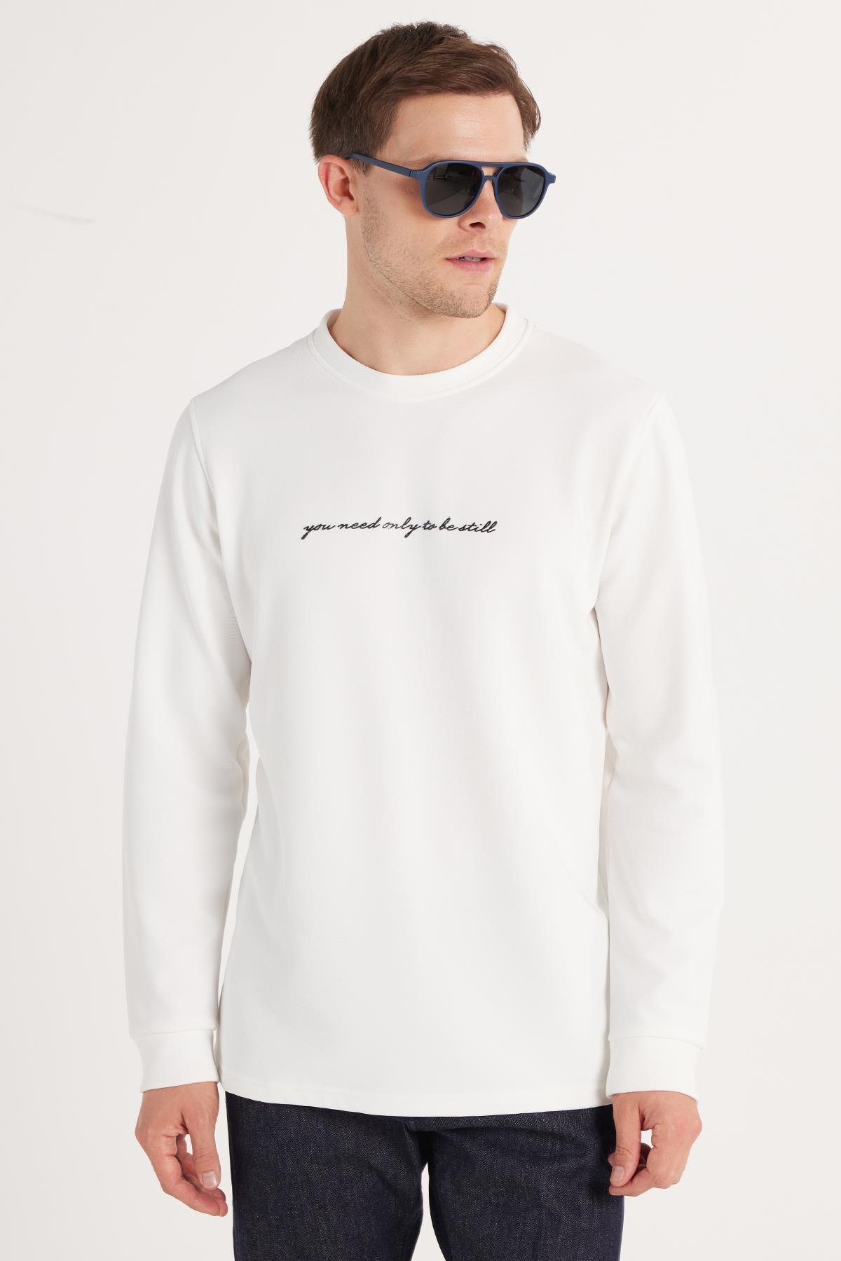 Erkek Standart Fit Pamuklu Bisiklet Yaka Şardonlu Baskılı Beyaz Sweatshirt