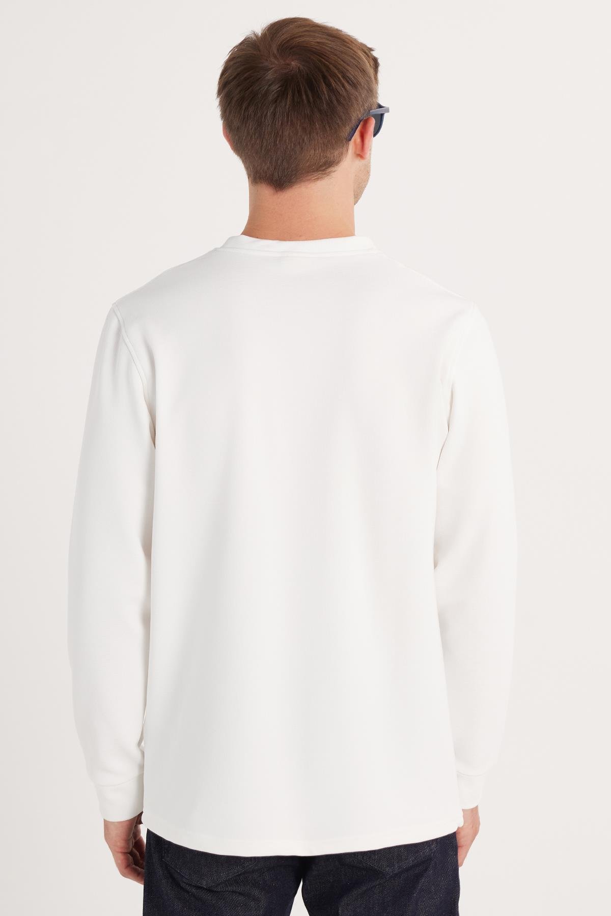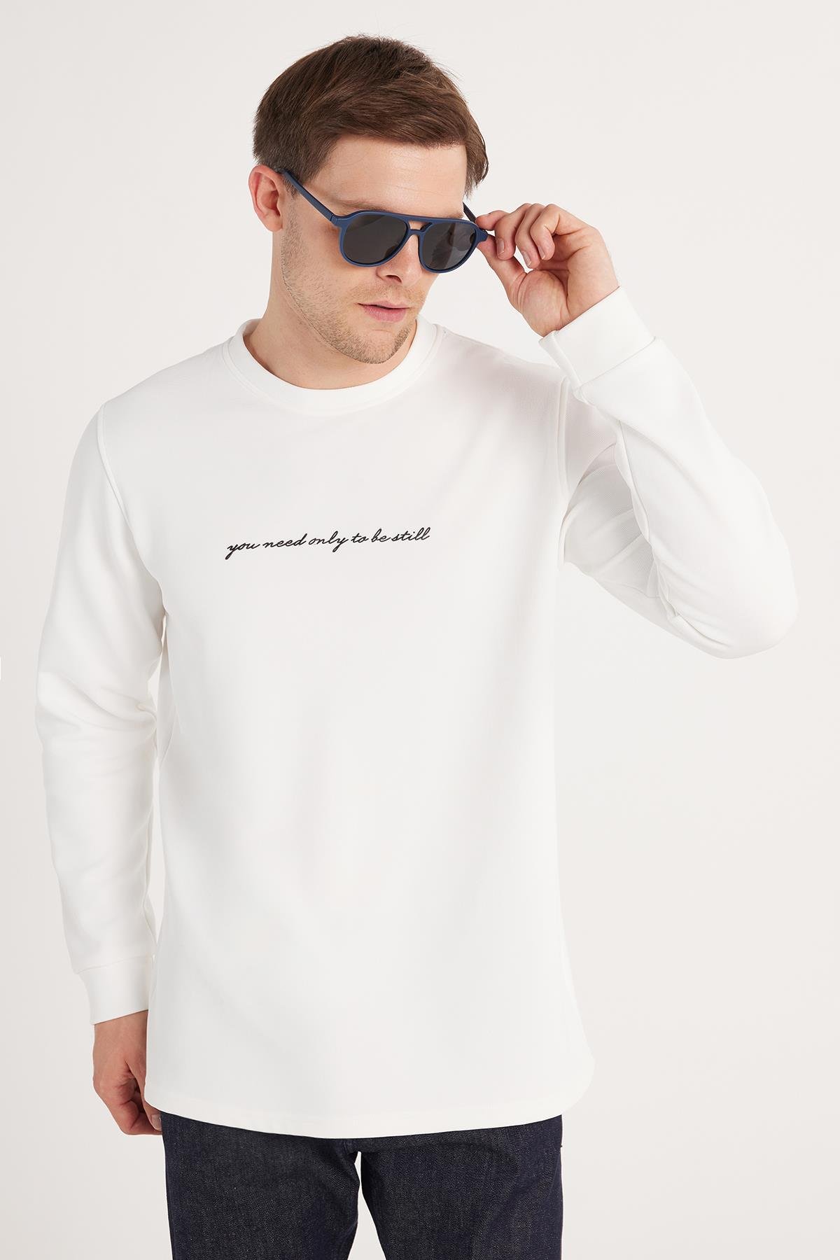 Erkek Standart Fit Pamuklu Bisiklet Yaka Şardonlu Baskılı Beyaz Sweatshirt  (SW250018-01)