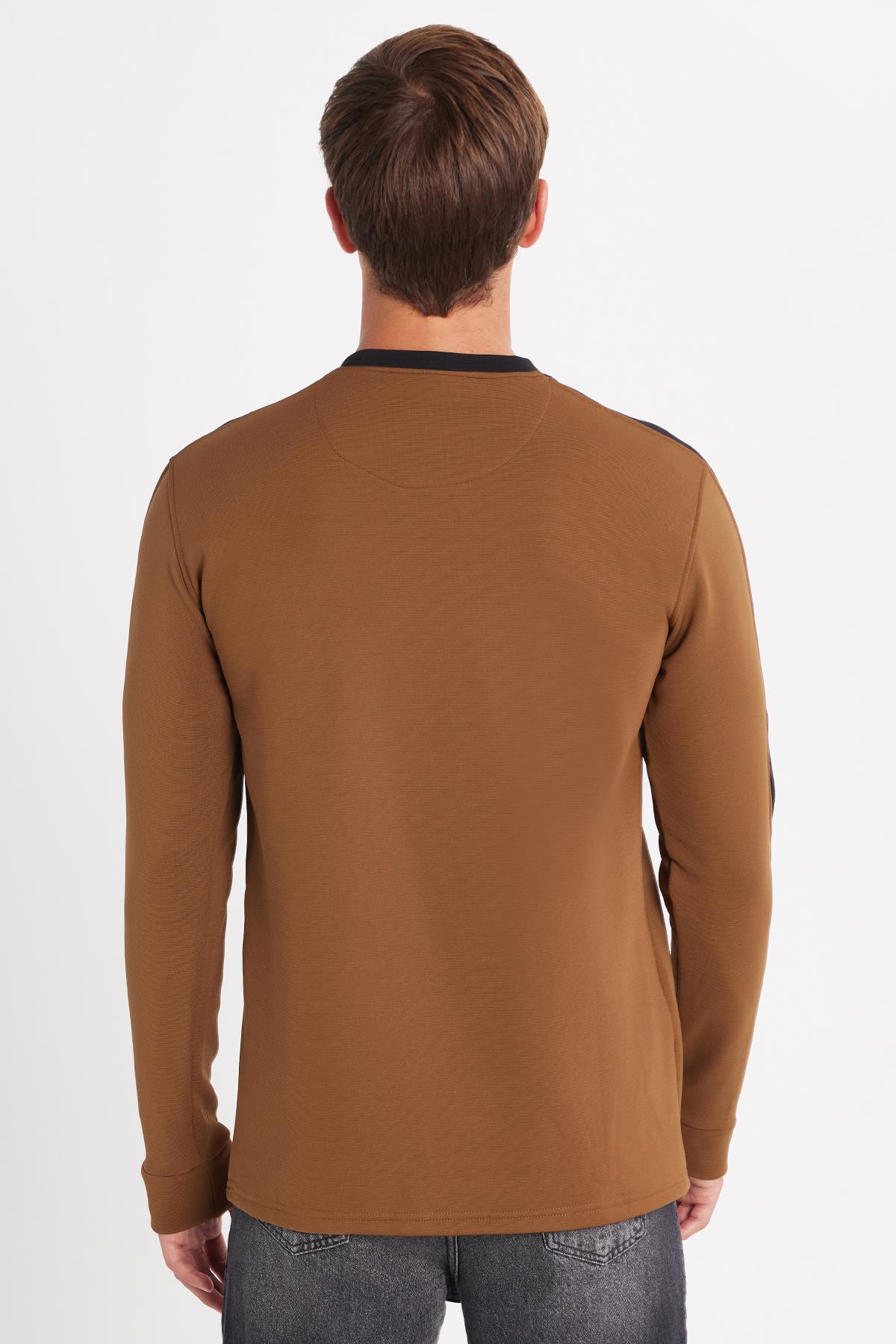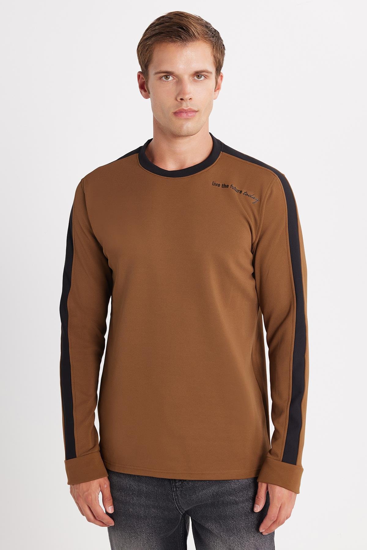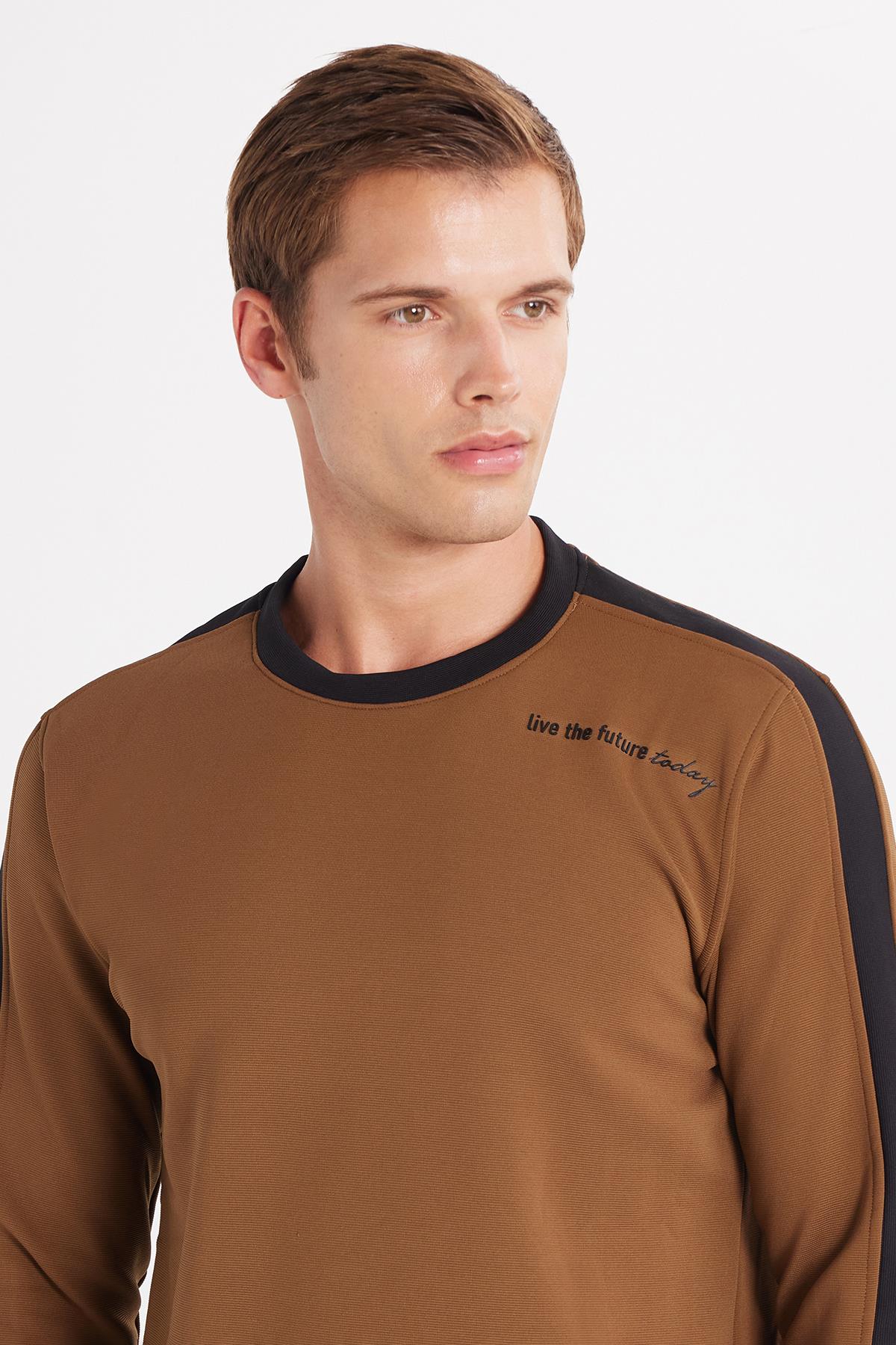 Erkek Standart Fit Pamuklu Jakarlı Bisiklet Yaka Baskılı Kahverengi Sweatshirt (SW250020-07)