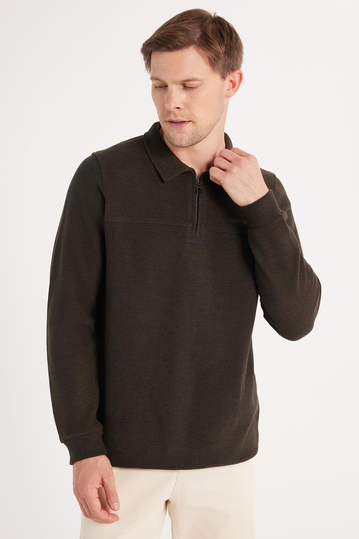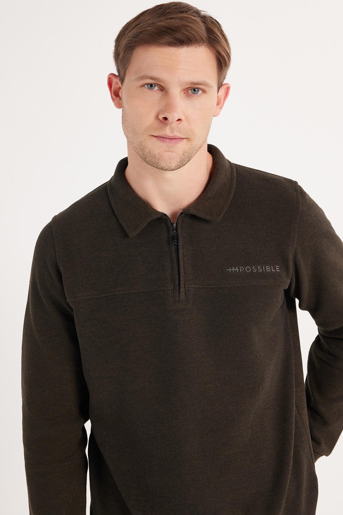 Erkek Standart Fit Pamuklu Selanik Kumaş Yarım Fermuarlı Polo Yaka Baskılı Kahverengi Sweatshirt (SW250017-07)