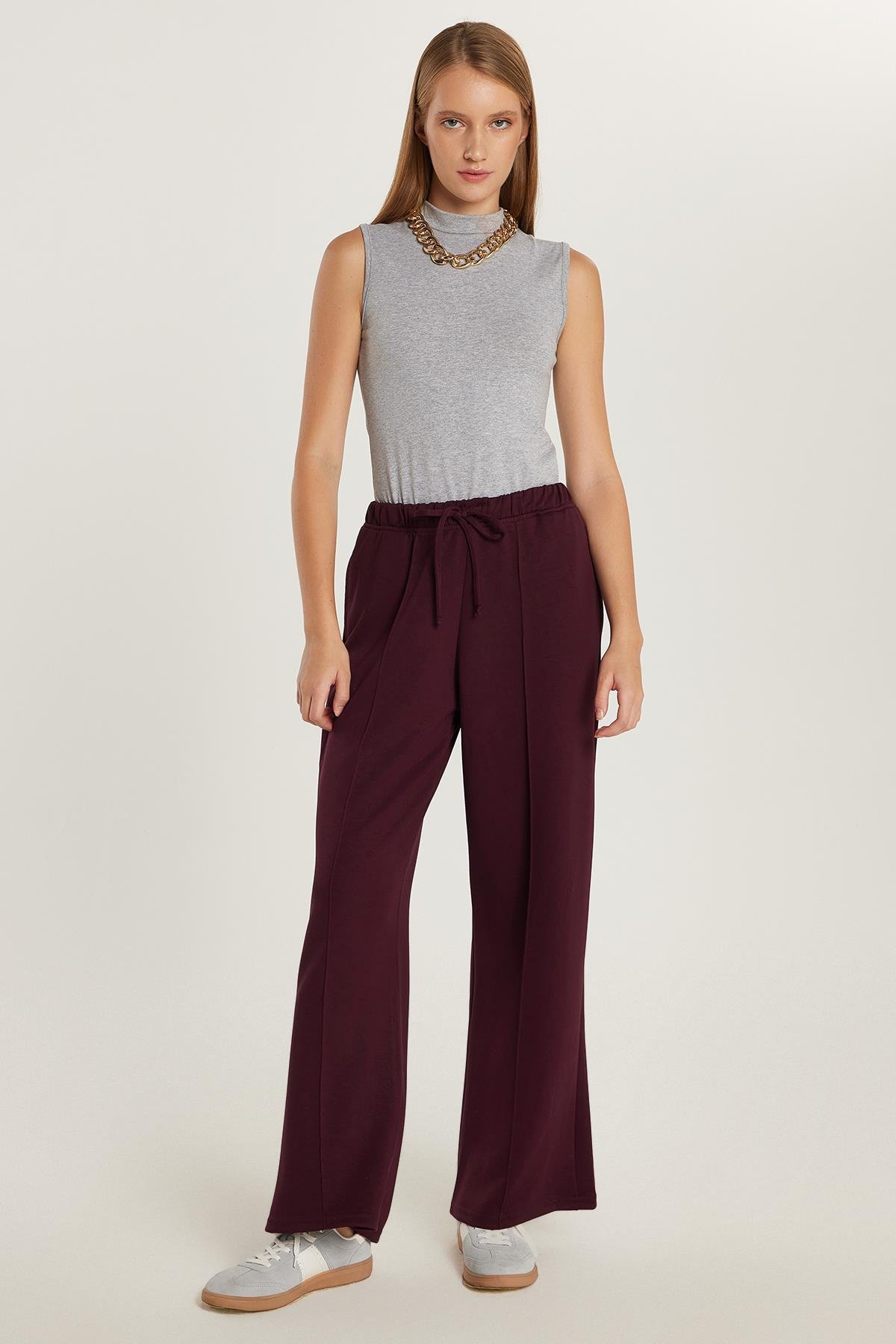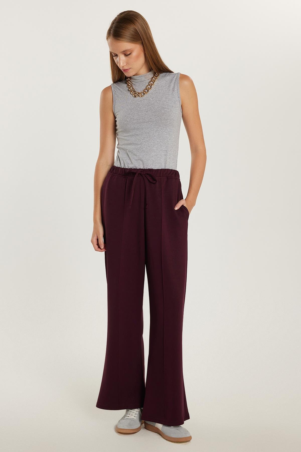 Kadın Modal Kumaş Relax Fit Beli Lastikli Bağlamalı Bordo Pantolon (KDN25006-8)