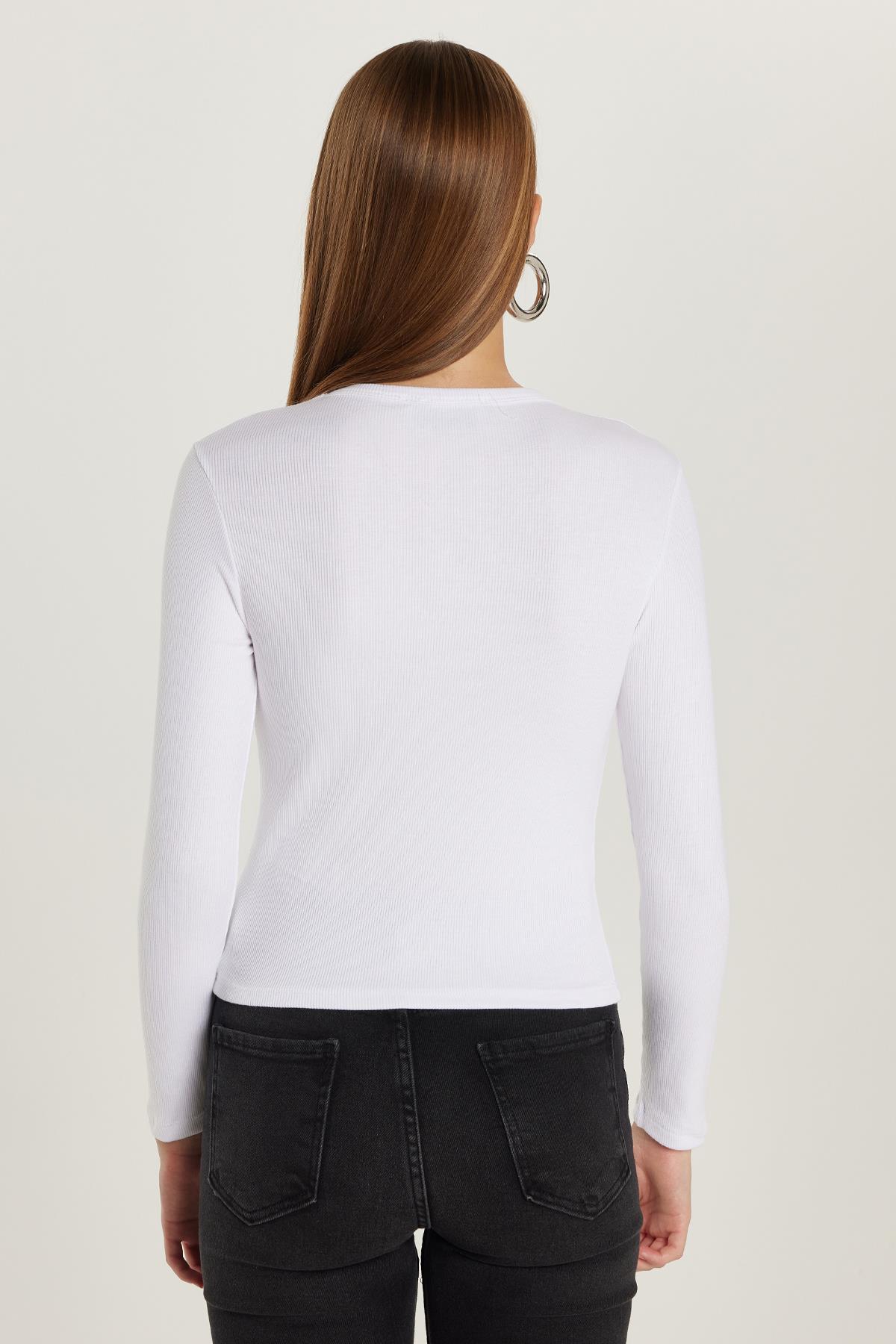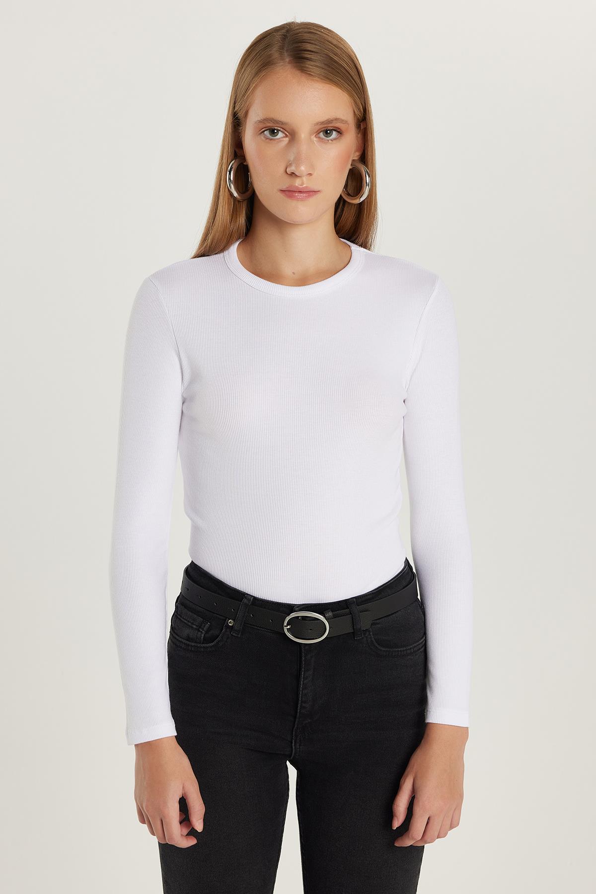 Kadın Modal Kumaş Slim Fit Dar Kesim Bisiklet Yaka Beyaz Bluz