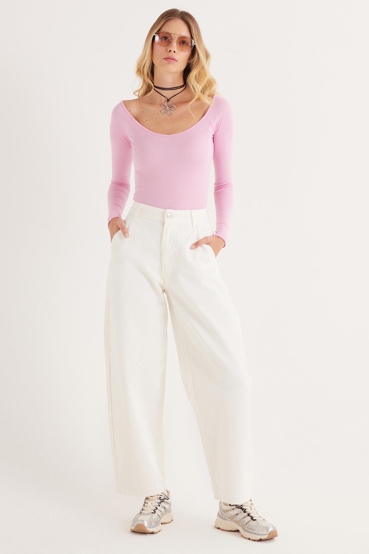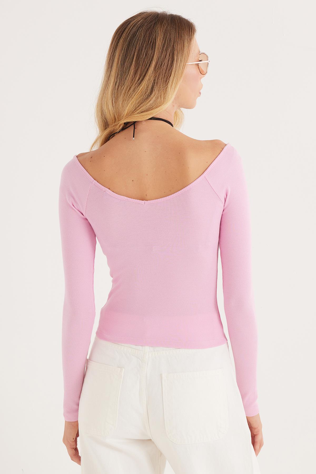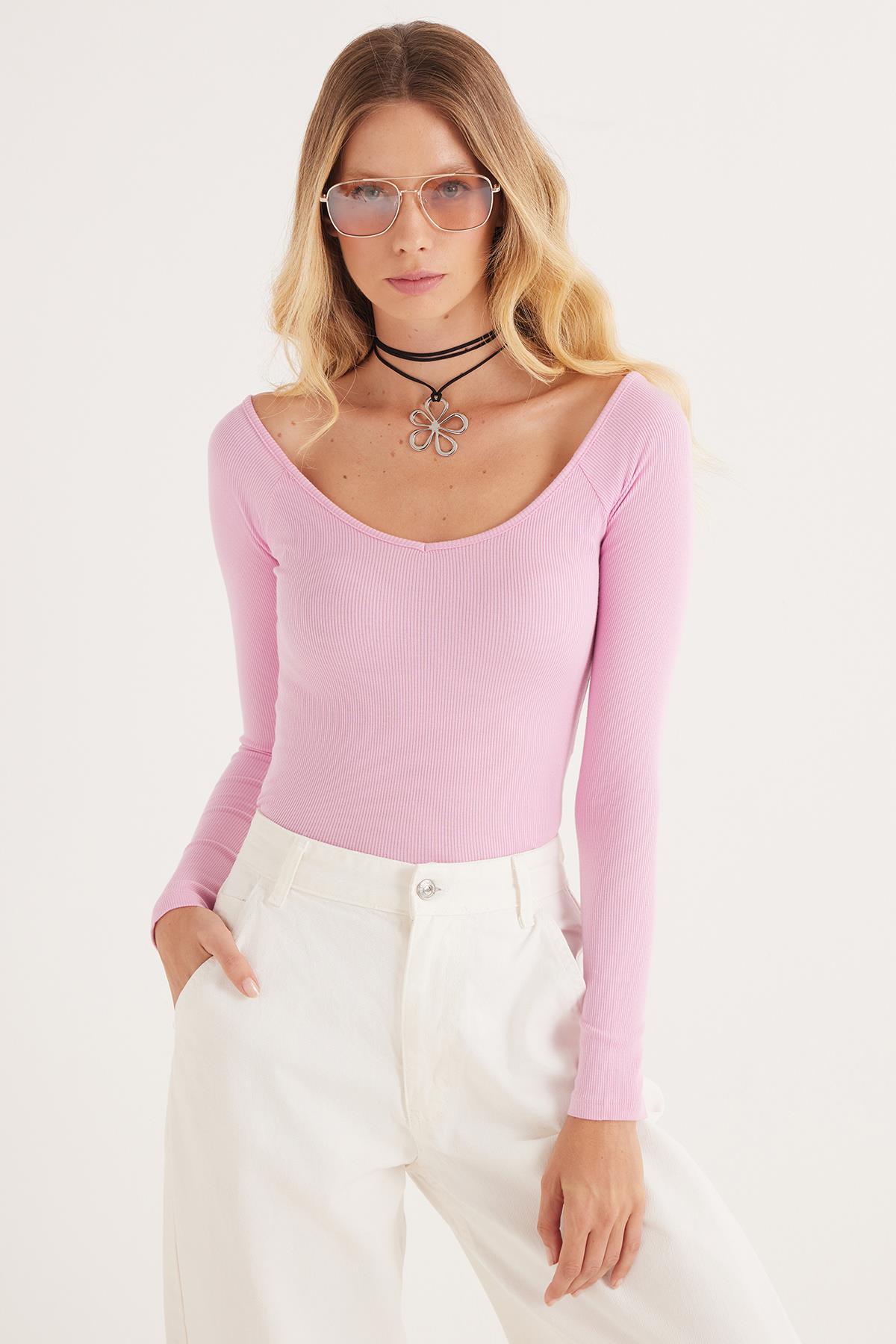 Kadın Modal Kumaş Slim Fit Dar Kesim Uzun Kollu Kayık Yaka Pembe Bluz