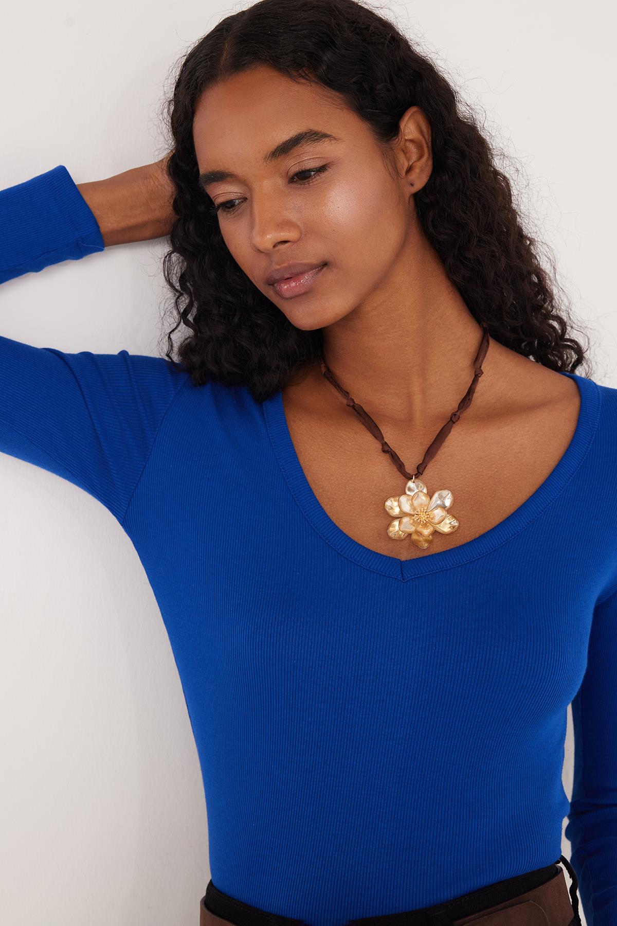 Kadın Modal Kumaş Slim Fit Pamuklu Düz V Yaka Mavi Bluz