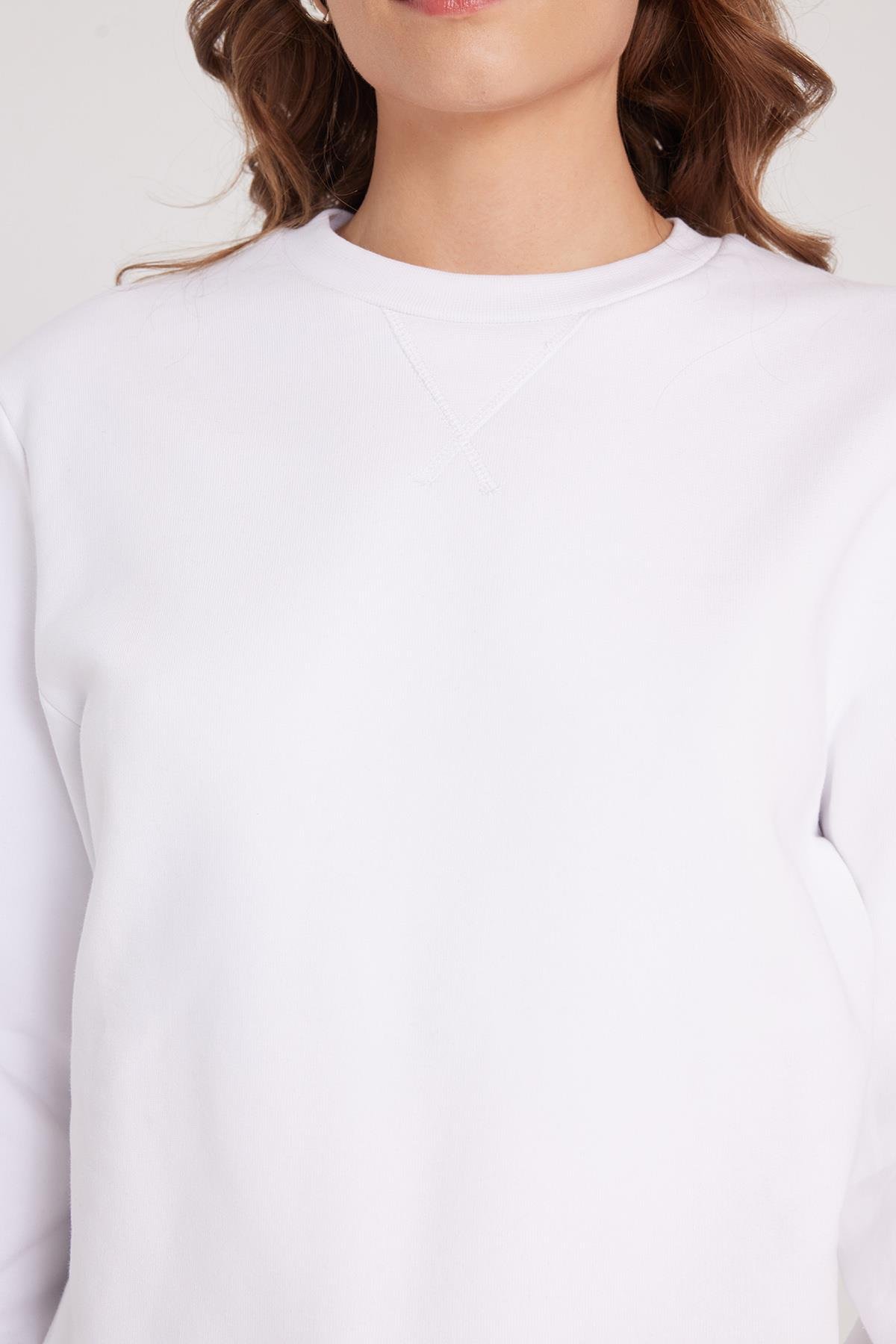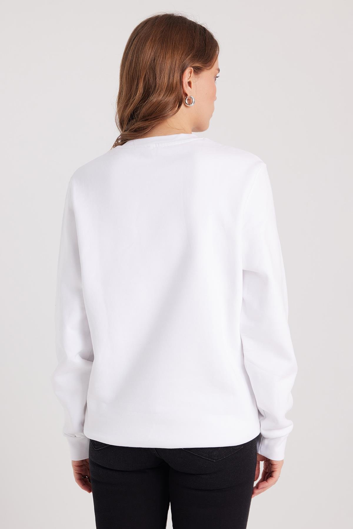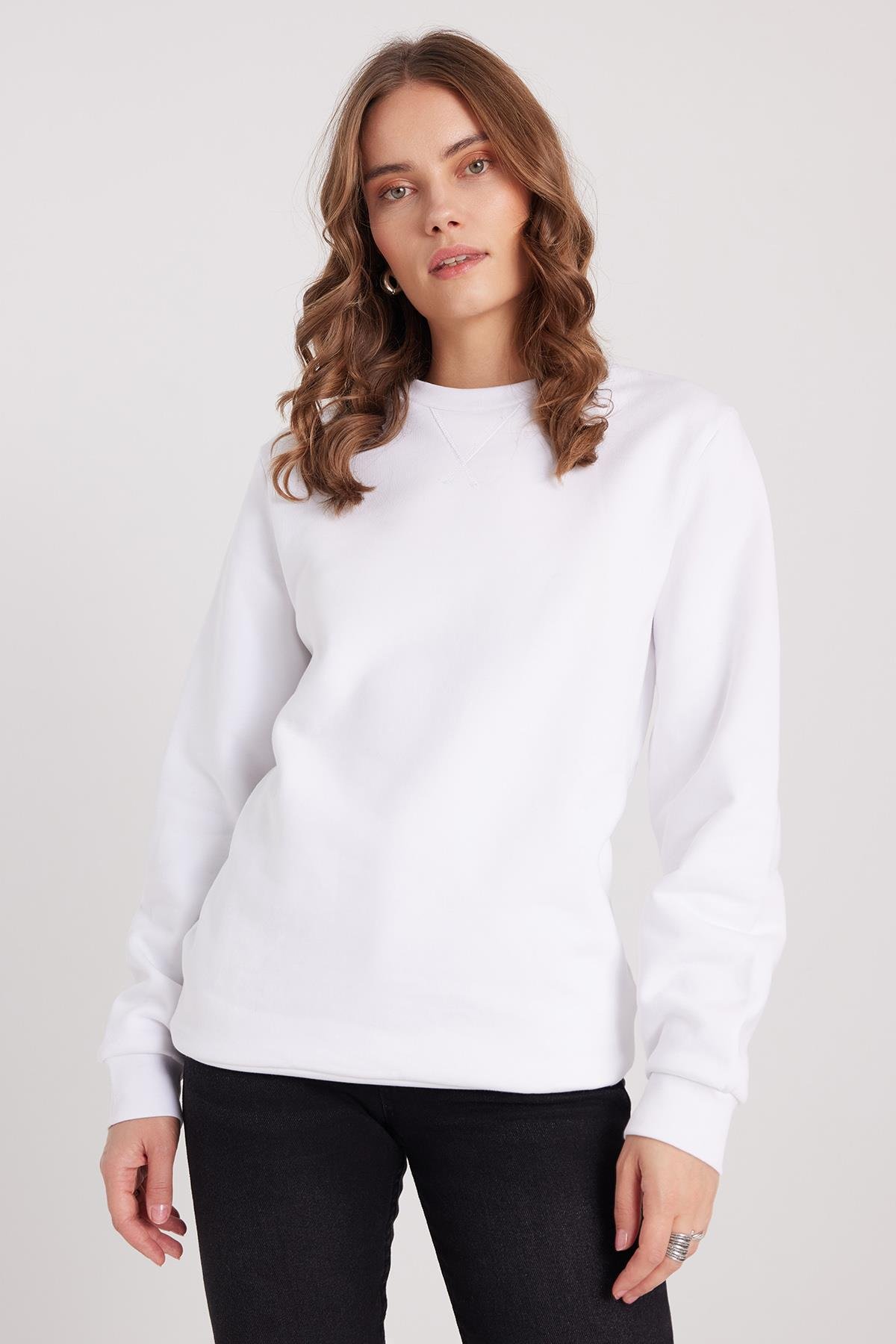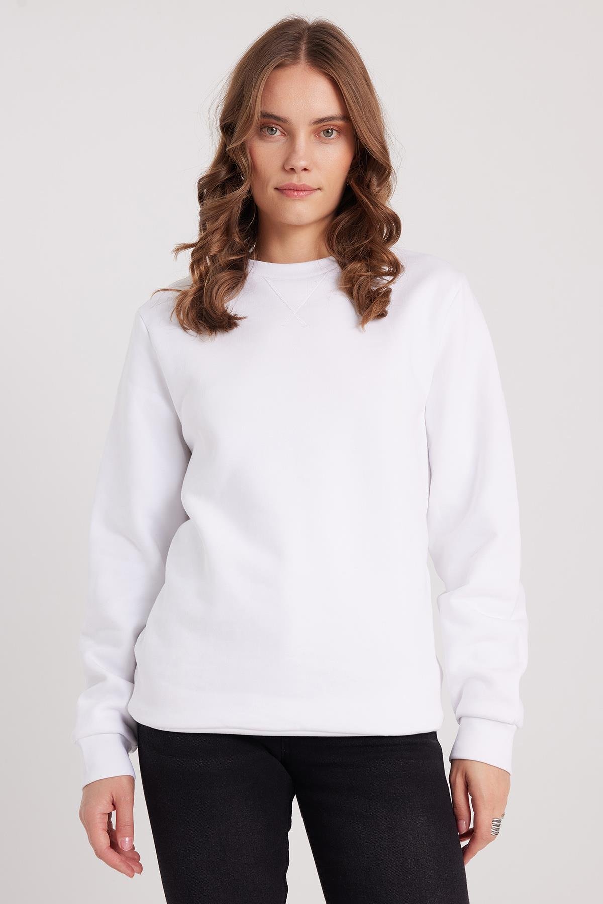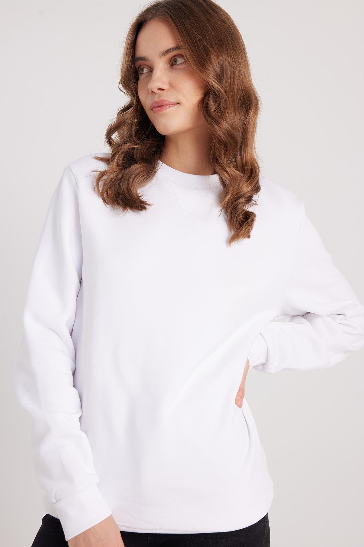 Kadın Oversize Geniş Kesim %100 Pamuk Basic Beyaz Bisiklet Yaka Sweatshirt