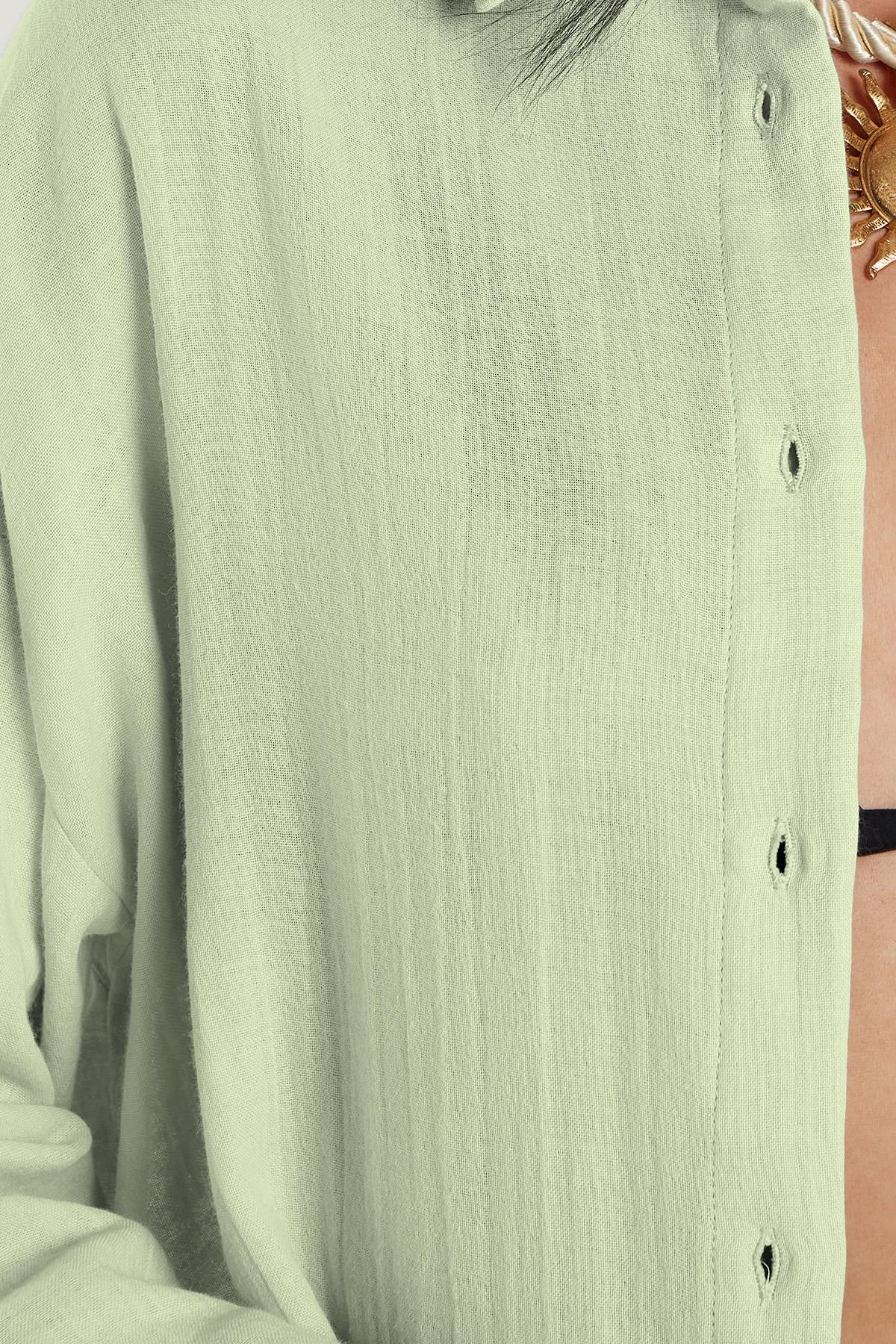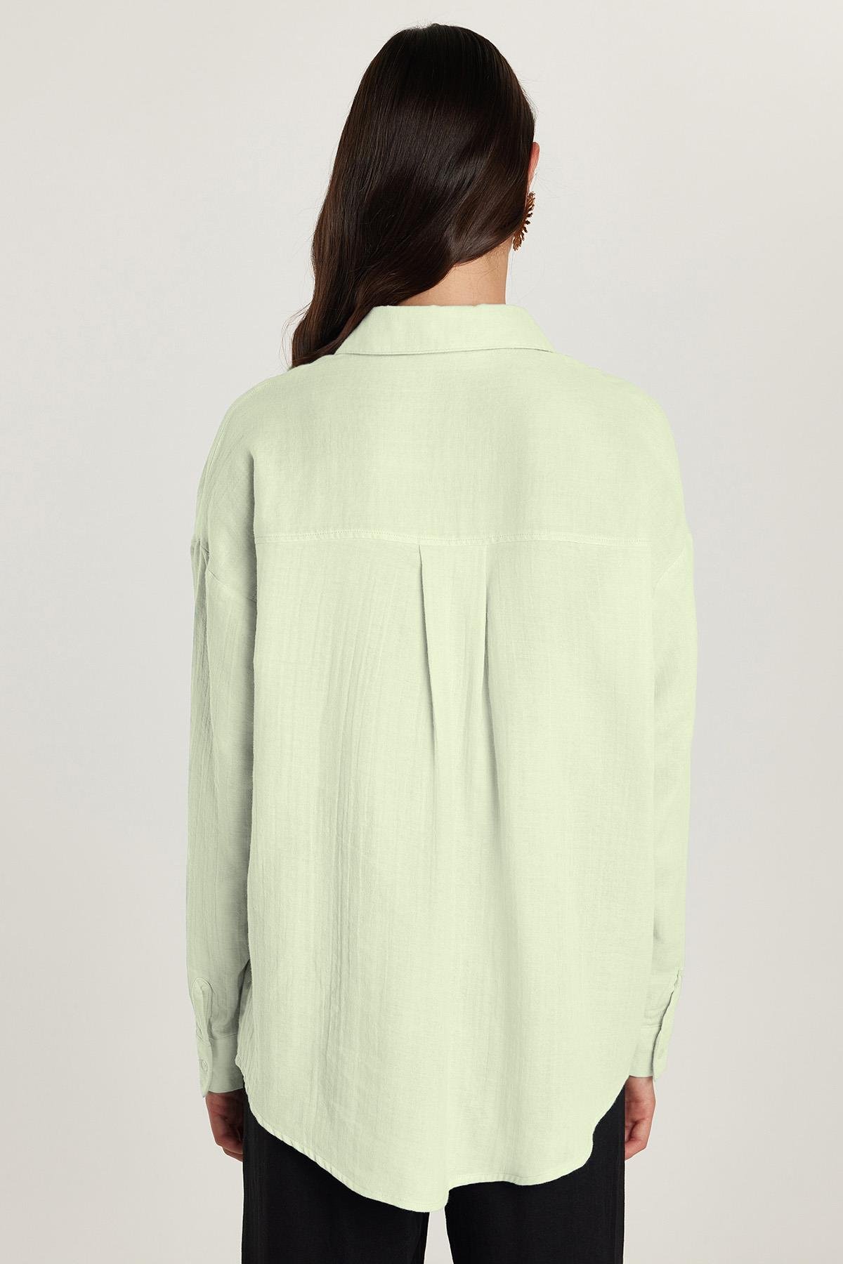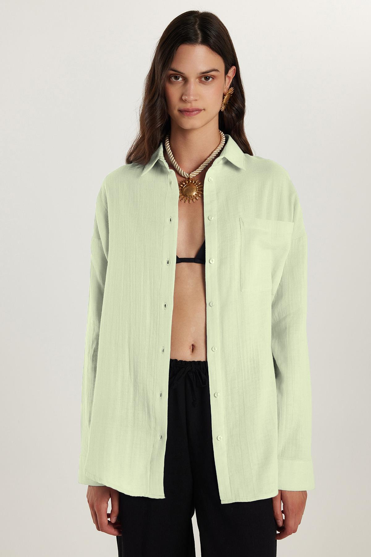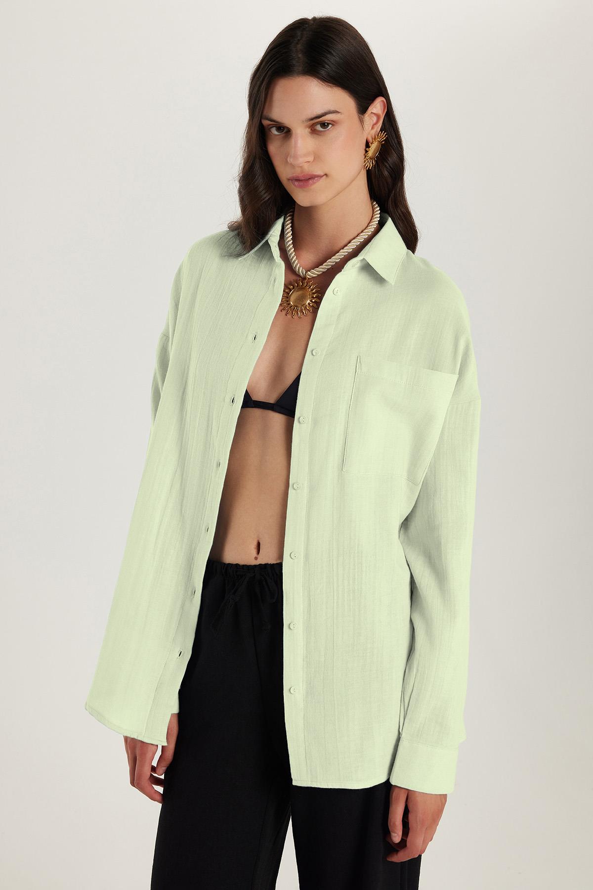 Kadın Oversize Geniş Kesim %100 Pamuk Müslin Kumaş Uzun Kollu Cepli Dokulu Açık Mint Gömlek (BYGM2551-SG61)