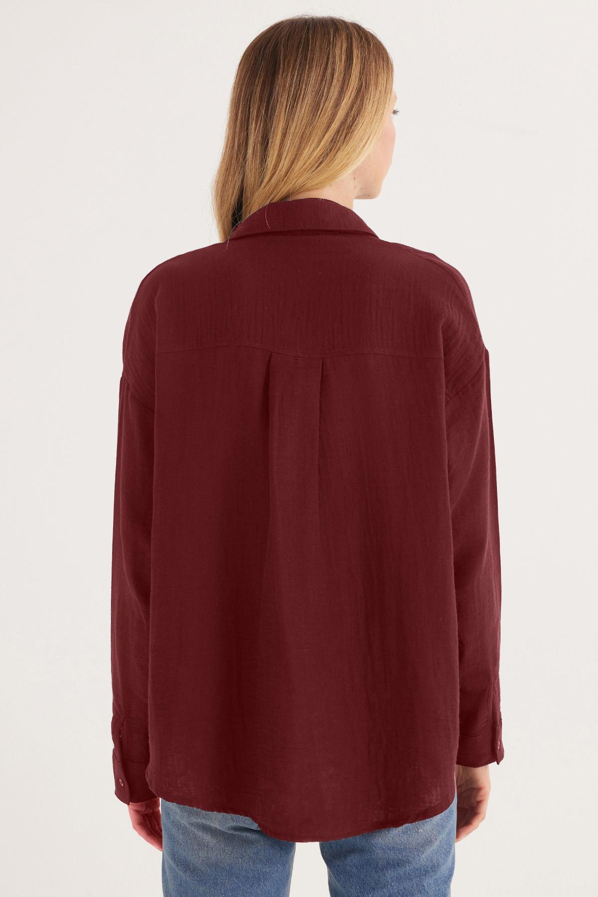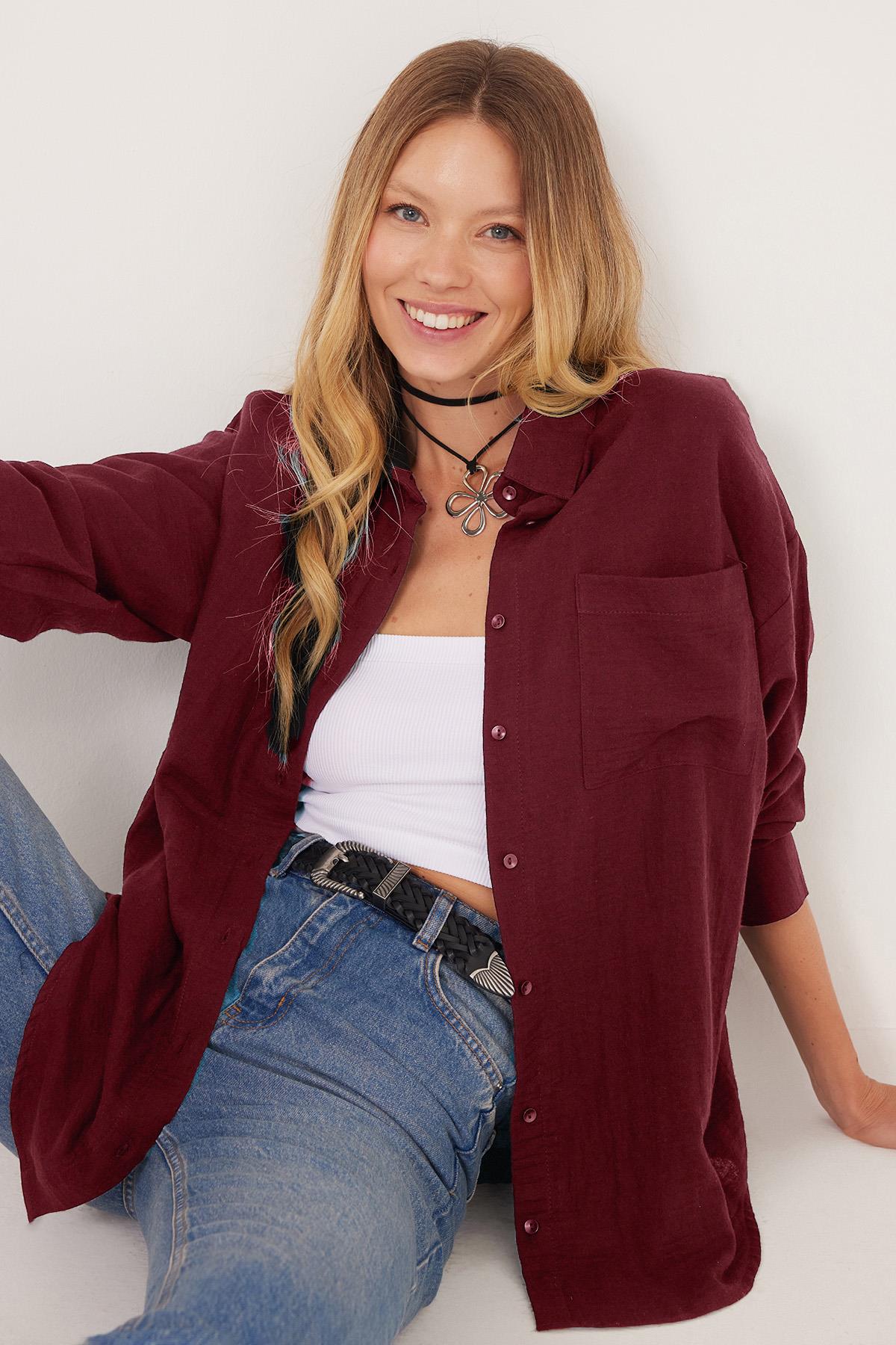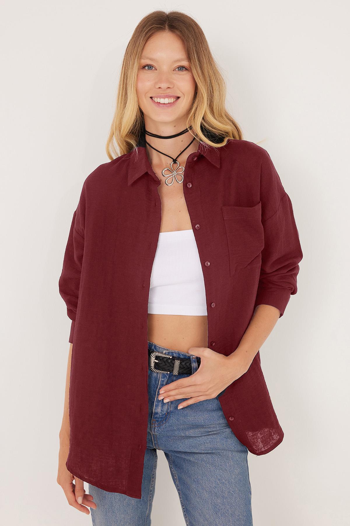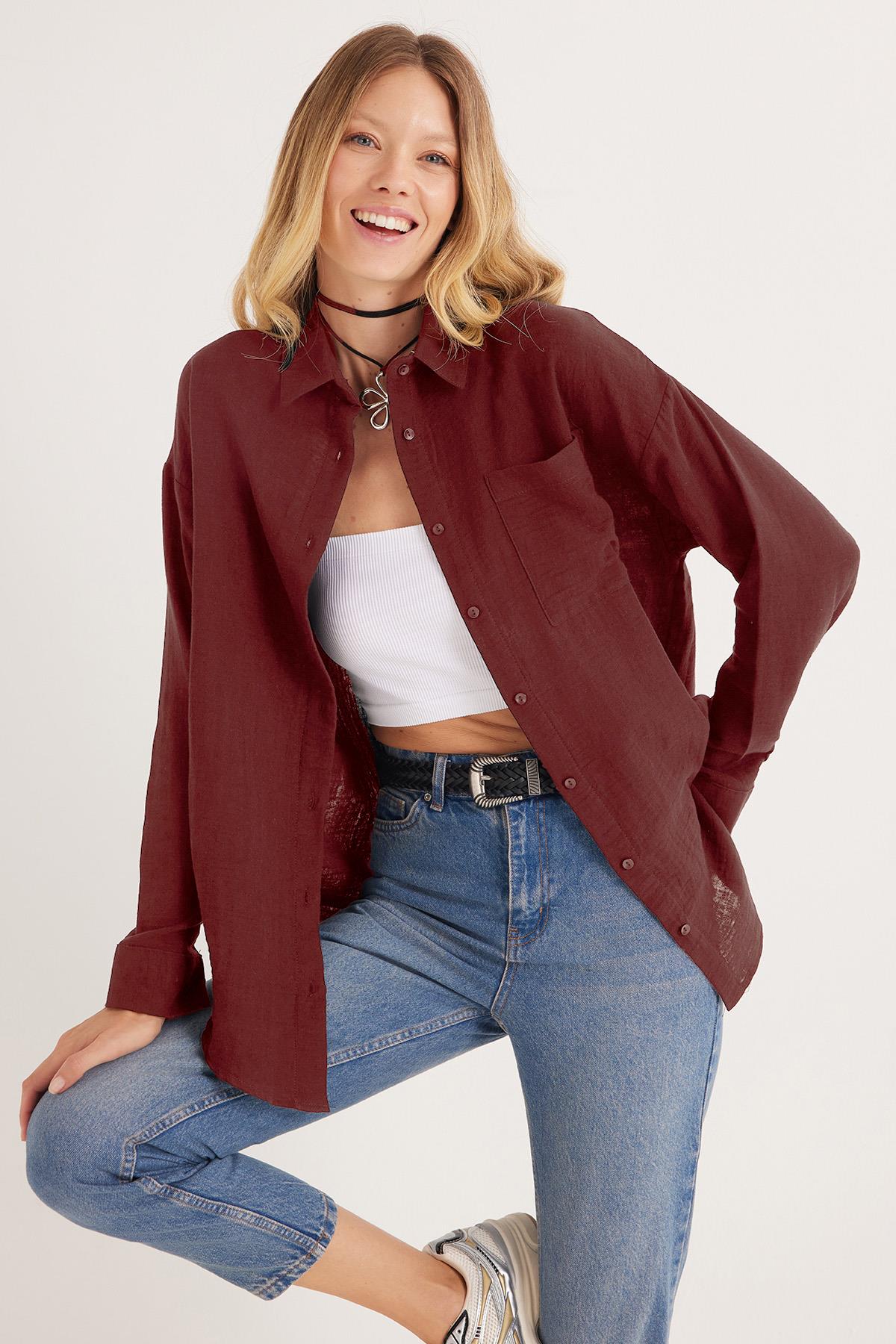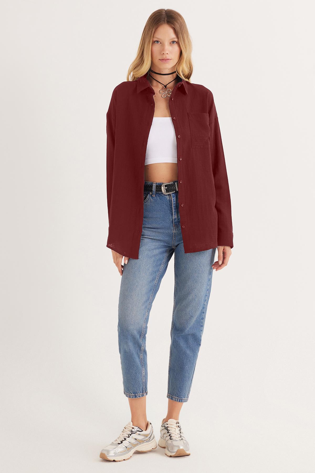 Kadın Oversize Geniş Kesim %100 Pamuk Müslin Kumaş Uzun Kollu Cepli Dokulu Bordo Gömlek (BYGM2551-08)
