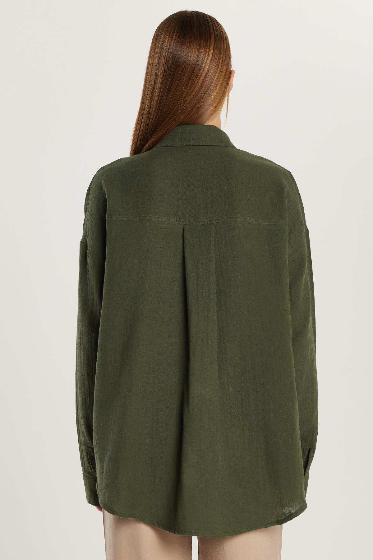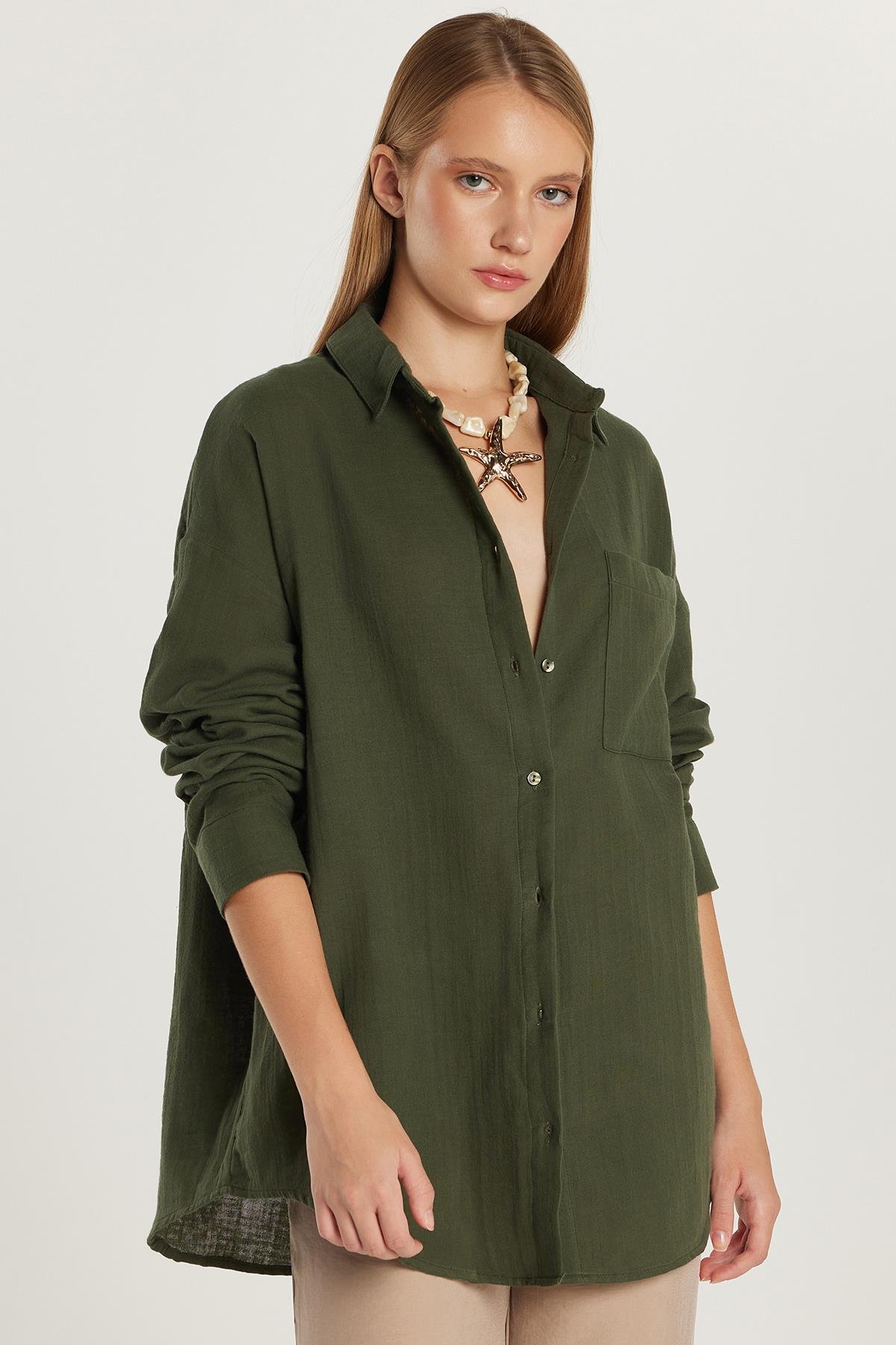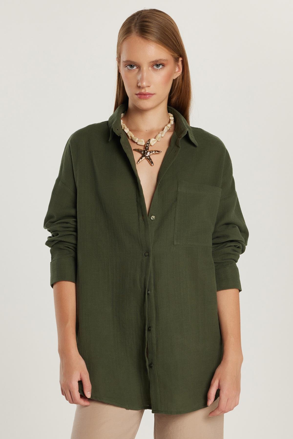 Kadın Oversize Geniş Kesim %100 Pamuk Müslin Kumaş Uzun Kollu Cepli Dokulu Haki Gömlek (BYGM2551-48)