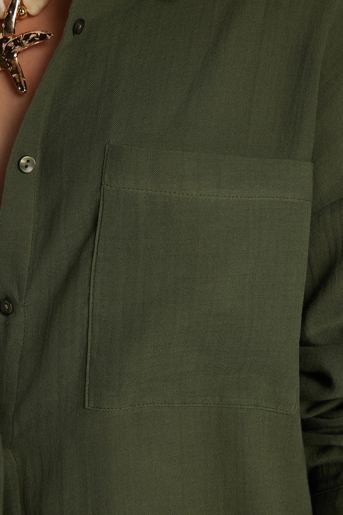 Kadın Oversize Geniş Kesim %100 Pamuk Müslin Kumaş Uzun Kollu Cepli Dokulu Haki Gömlek