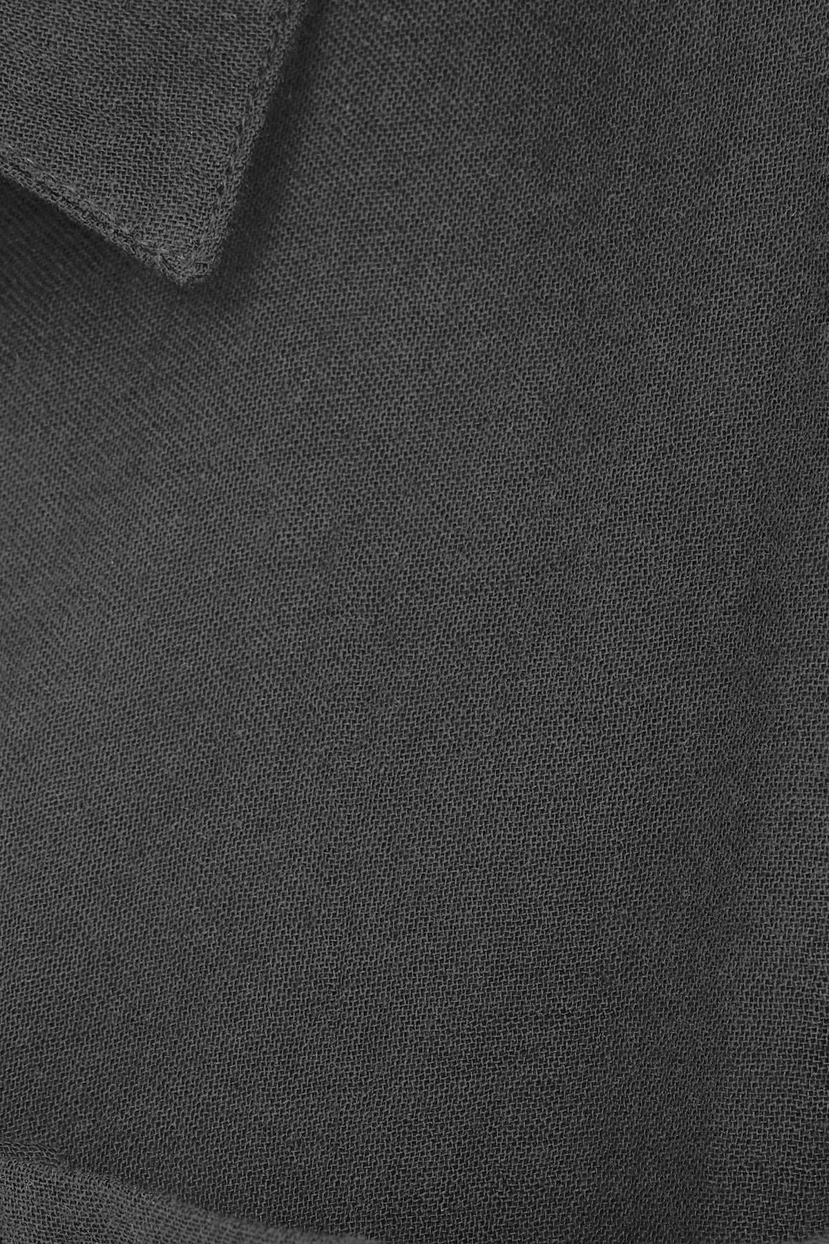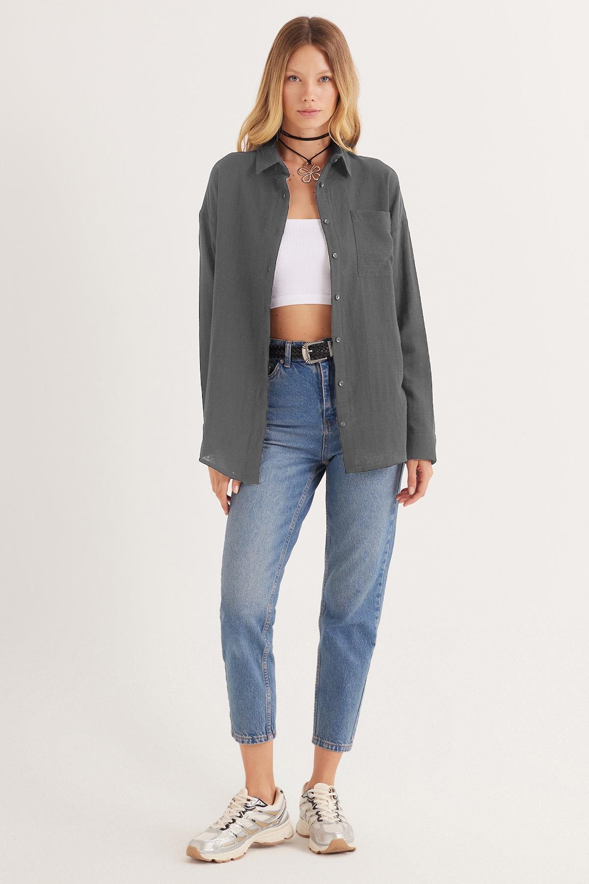 Kadın Oversize Geniş Kesim %100 Pamuk Müslin Kumaş Uzun Kollu Cepli Dokulu Koyu Gri Gömlek