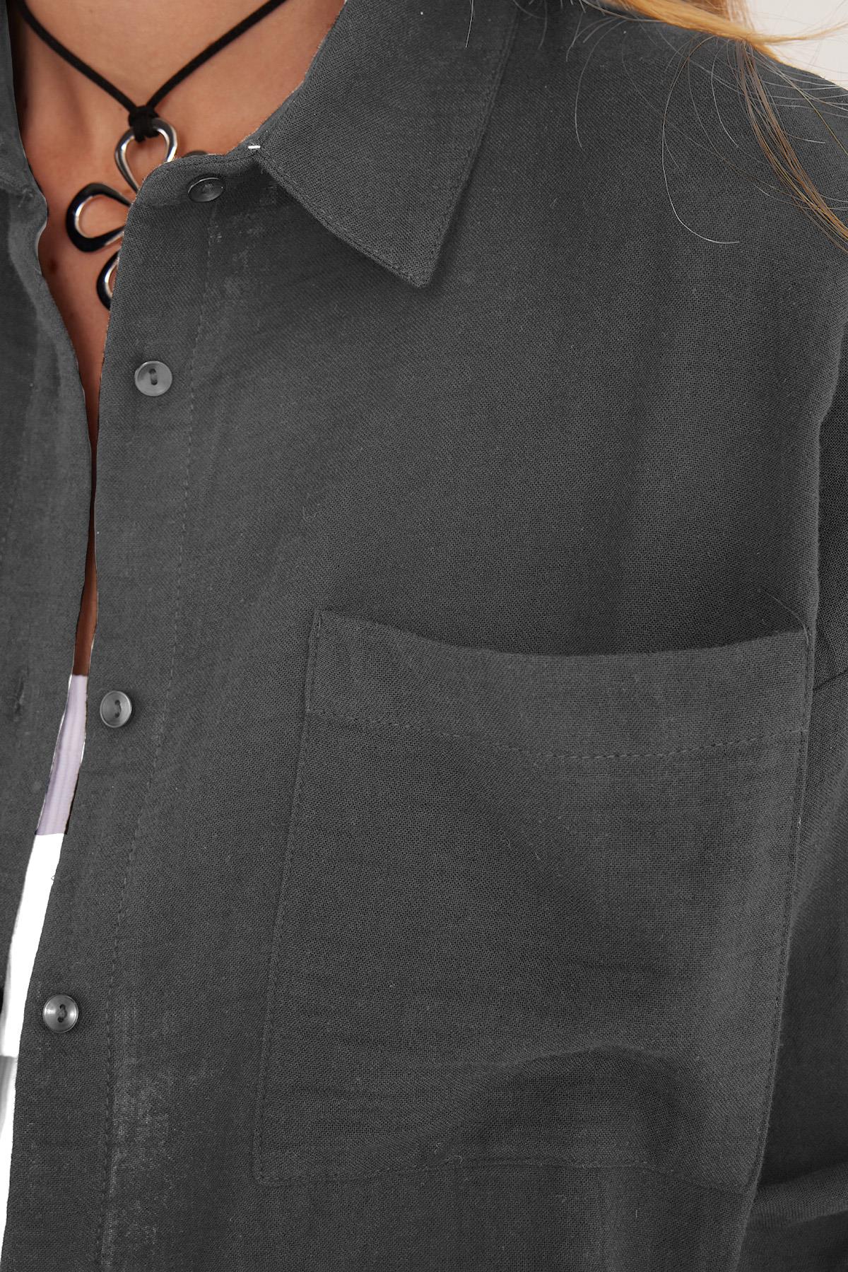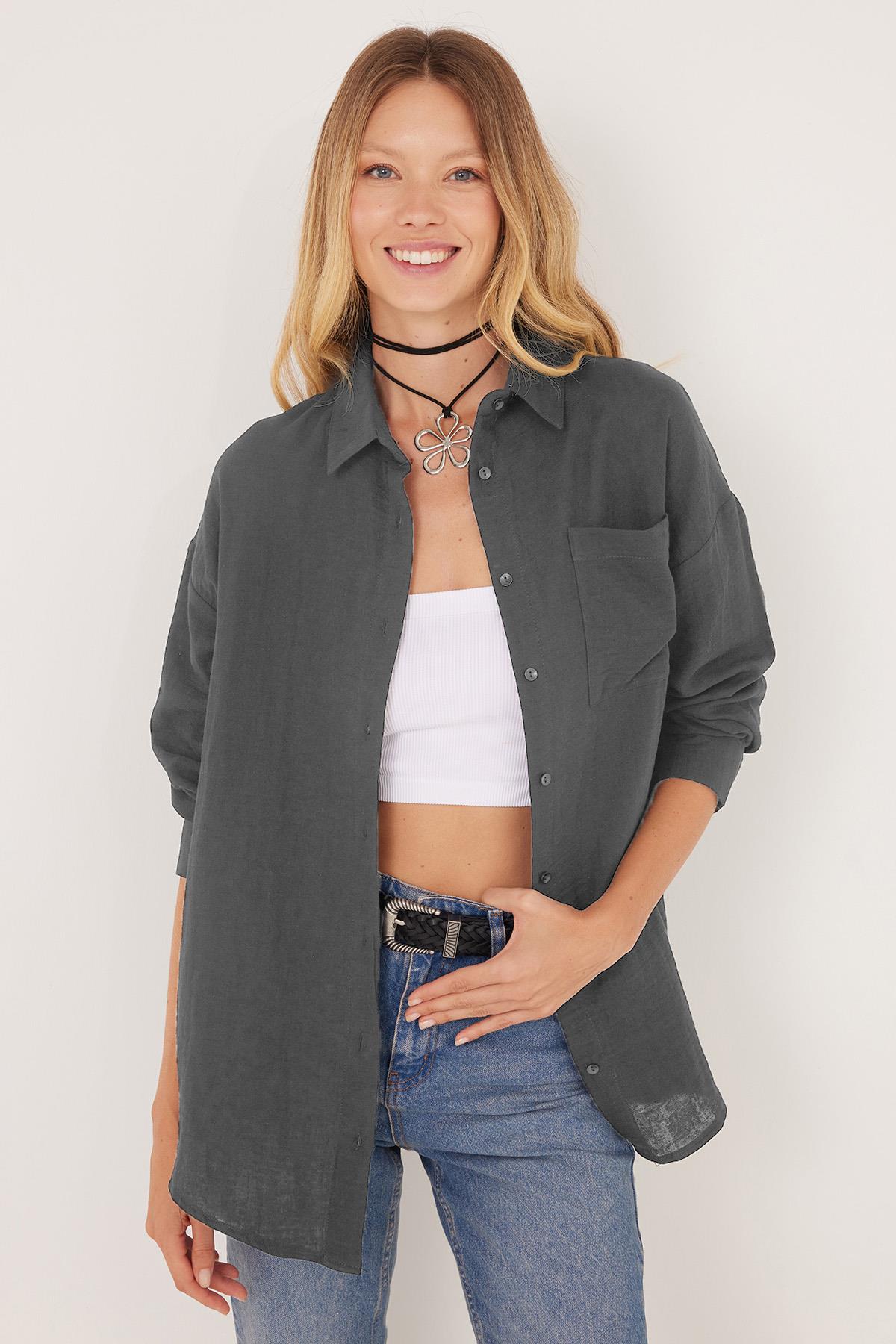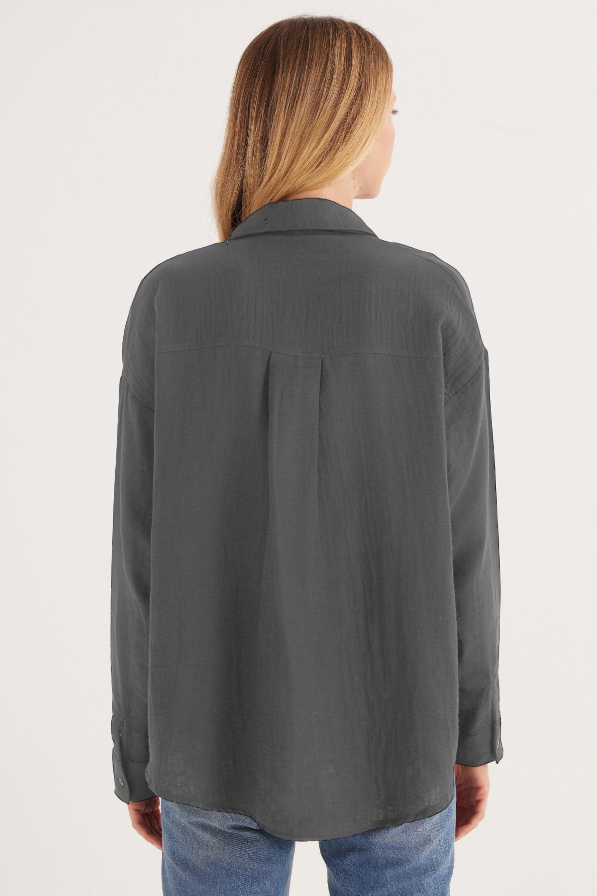 Kadın Oversize Geniş Kesim %100 Pamuk Müslin Kumaş Uzun Kollu Cepli Dokulu Koyu Gri Gömlek (BYGM2551-SDP58)