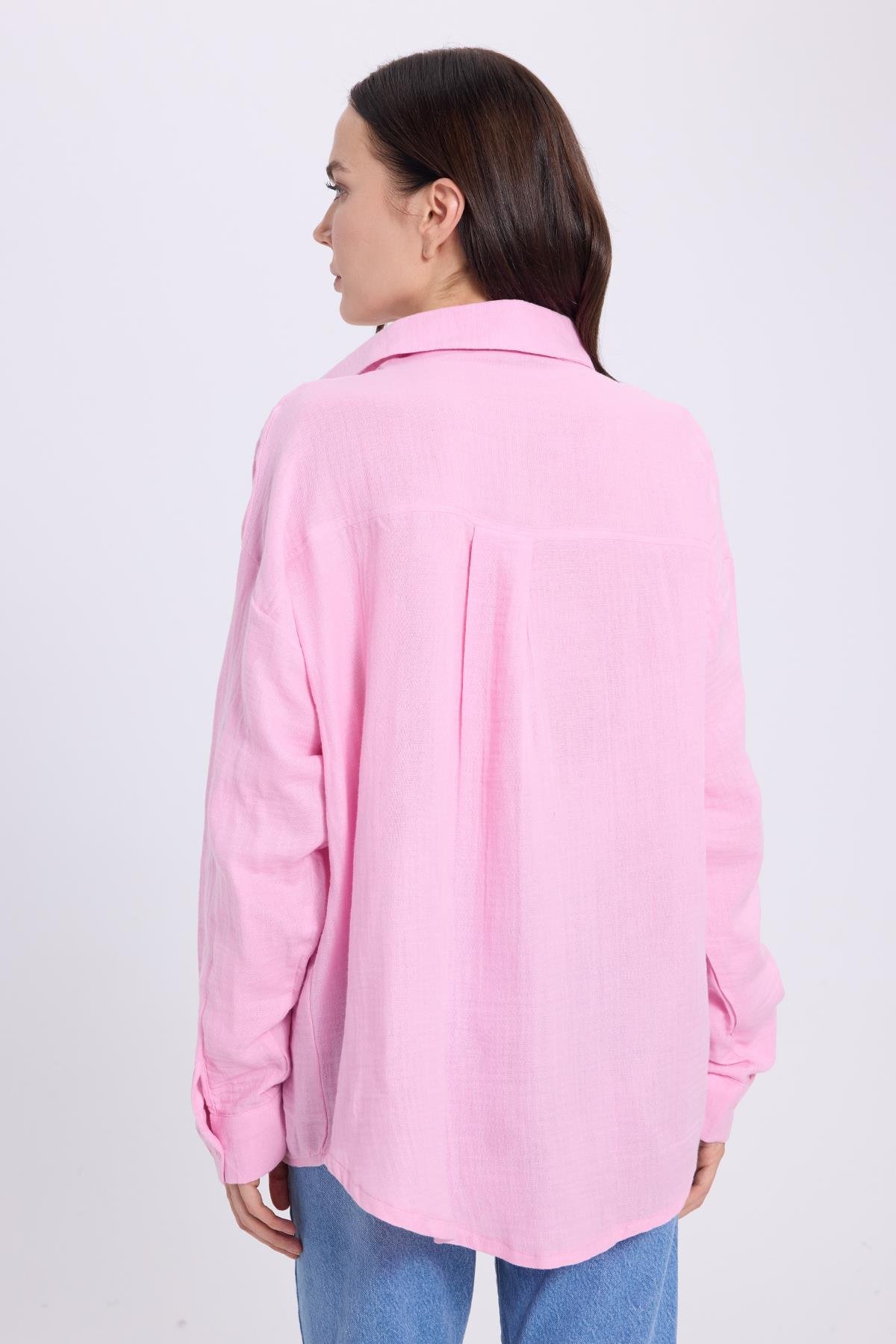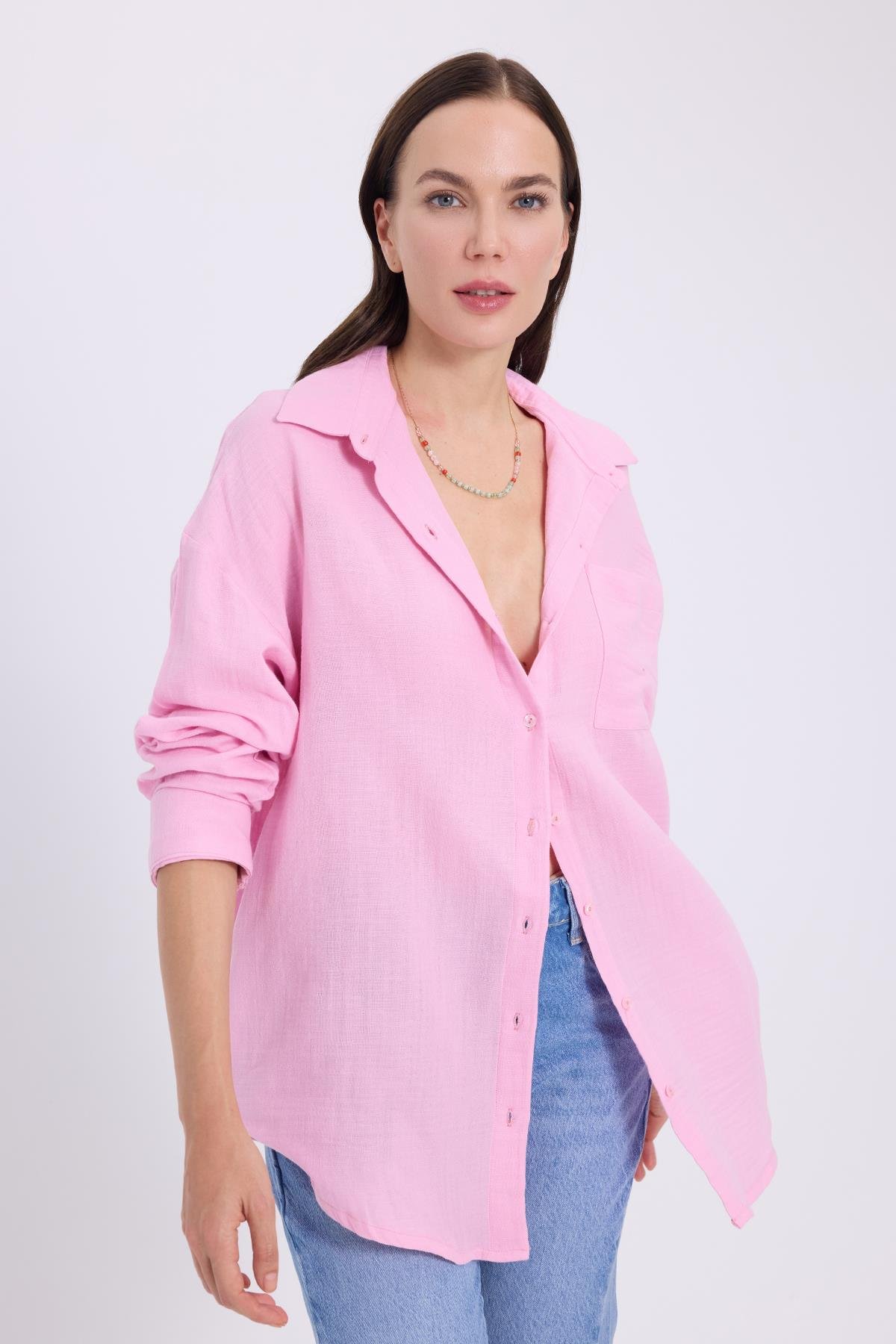 Kadın Oversize Geniş Kesim %100 Pamuk Müslin Kumaş Uzun Kollu Cepli Dokulu Lila Gömlek (BYGM2551-LILAC 2)