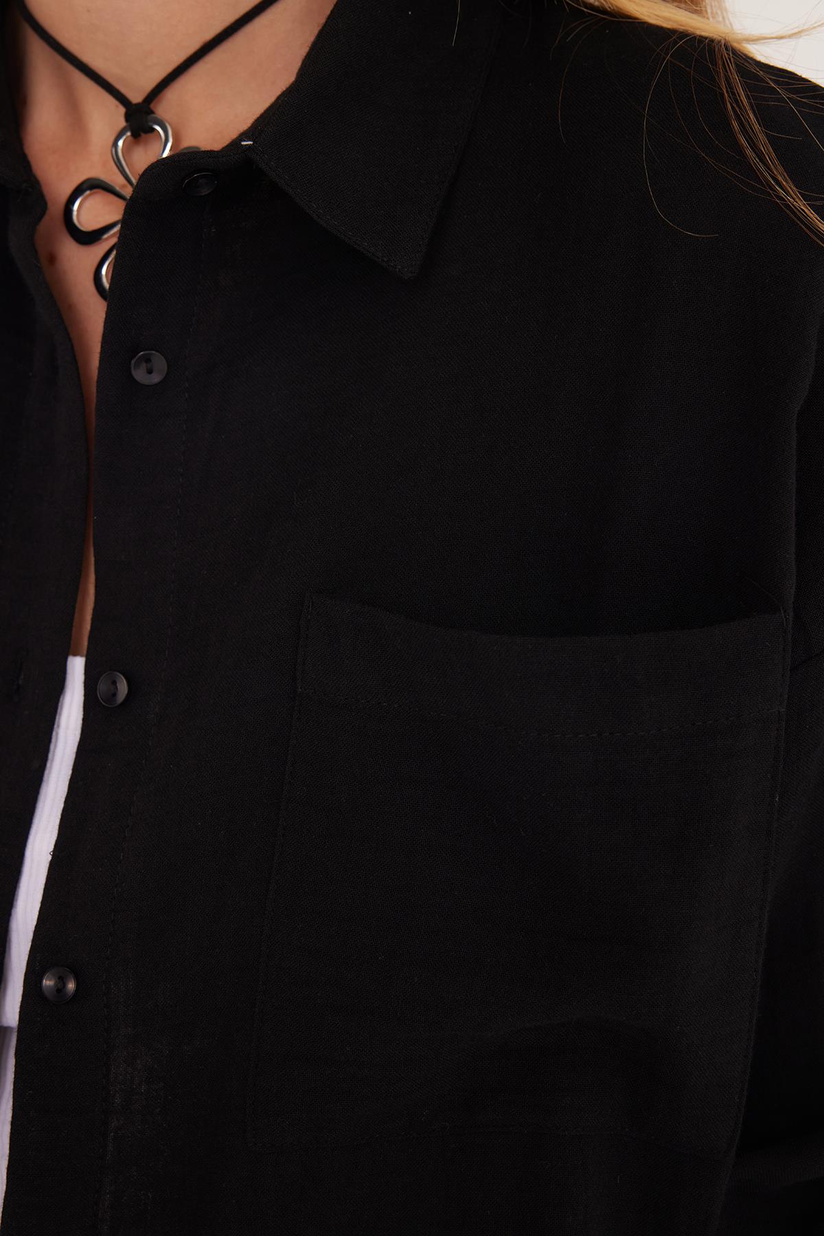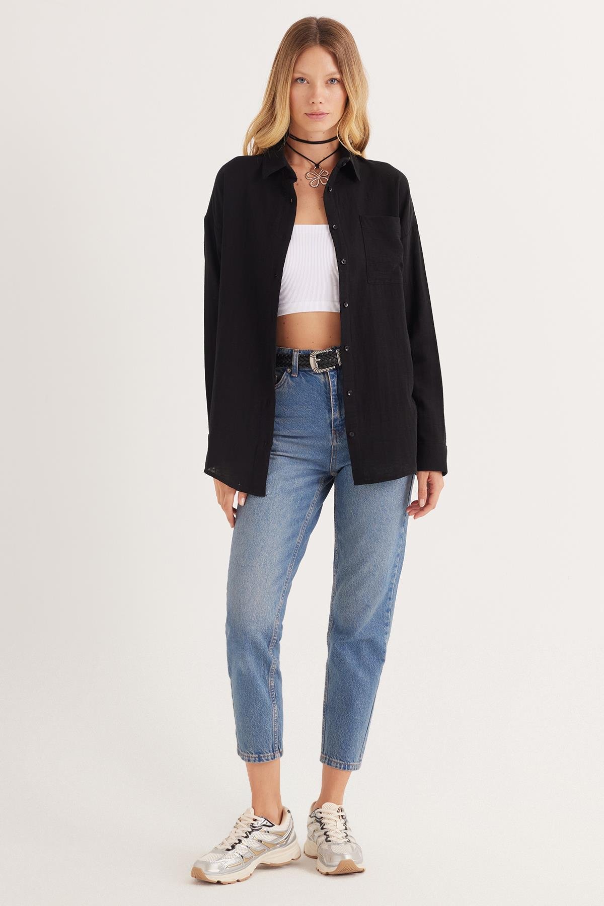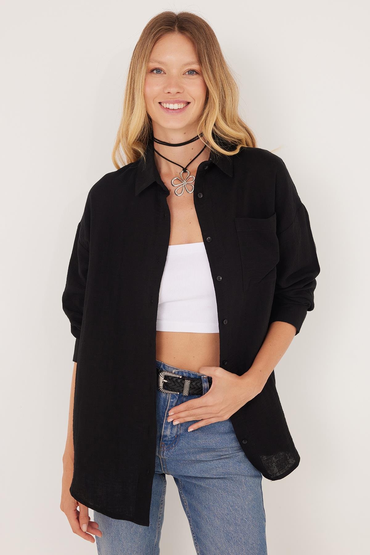 Kadın Oversize Geniş Kesim %100 Pamuk Müslin Kumaş Uzun Kollu Cepli Dokulu Siyah Gömlek (BYGM2551-02)