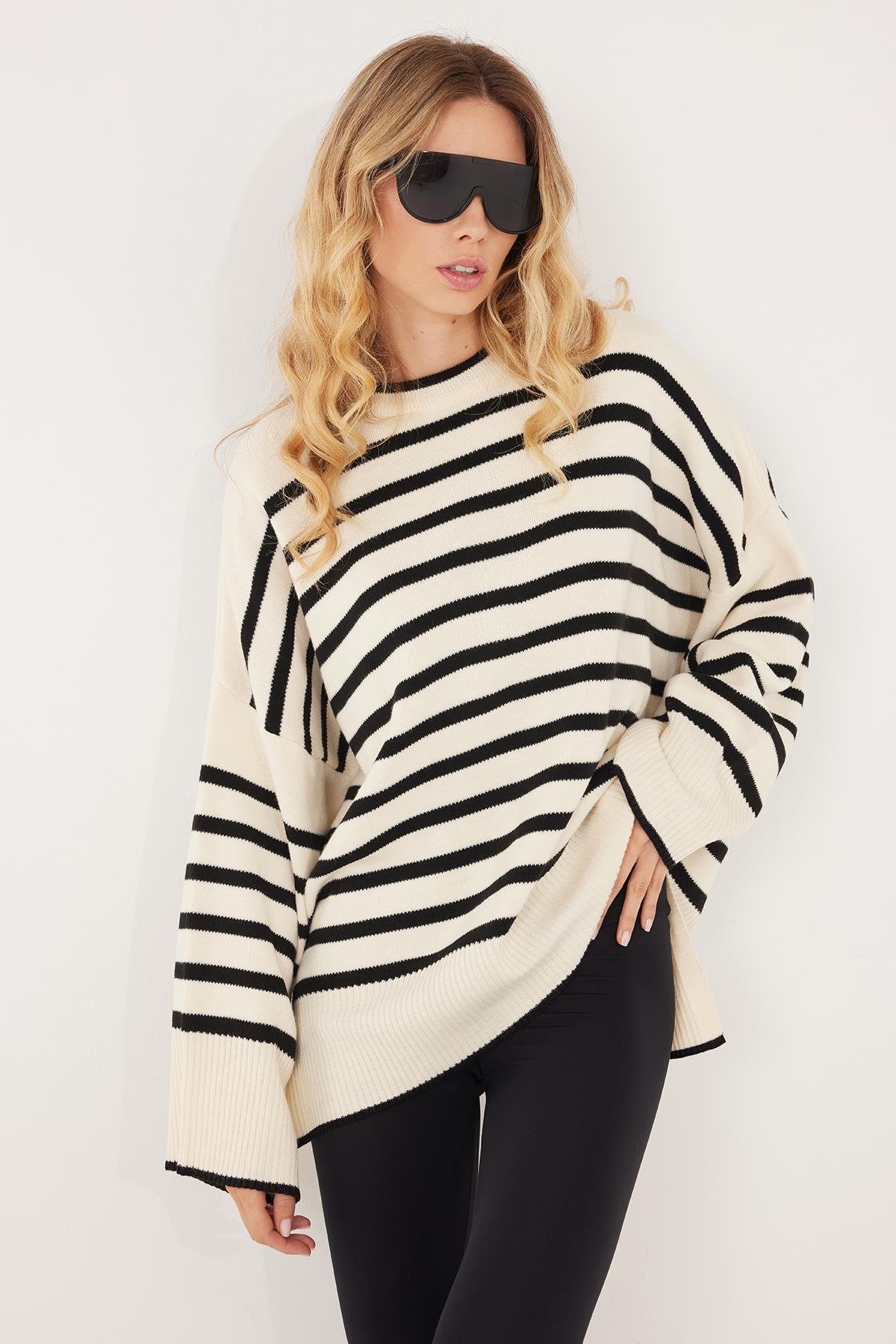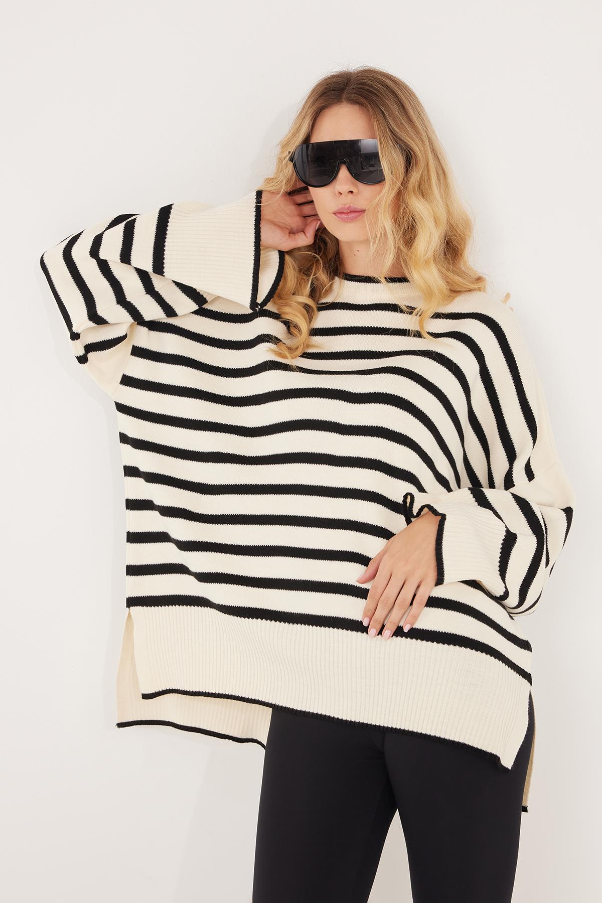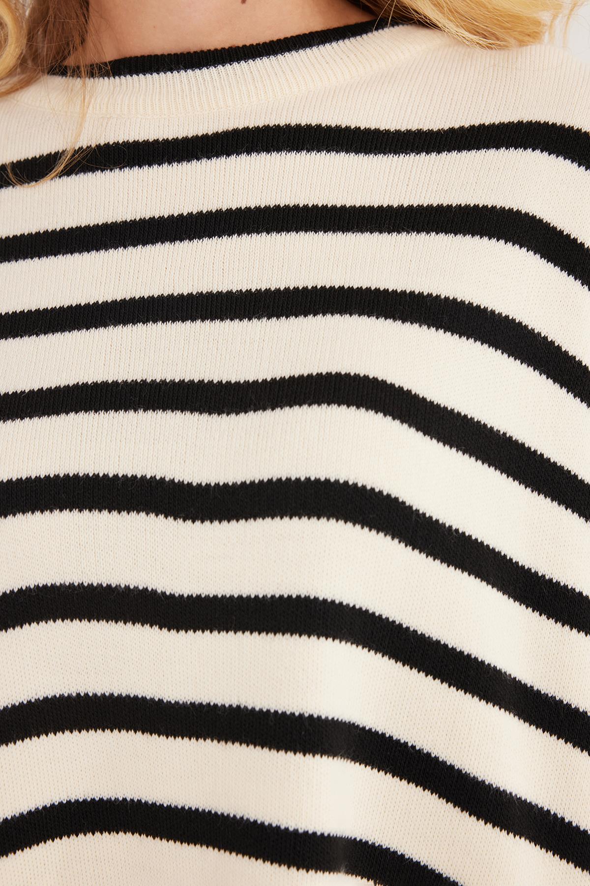 Kadın Oversize Geniş Kesim Bisiklet Yaka Çizgili Beyaz Kazak (BYKZ2514-01)