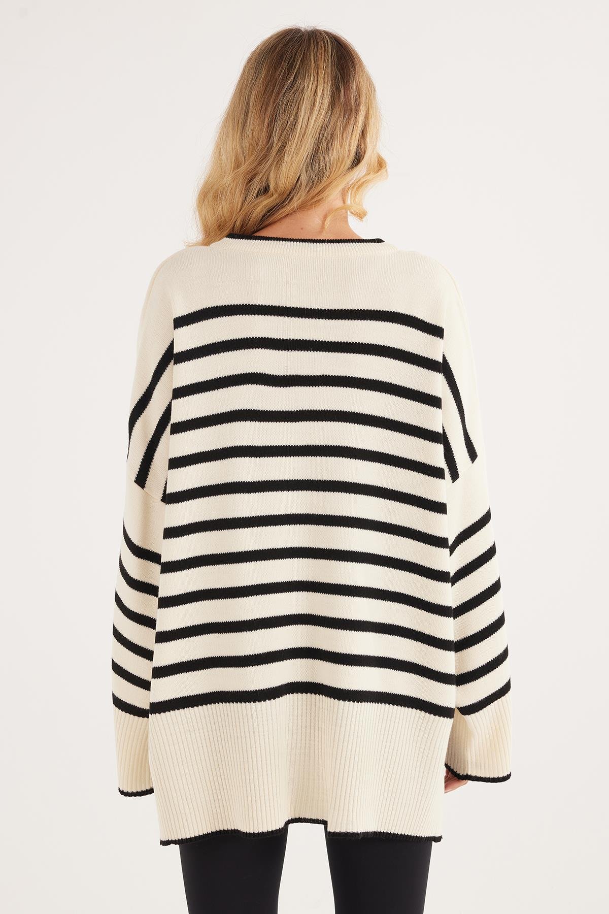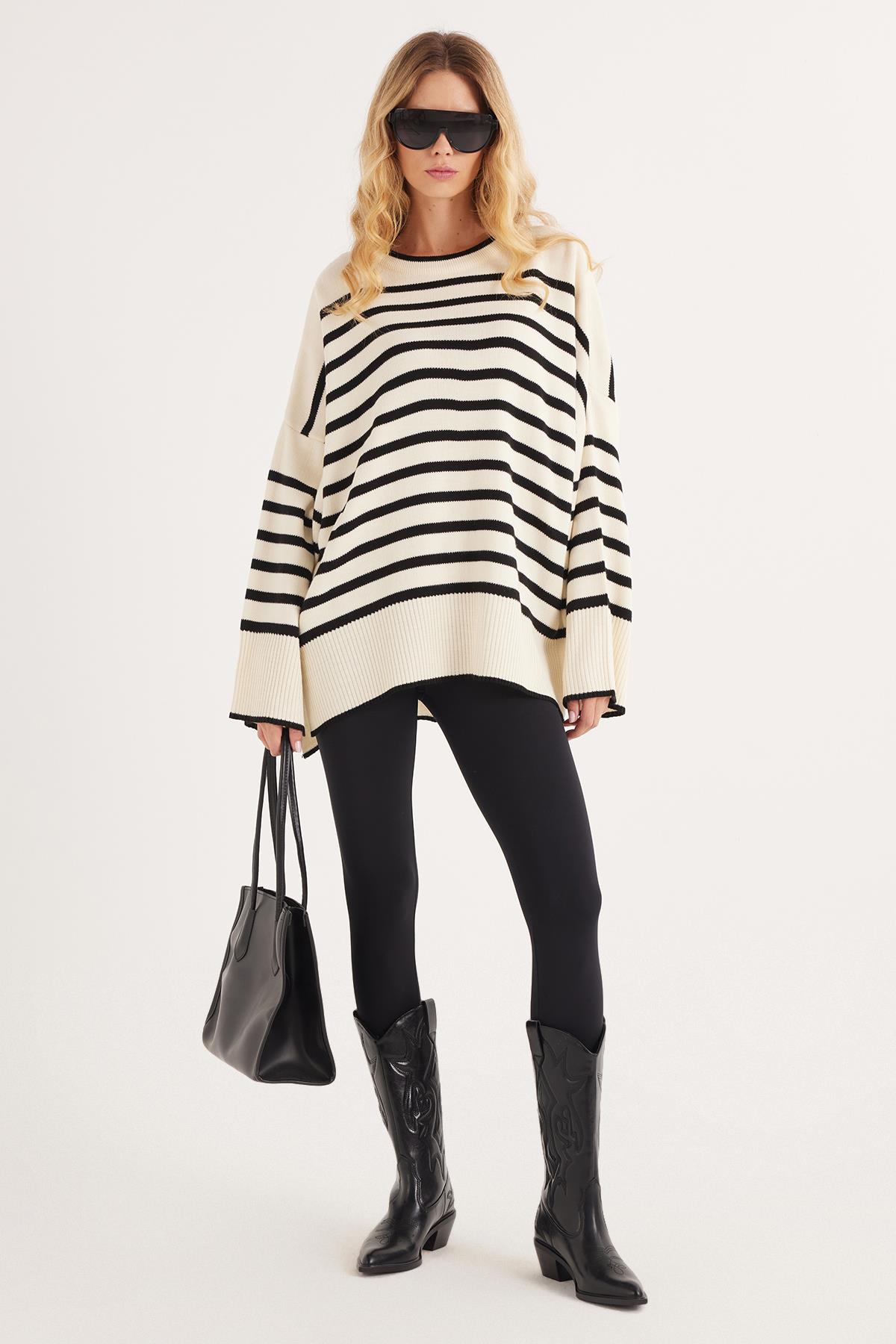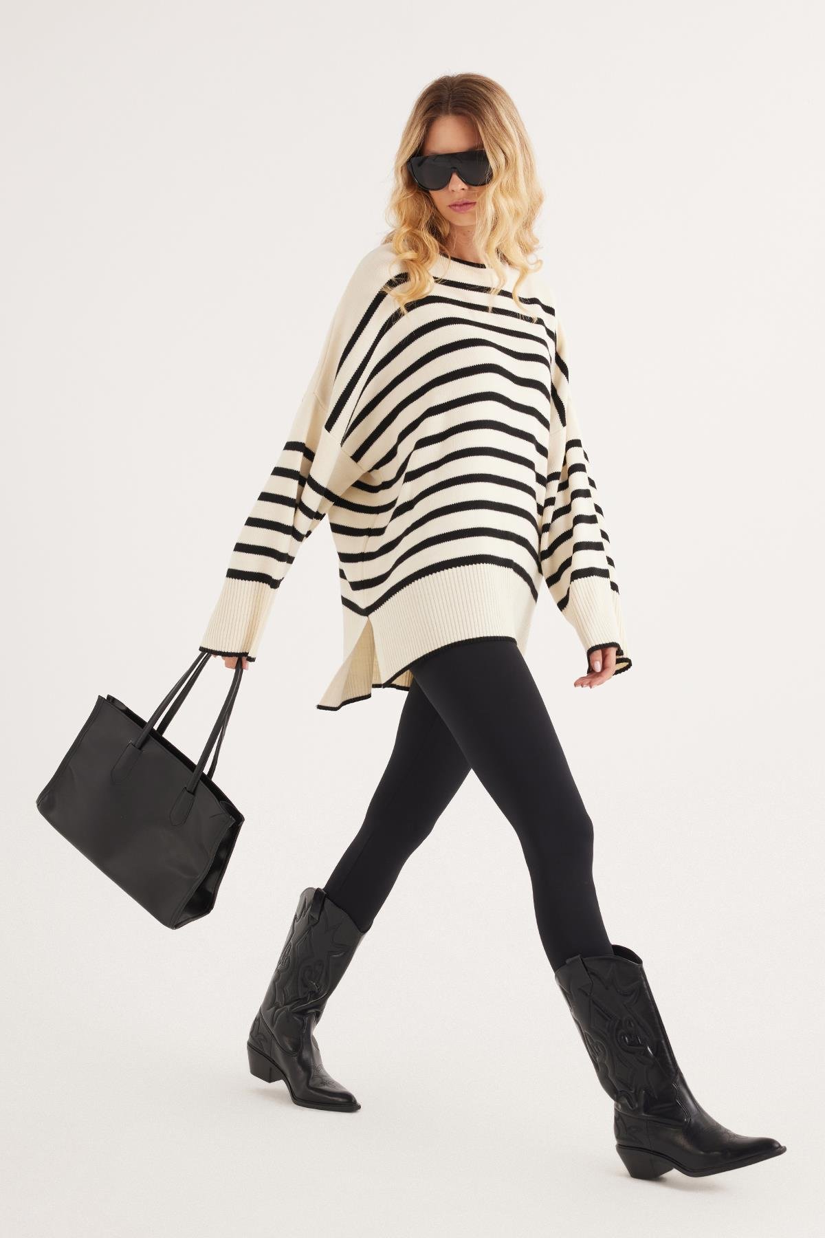 Kadın Oversize Geniş Kesim Bisiklet Yaka Çizgili Beyaz Kazak (BYKZ2514-01)