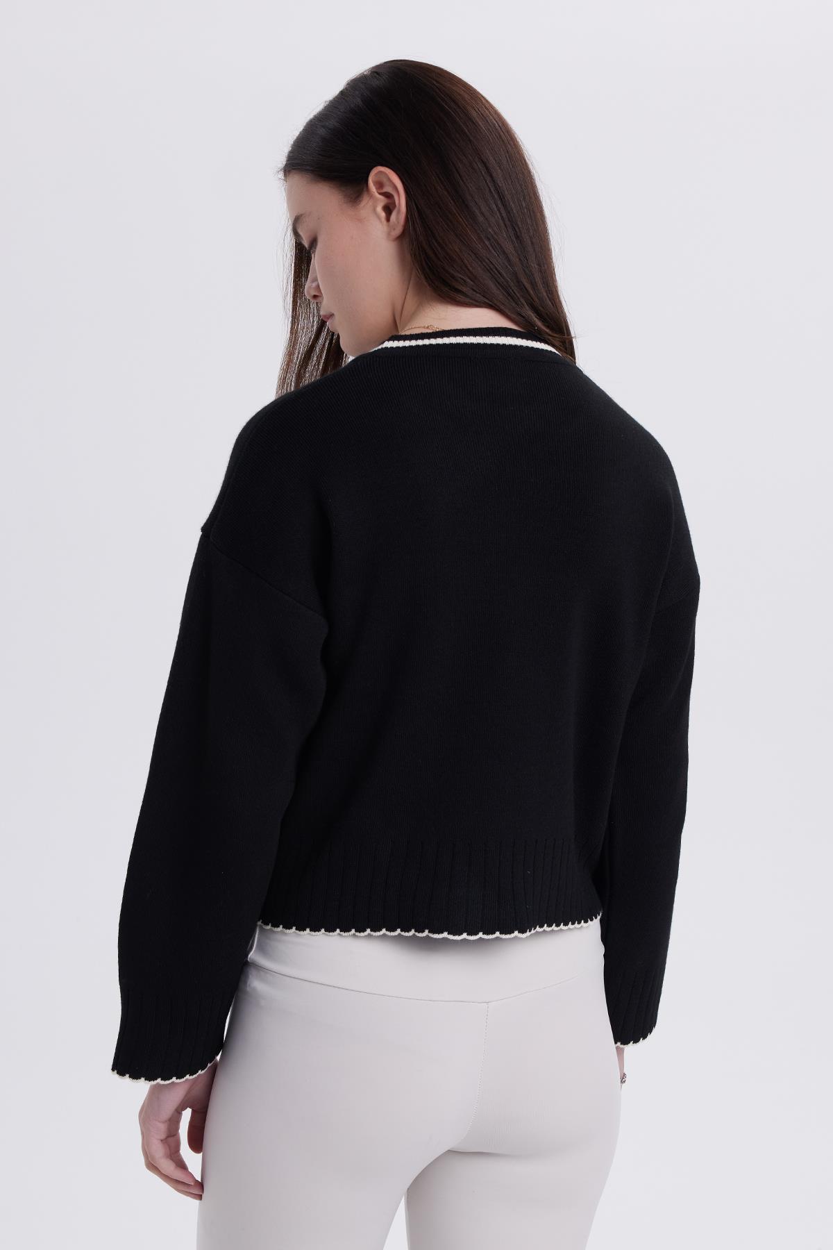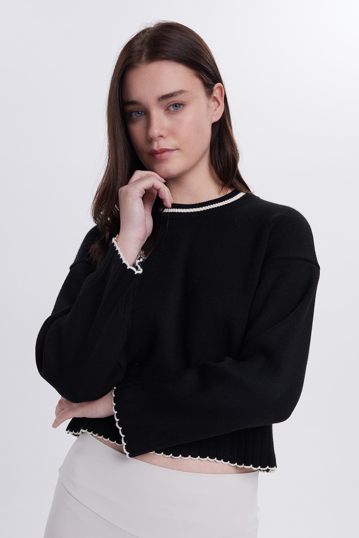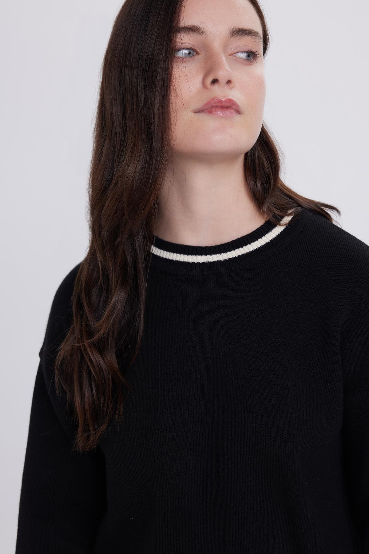 Kadın Oversize Geniş Kesim Bisiklet Yaka Çizgili Siyah Kazak (BYKZ2533-02)