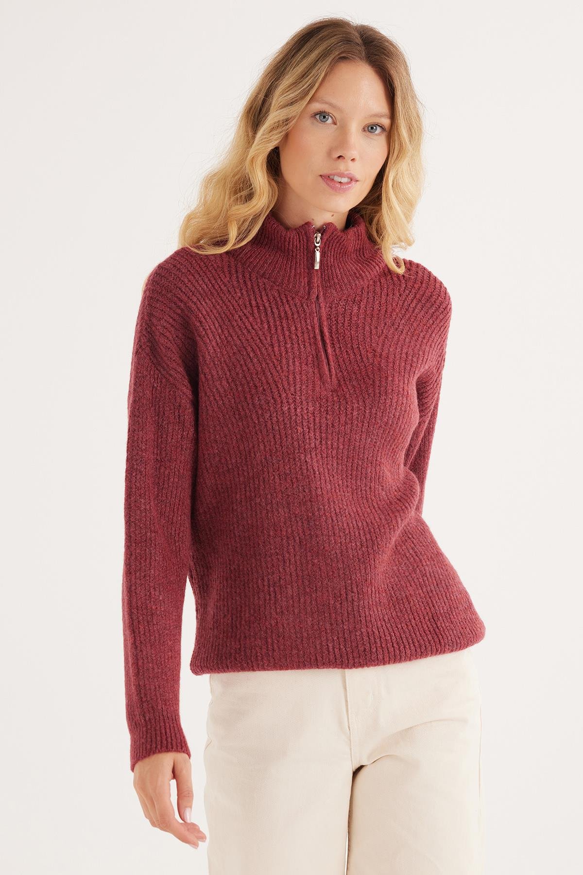 Kadın Oversize Geniş Kesim Dokumalı Fermuarlı Yaka Gül Kurusu Kazak