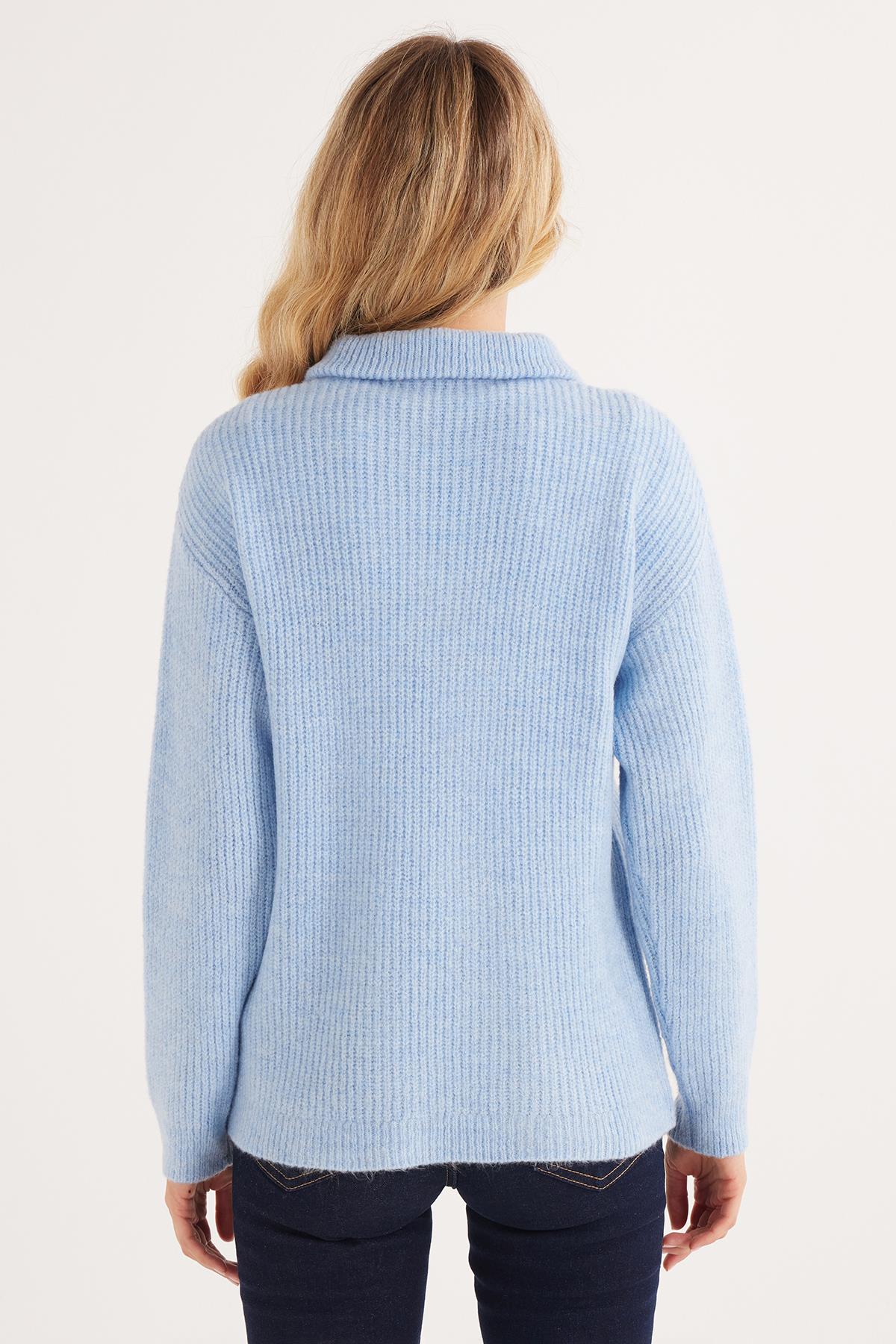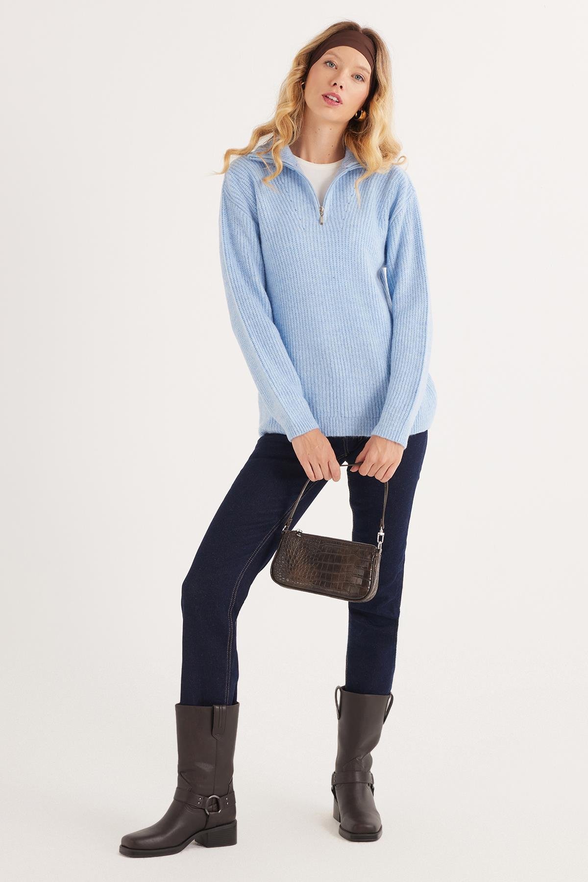 Kadın Oversize Geniş Kesim Dokumalı Fermuarlı Yaka Mavi Kazak