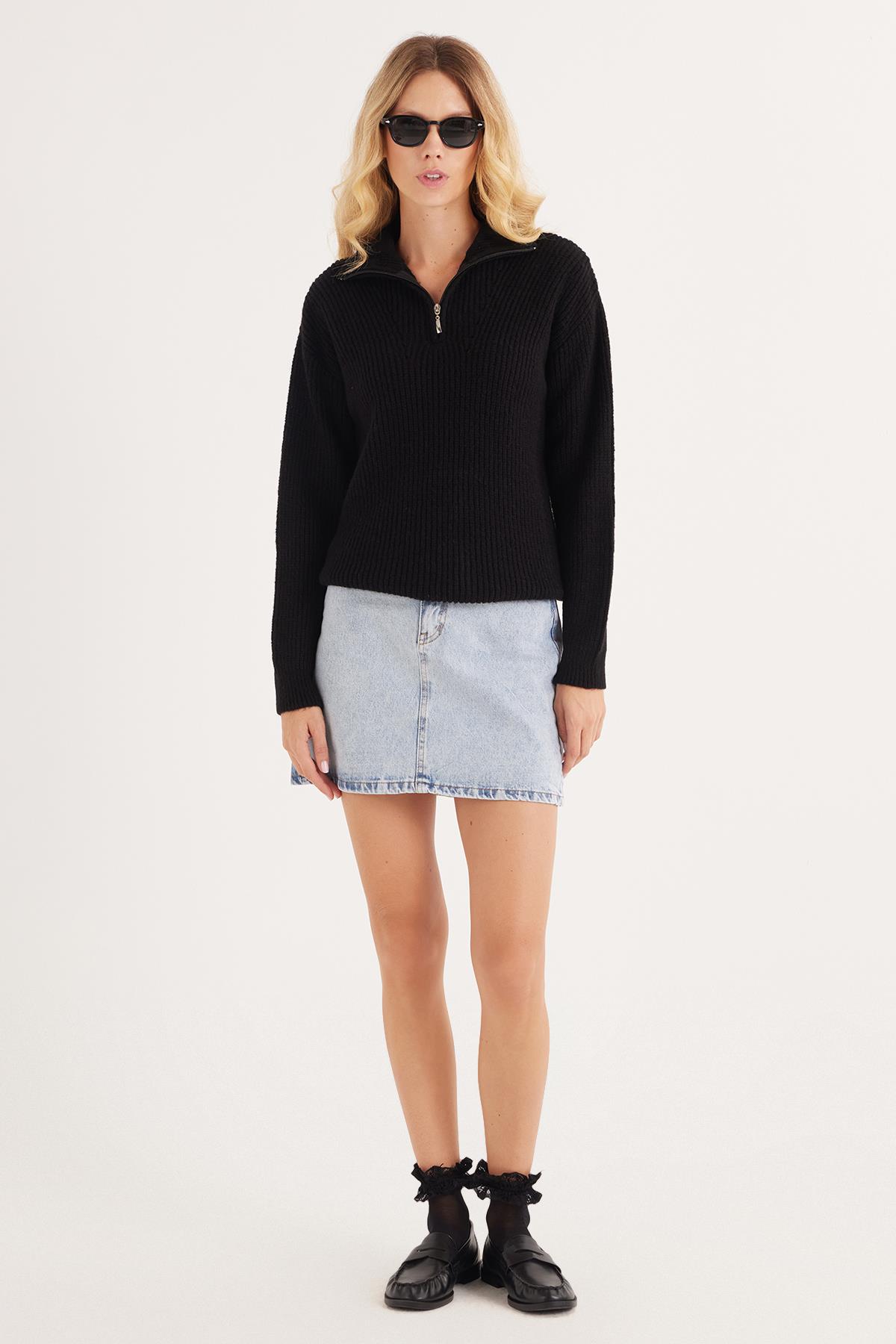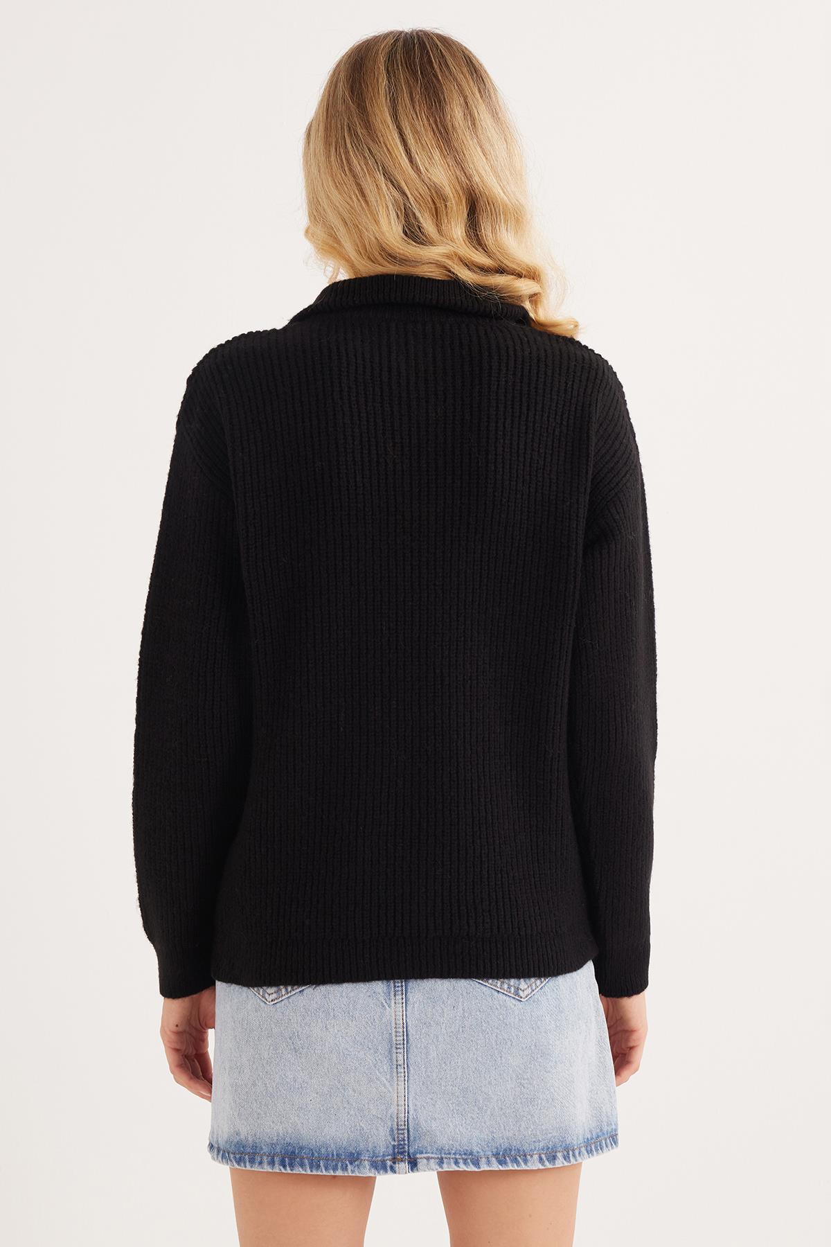 Kadın Oversize Geniş Kesim Dokumalı Fermuarlı Yaka Siyah Kazak